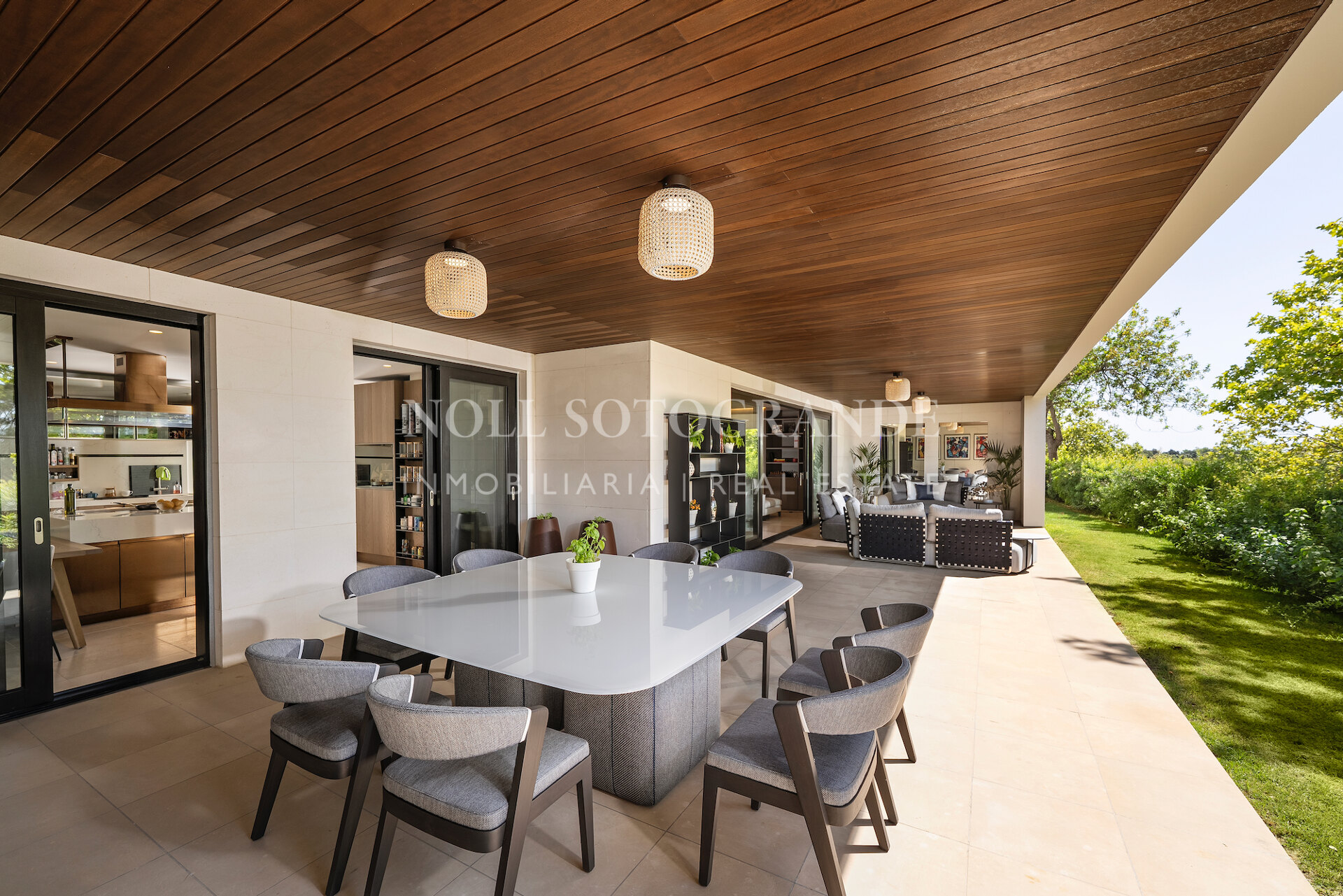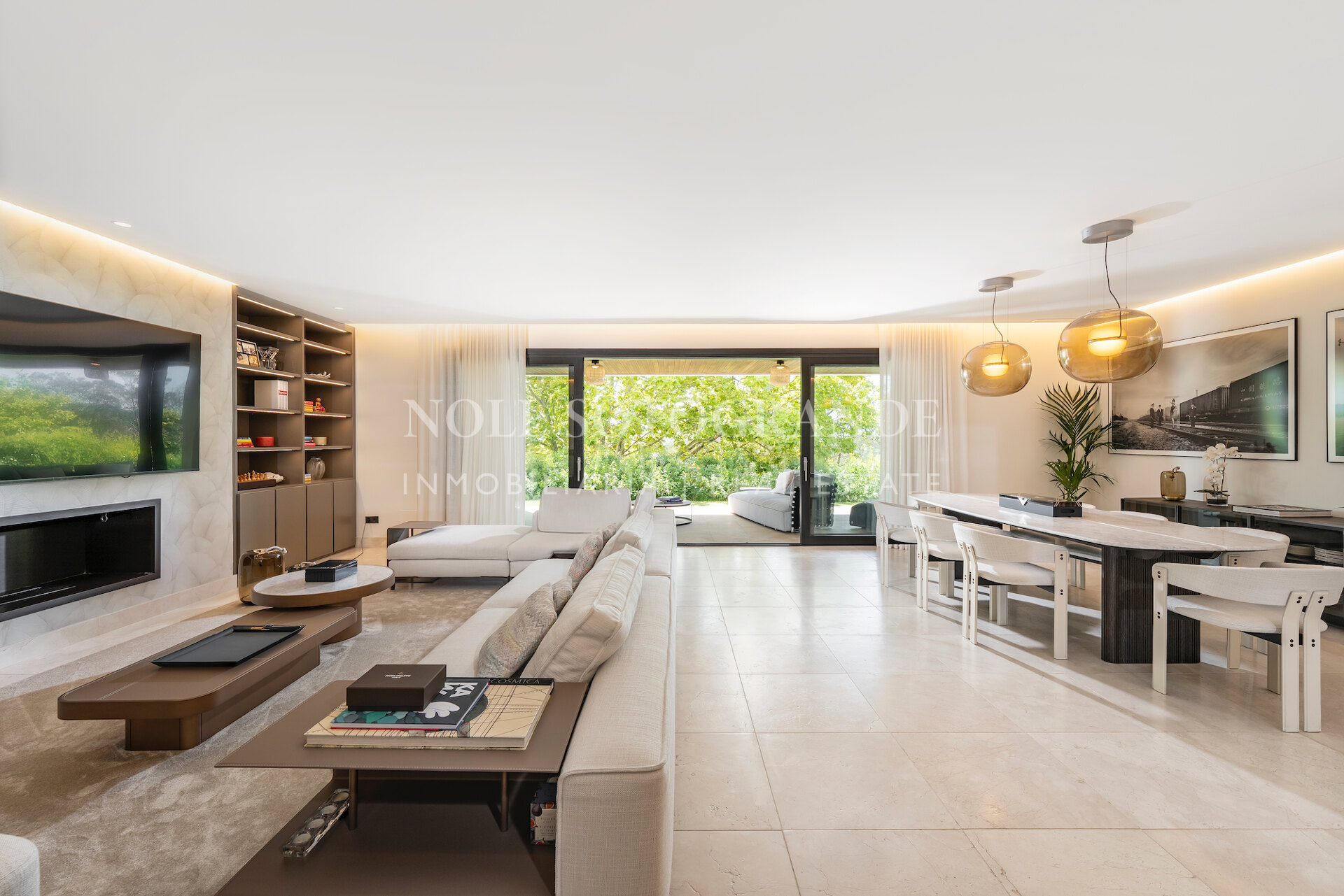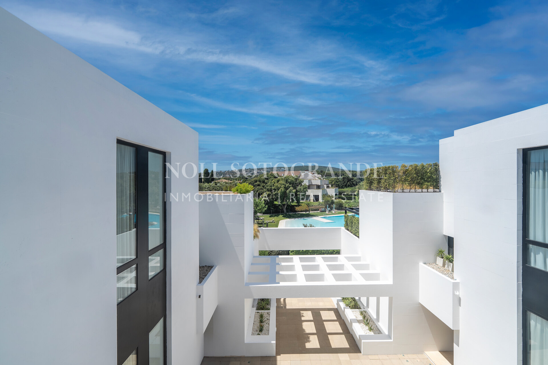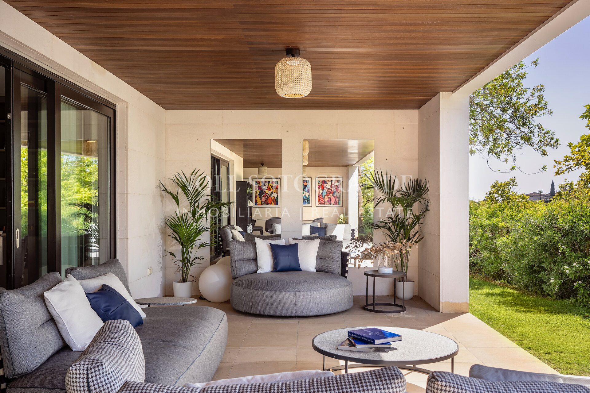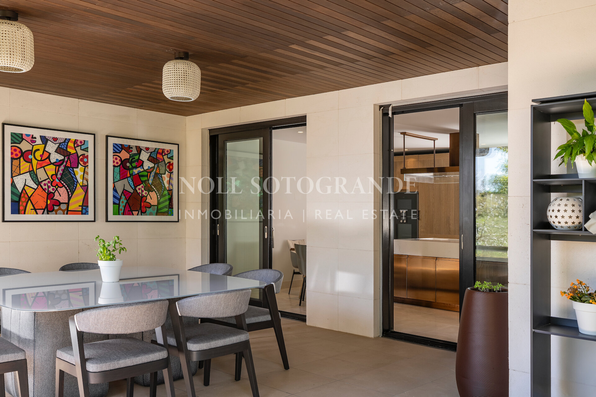 For those who desire a carefree life in a villa without having to worry about maintaining the building, swimming pool, or garden, this “villa apartment” offers pure luxury living. The interior and exterior decoration features the best brands. The ground floor comprises a large, bright living and dining area with access to the covered terrace, an Arclinea kitchen with fossil oak finish designed by Antonio Citterio and Gaggenau appliances, a guest toilet, and a spacious office. On the first floor are three bedroom suites that share a spacious south-facing terrace. Upstairs is the master suite with bathroom, dressing room, and work area, as well as a magnificent private solarium terrace.