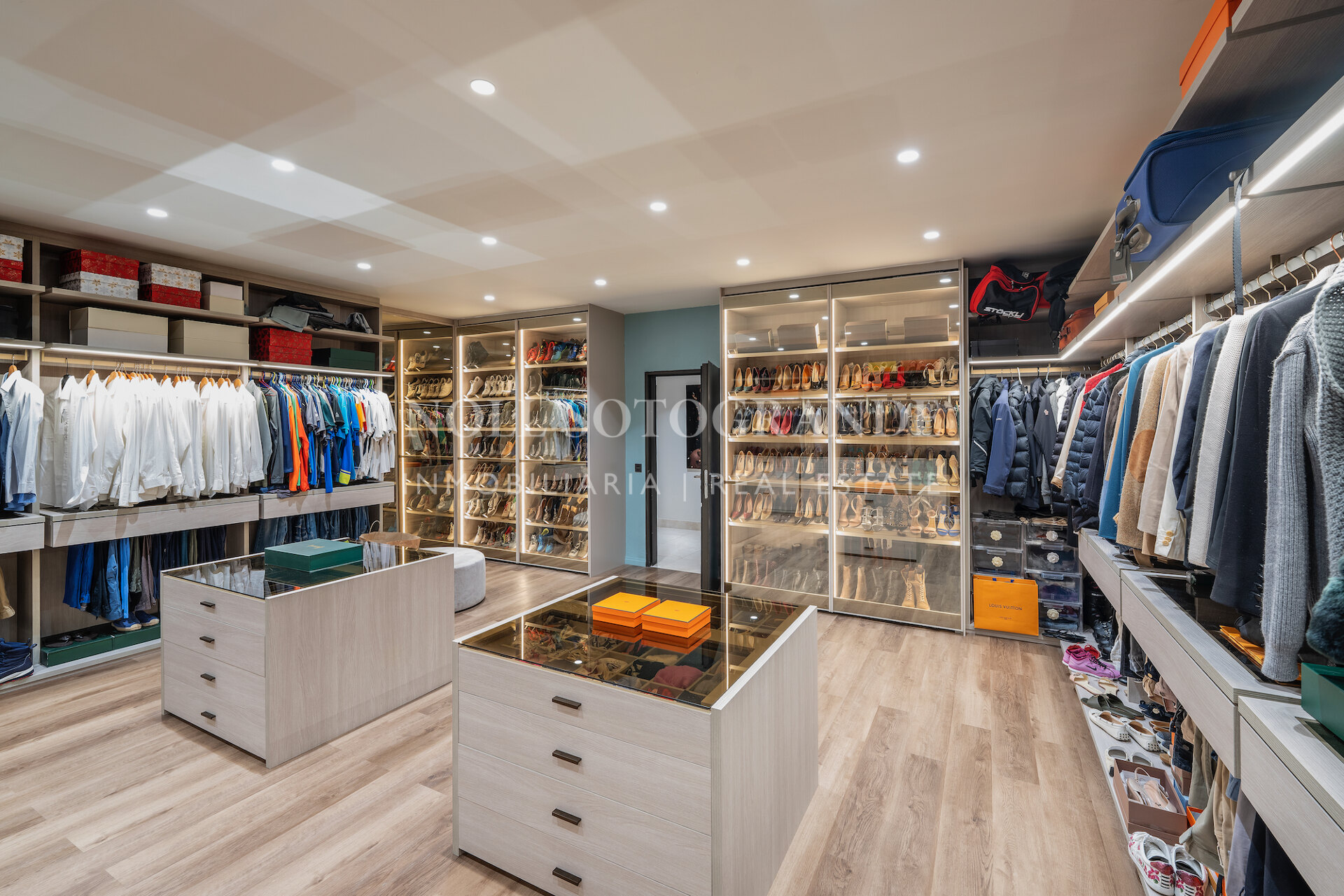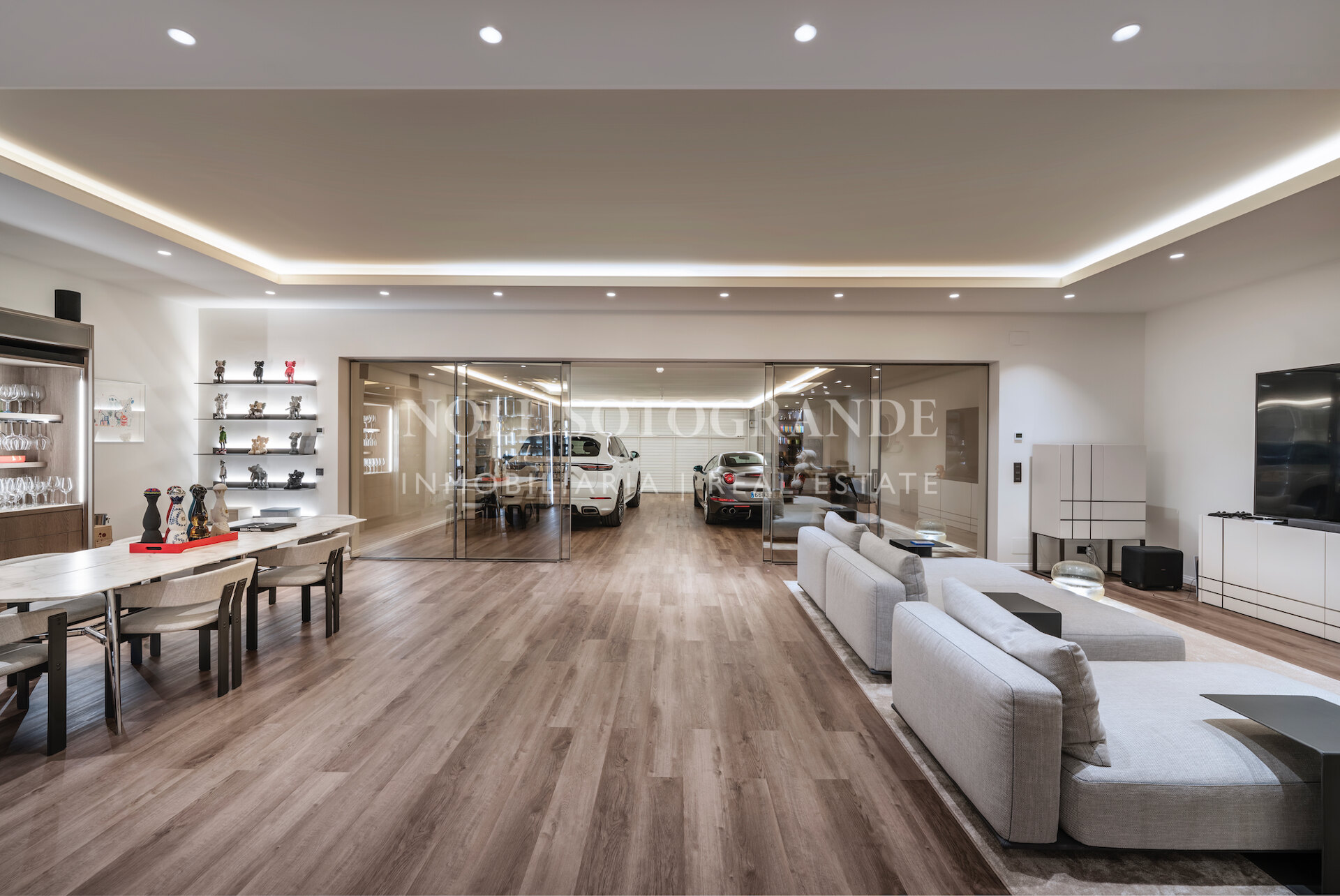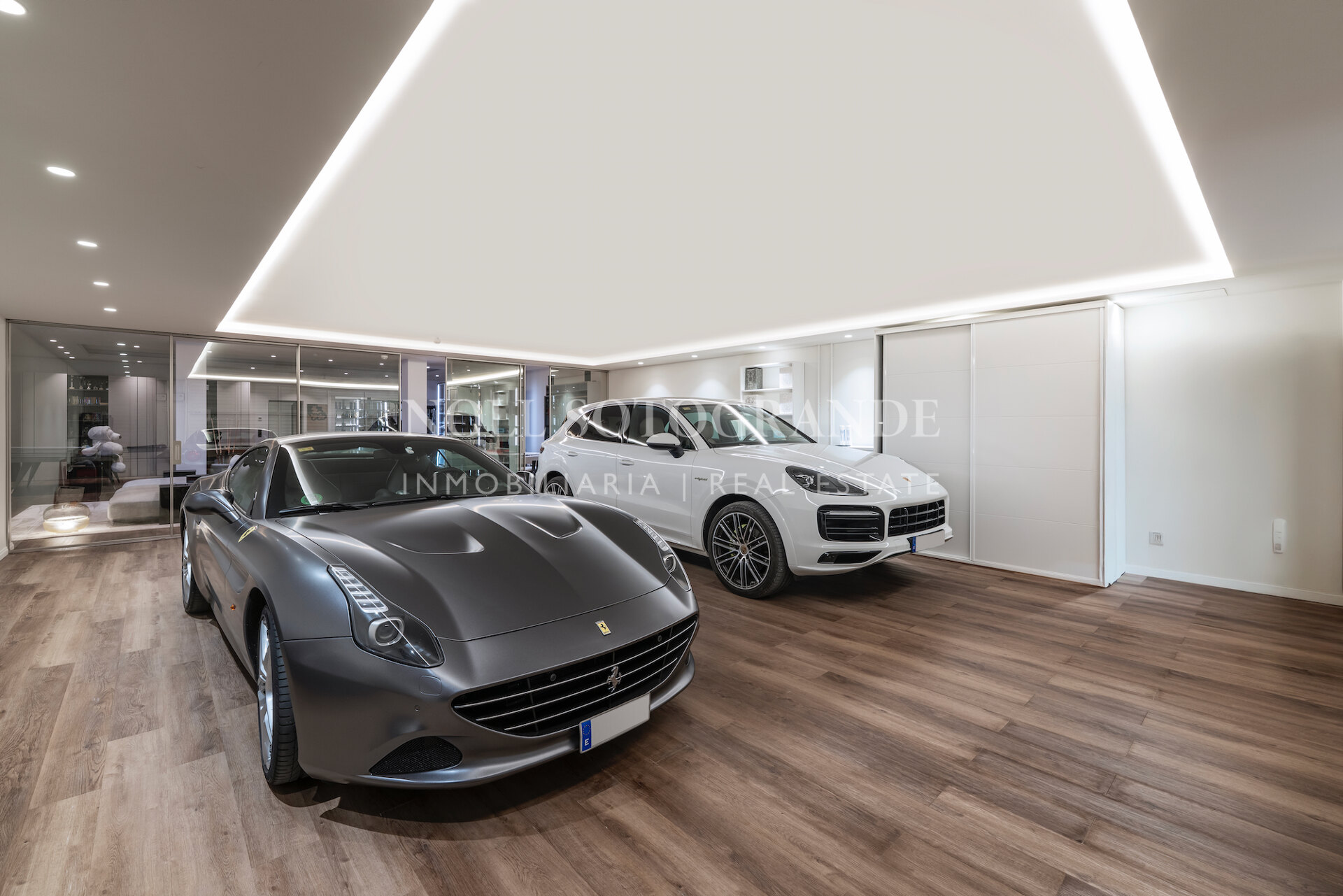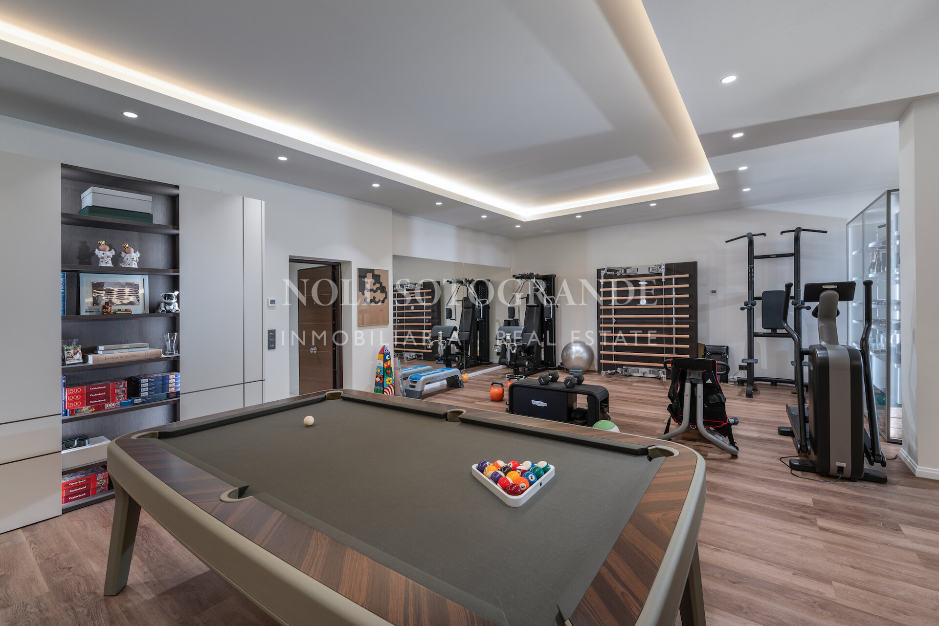 The coolest part of this property is in the basement: starting with a utility kitchen and laundry room equipped with Miele appliances, a 36 m² walk-in dressing room designed by Uecko, and a “playroom” for adults, i.e., a full-fledged fitness area, pool table, and lounge area, as well as a super garage separated by glass doors, where all your “ toys “ (cars) can fit!