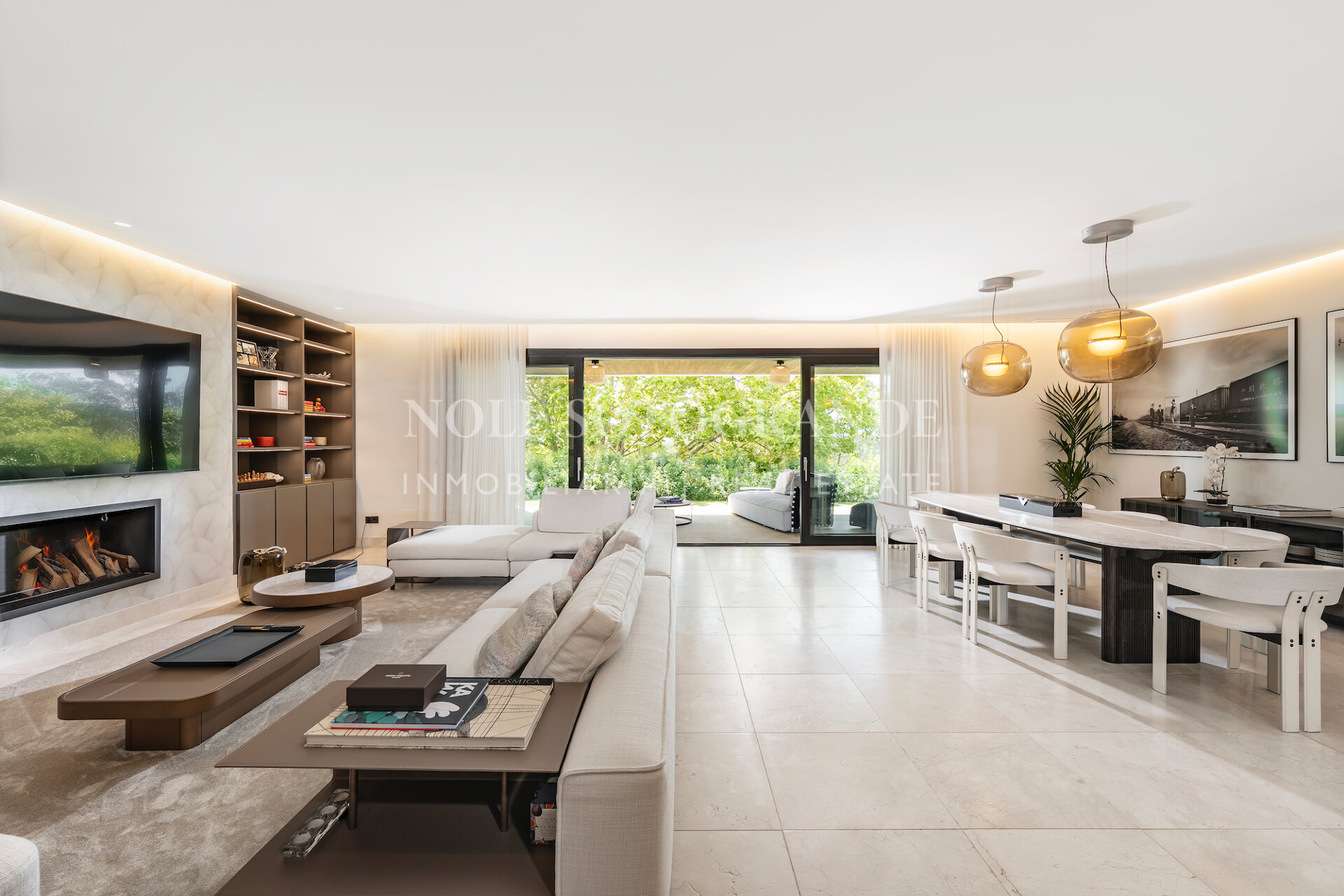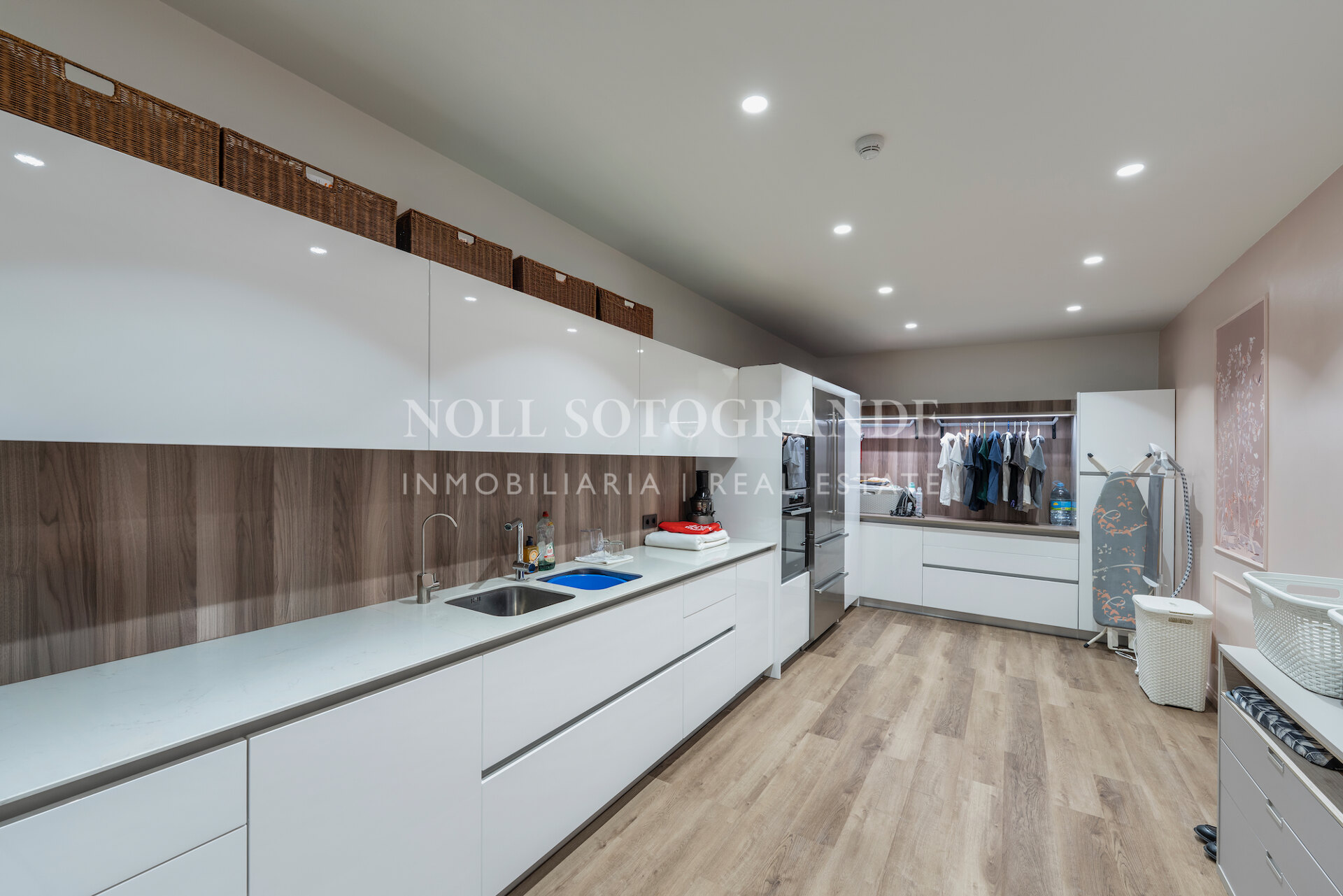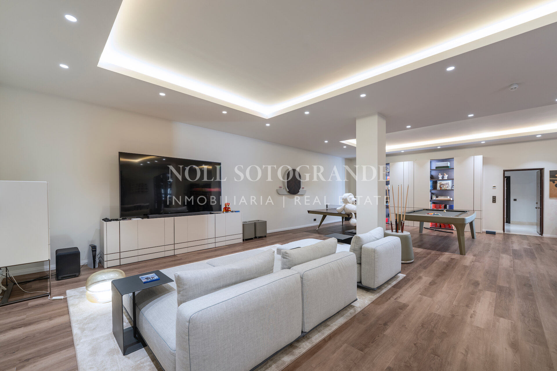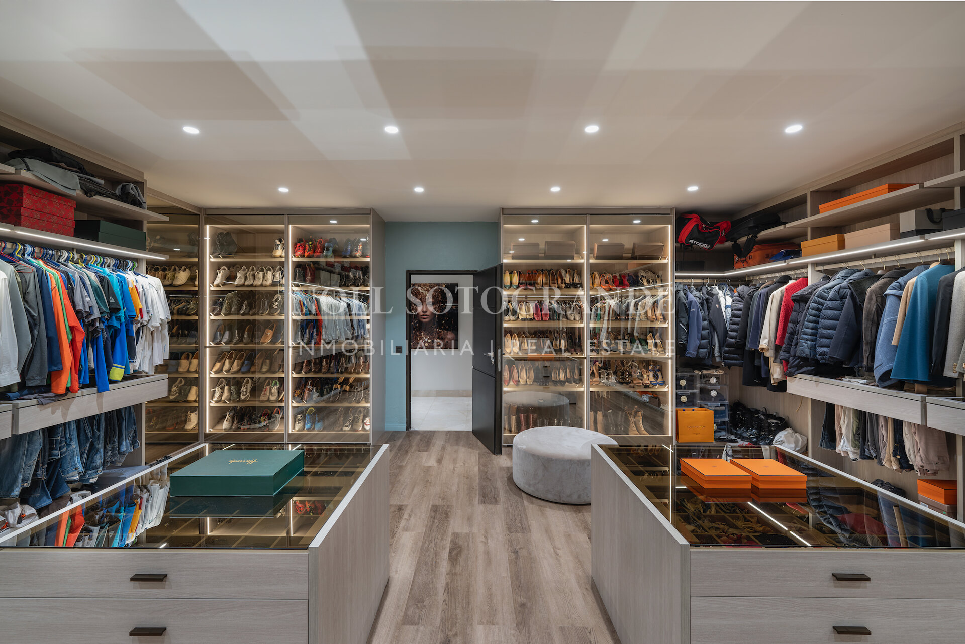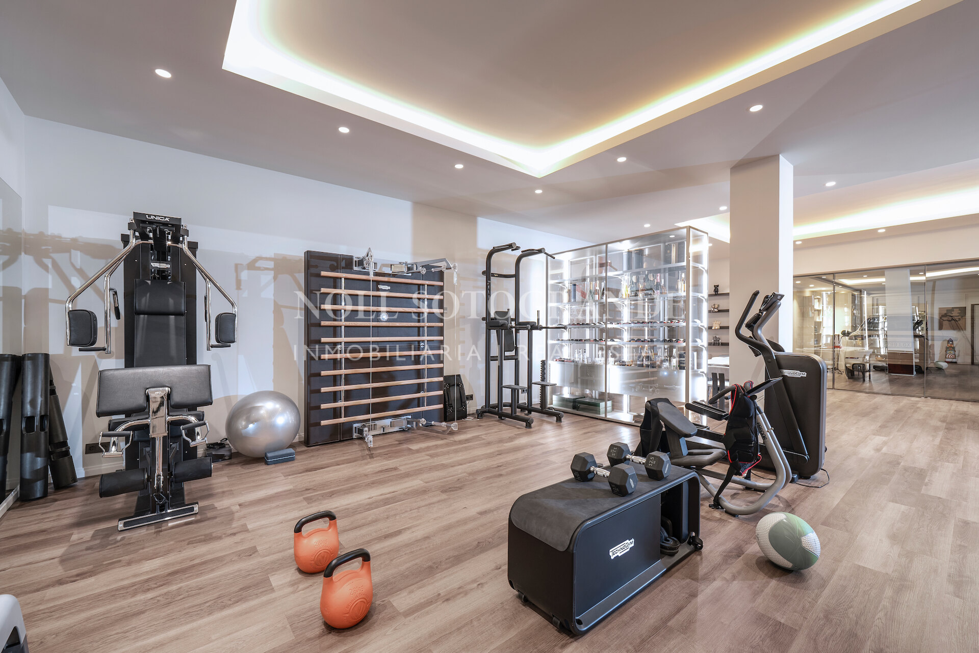 The coolest part of this property is in the basement: starting with a utility kitchen and laundry room equipped with Miele appliances, a 36 m² walk-in dressing room designed by Uecko, and a “playroom” for adults, i.e., a full-fledged fitness area, pool table, and lounge area, as well as a super garage separated by glass doors, where all your “ toys “ (cars) can fit!