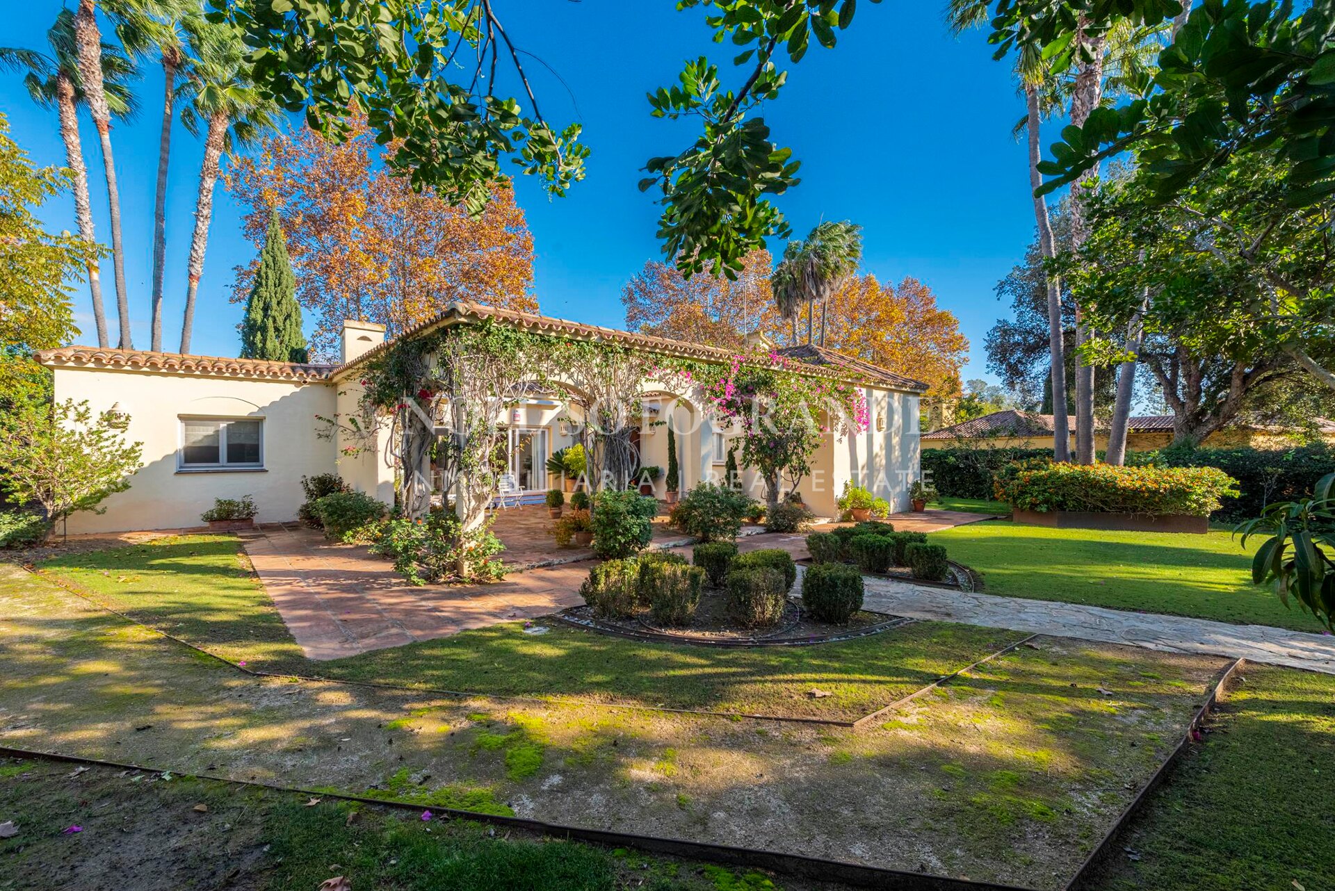 This charming bungalow in traditional Andalusian style is located in a residential complex in Sotogrande and was originally built in 1988. The property stands out for its Andalusian architecture, featuring a charming patio, and its attractive potential for renovation.