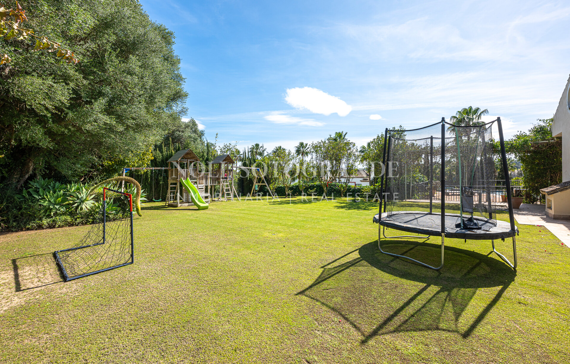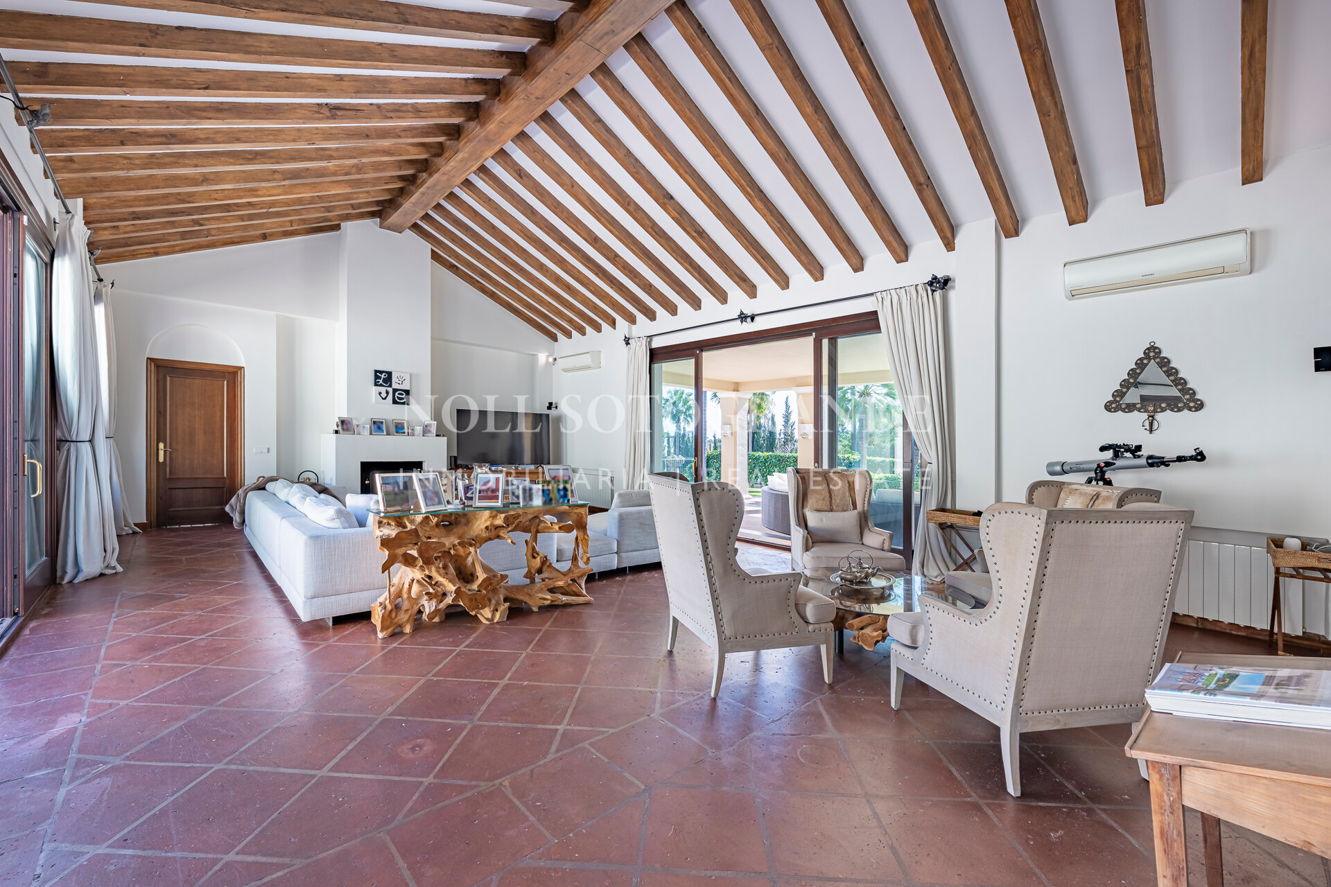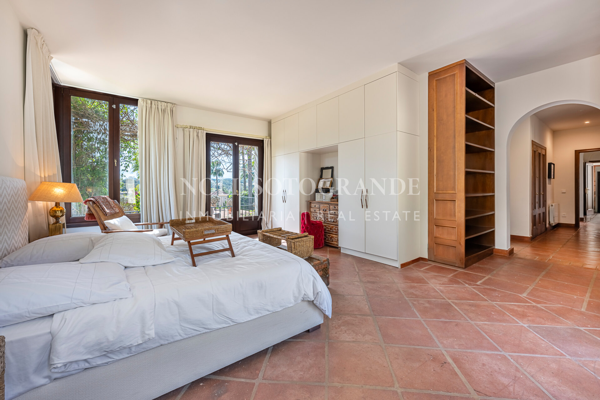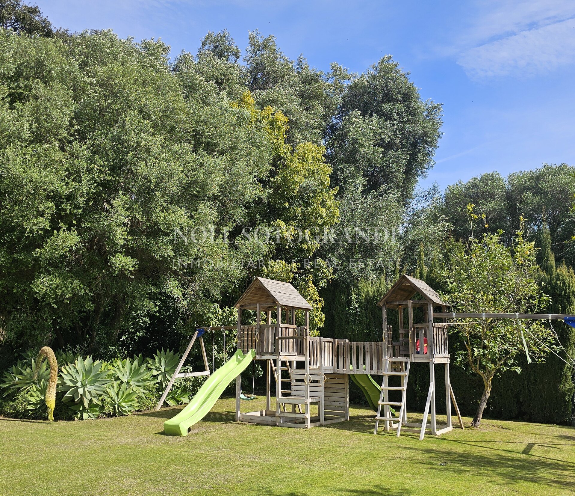 An impressive villa offering privacy, comfort and space, this residence is perfectly positioned in a peaceful residential area while remaining just minutes away from Sotogrande’s championship golf courses, marina, and all the lifestyle amenities. The property includes five spacious en-suite bedrooms. The master suite stands out with its private terrace and dressing area. The main living room features a fireplace and opens onto large terraces, seamlessly connecting indoor and outdoor living. A modern, fully equipped kitchen with pantry and utility area ensures both practicality and style. The villa’s gardens are beautifully landscaped, designed for family enjoyment and entertaining. A private swimming pool, children’s play area, and an outdoor summer kitchen with barbecue and pizza oven make it ideal for gatherings. Additional highlights include a guest annexe above the garage, perfect for visitors or staff accommodation, secure garage parking and further exterior parking spaces. This villa combines space, flexibility, and the relaxed Mediterranean lifestyle Sotogrande is known for.