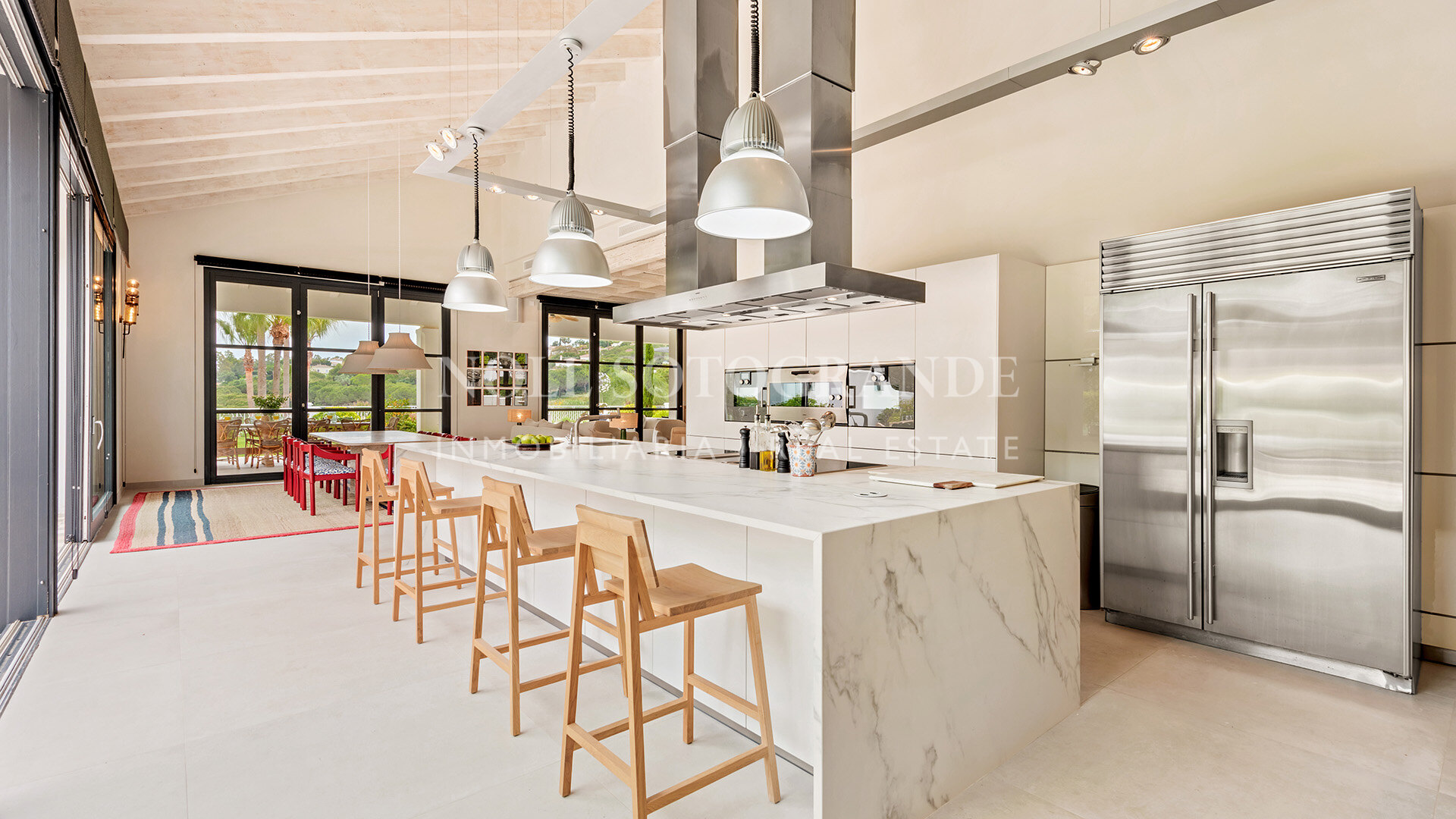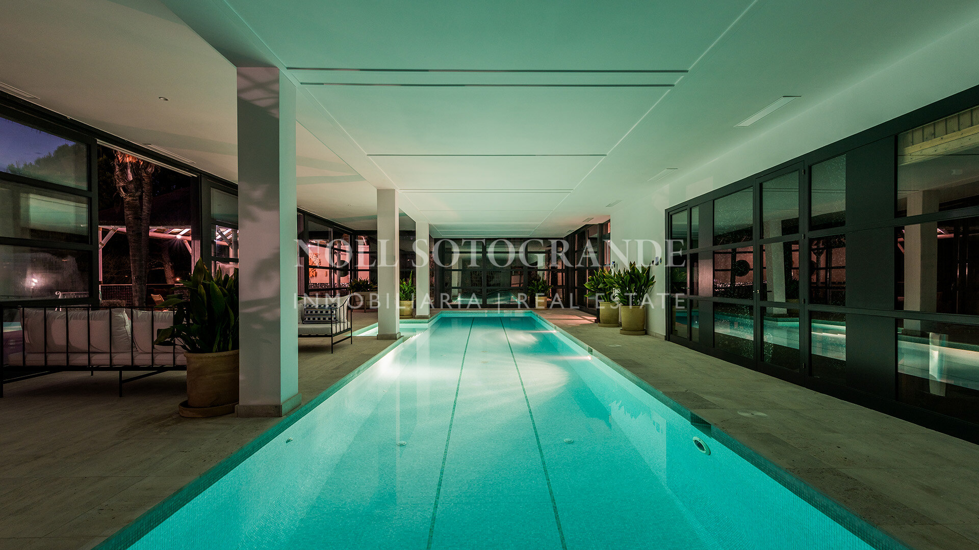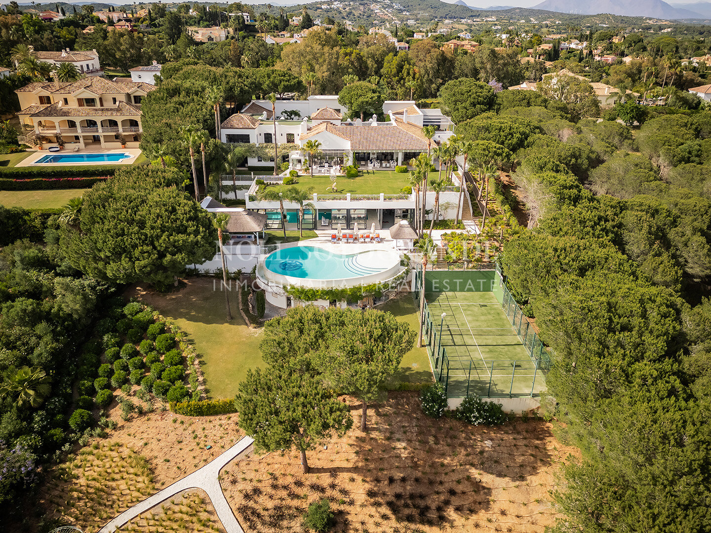 • Outdoor features: infinity pool, covered terraces, bar, projector, padel court
