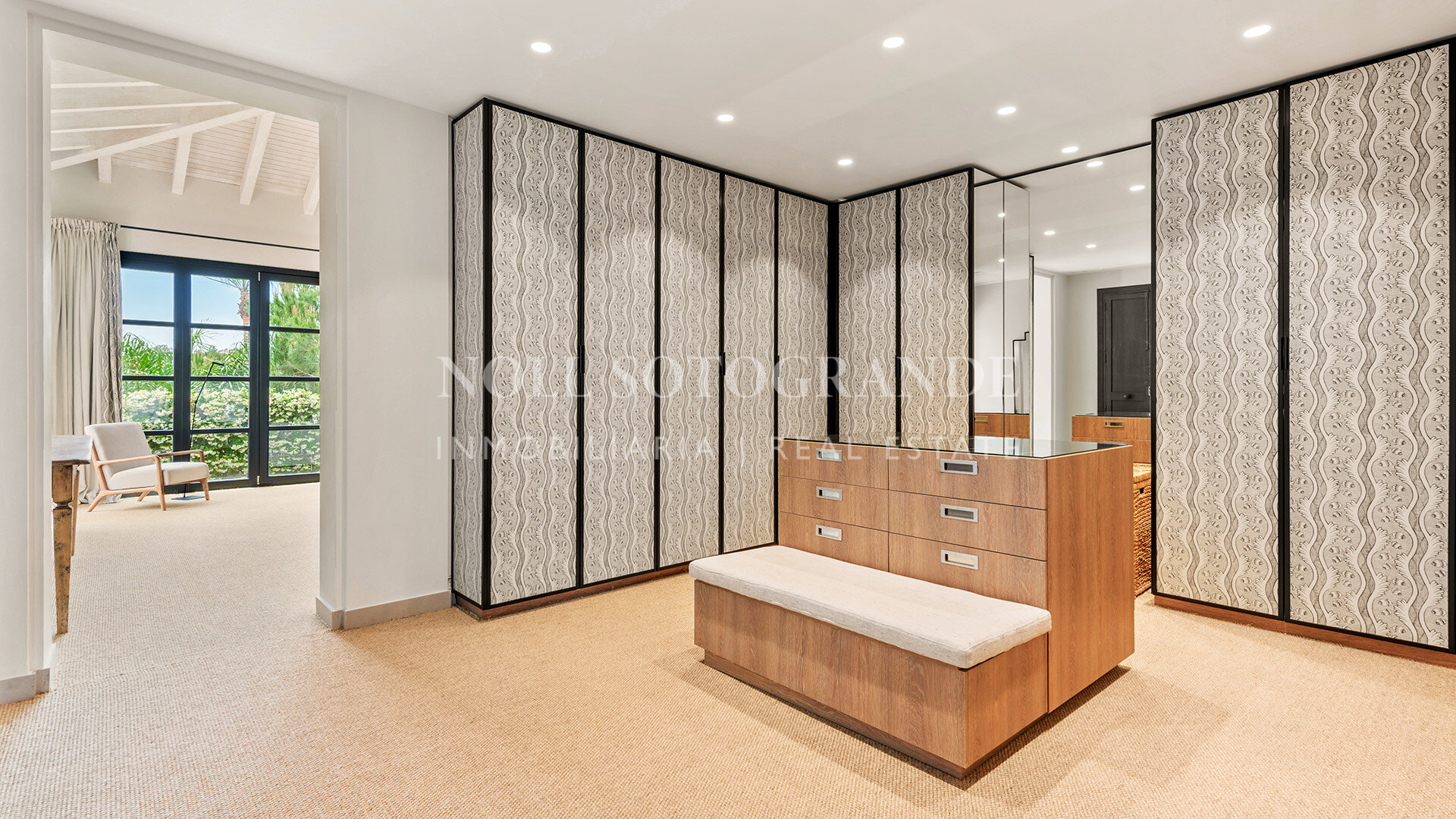 Outside, the terraces offer dining for 12, multiple lounging areas, and a projector for open-air cinema nights. Entertainment and wellness are seamlessly integrated into the estate’s design. On the lower level, natural light fills a state-of-the-art indoor leisure space featuring a 16.5 m saltwater pool, a 42 m² gym, sauna, and steam room. Outdoors, the landscaped gardens extend to the golf course and include a spectacular free-form saltwater infinity pool, a bar with an outdoor TV area, and a private padel court. This is an extraordinary lifestyle property — serene, stylish, and ready to enjoy.