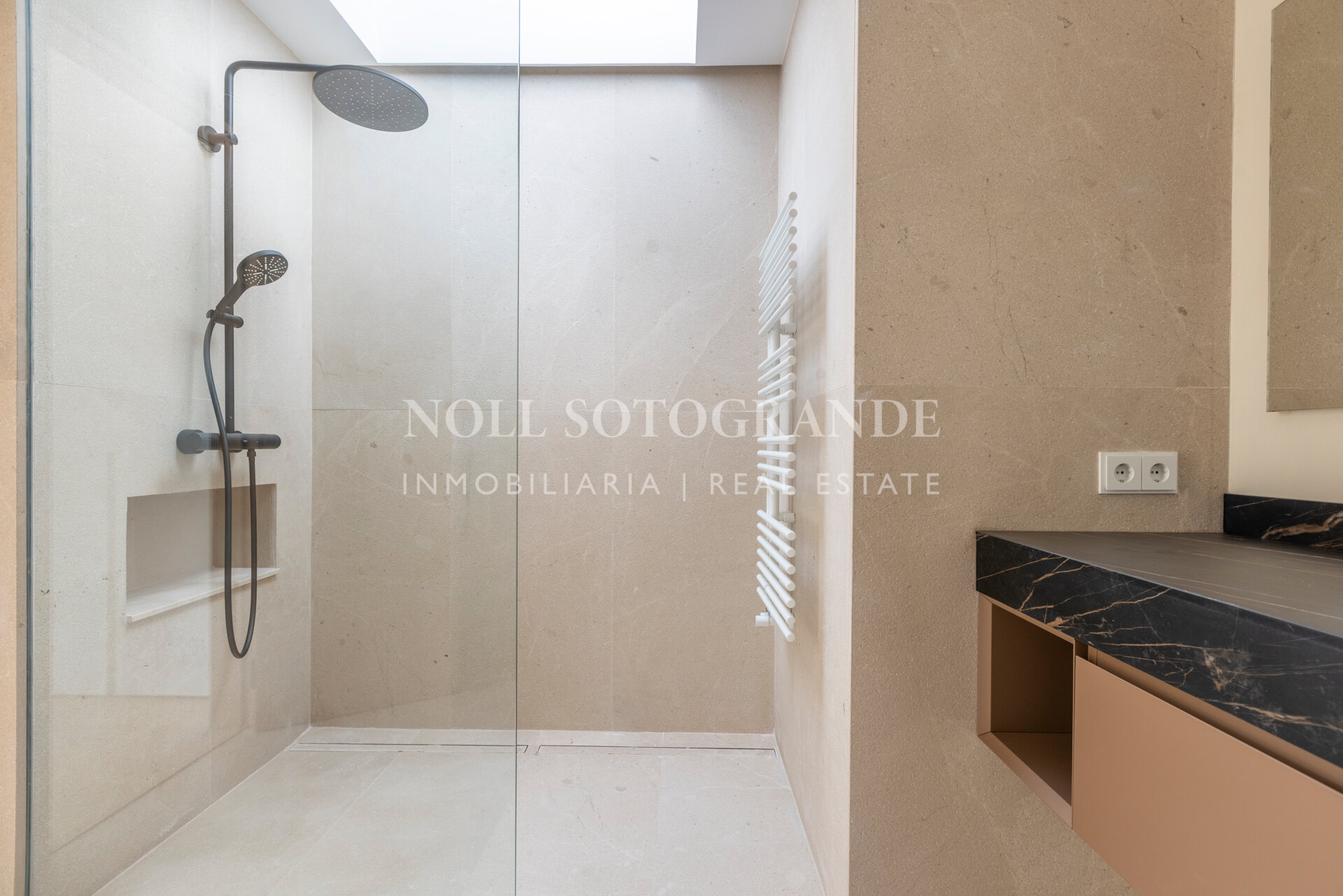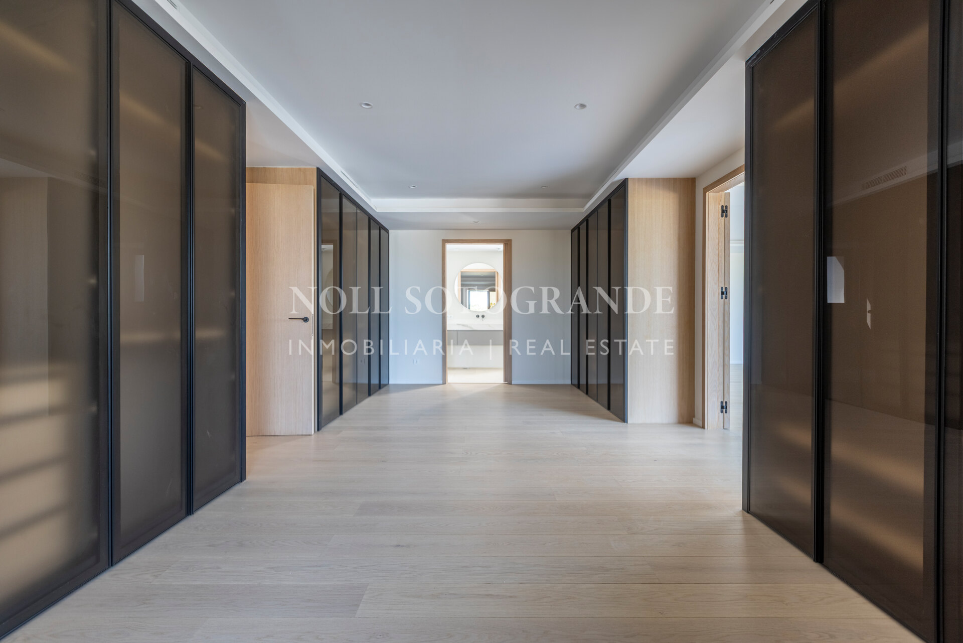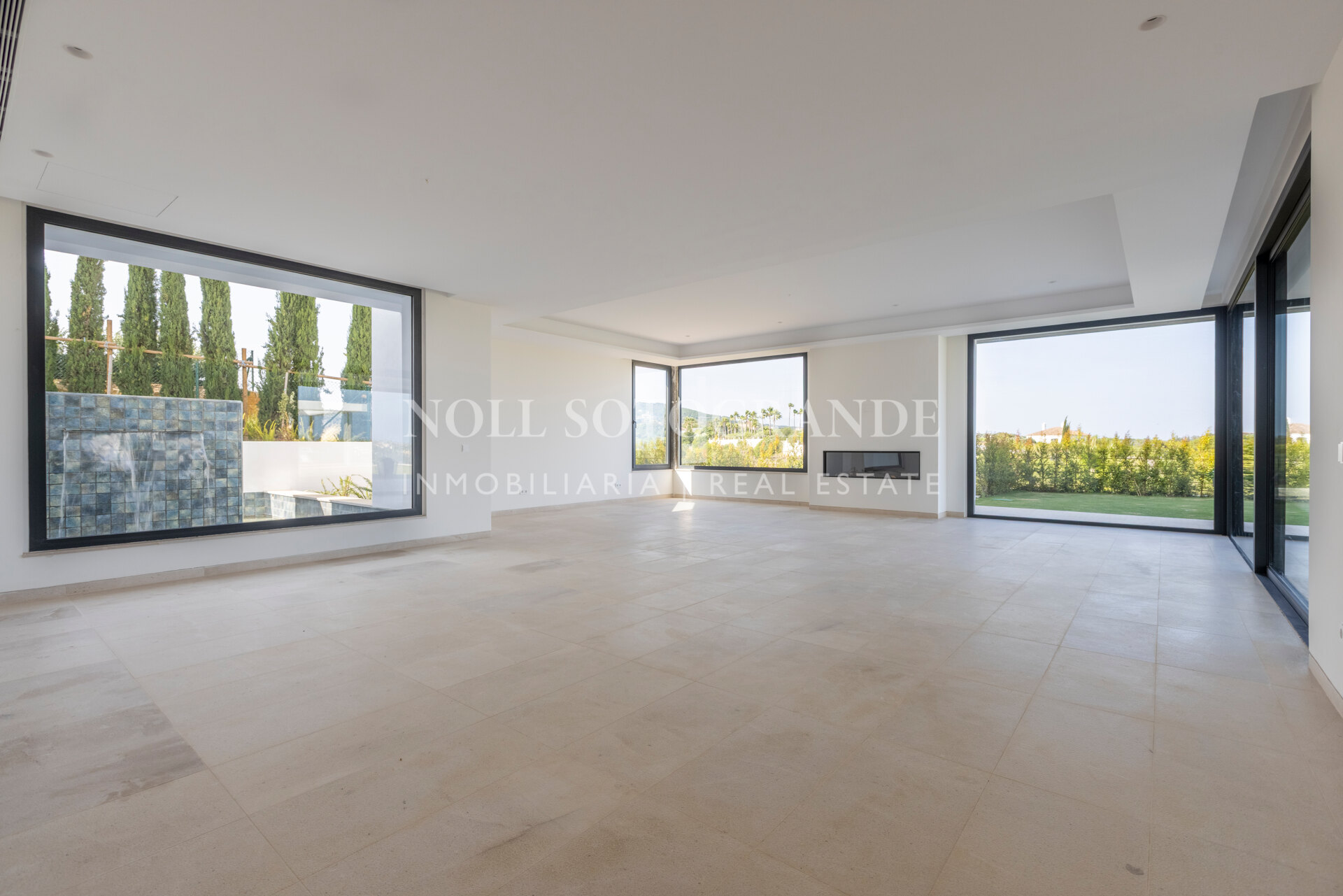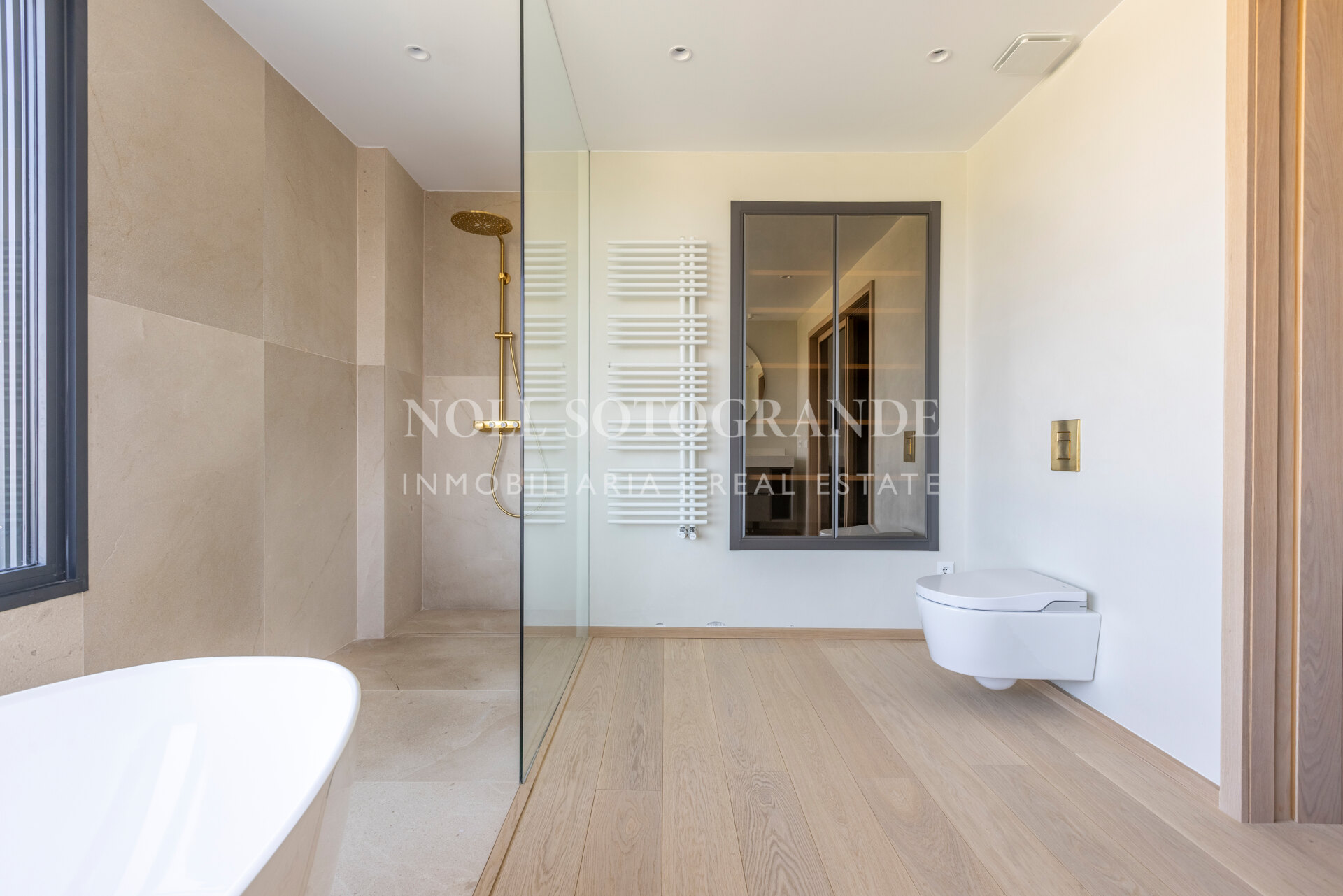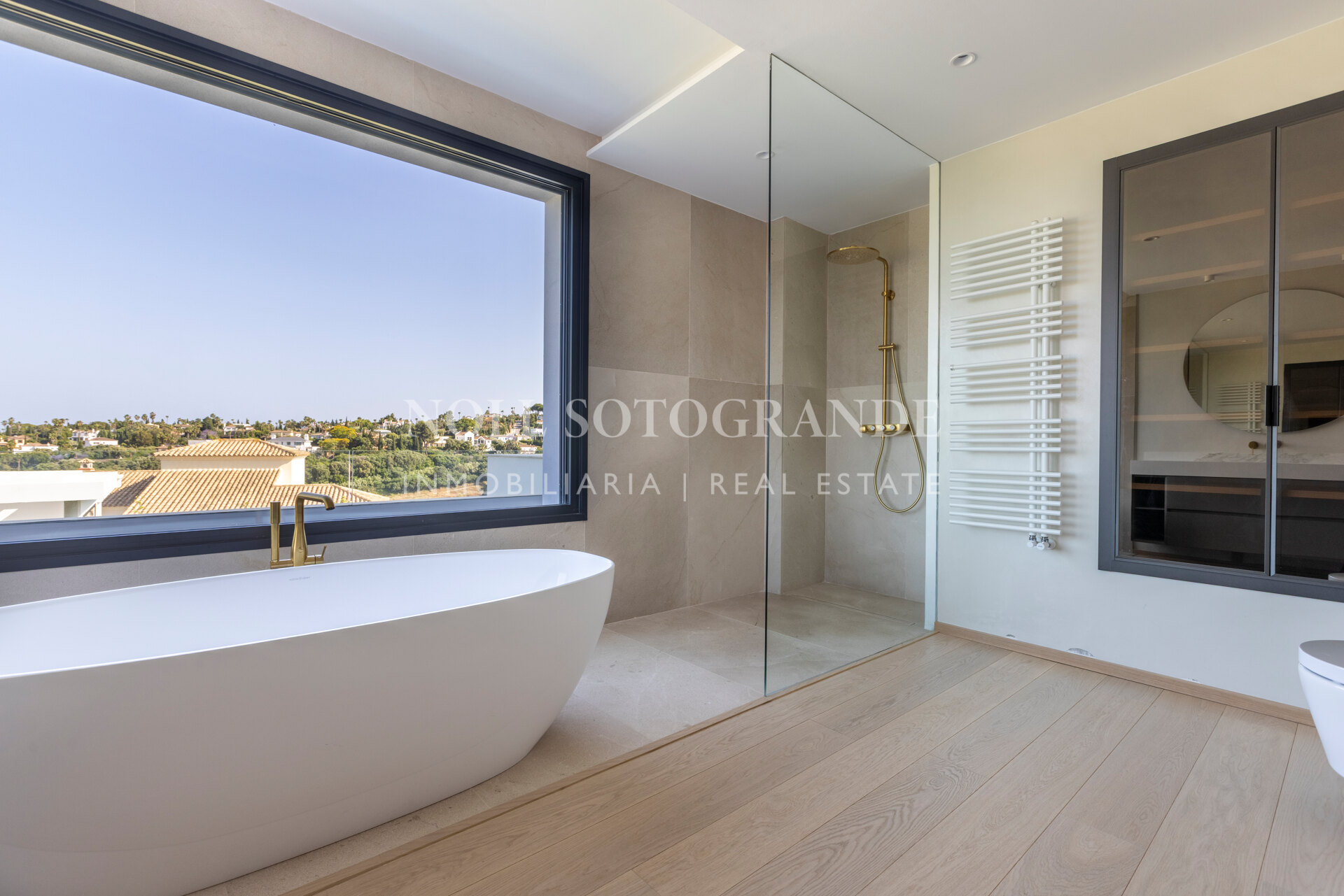 This is a modern 8-bedroom villa currently in its last building phase in Sotogrande Alto, conveniently located near the Sotogrande International School. Set on a 3,765 m² plot, this property is designed to capture sunlight throughout the day, offering panoramic almost 360-degree views of the surrounding landscape. The villa features a contemporary design and incorporates the latest energy-efficient technologies, including indoor air treatment systems and underfloor heating. The ground floor welcomes you with a spacious entrance hall leading to a living room with a fireplace, a dining area, and a fully equipped modern kitchen. This level also includes a separate laundry room, a guest toilet, and a cosy family room. The main terrace extends along the length of the lounge, connecting to the kitchen and overlooking the 20-meter heated infinity swimming pool and landscaped garden. Additional highlights of this property include a separate two-bedroom apartment beneath the swimming pool, perfect for guests or staff, and multiple private terraces accessible from the bedrooms, offering magnificent views. The villa is scheduled for completion in spring 2025, providing an excellent opportunity to own a state-of-the-art residence in one of Sotogrande’s most sought-after areas.