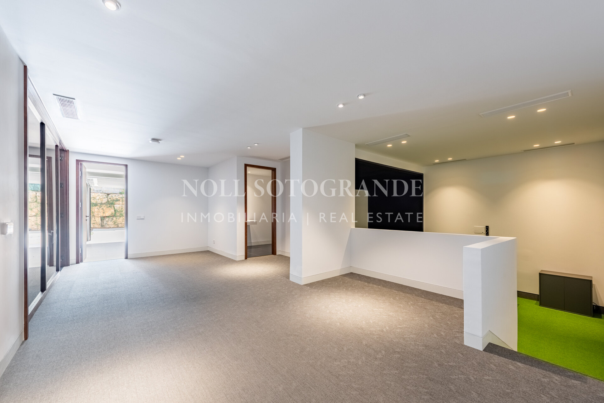 The lower level is dedicated to leisure and comfort and includes the pre-installation of a golf practice facility which can be equipped with Trackman technology – perfect for honing your game from the comfort of your own home. In addition, there is a sauna and a cold plunge, a fully equipped laundry room and ample storage space on this level. Further there is a garage for two to three cars, the technical room, as well as more storage rooms.