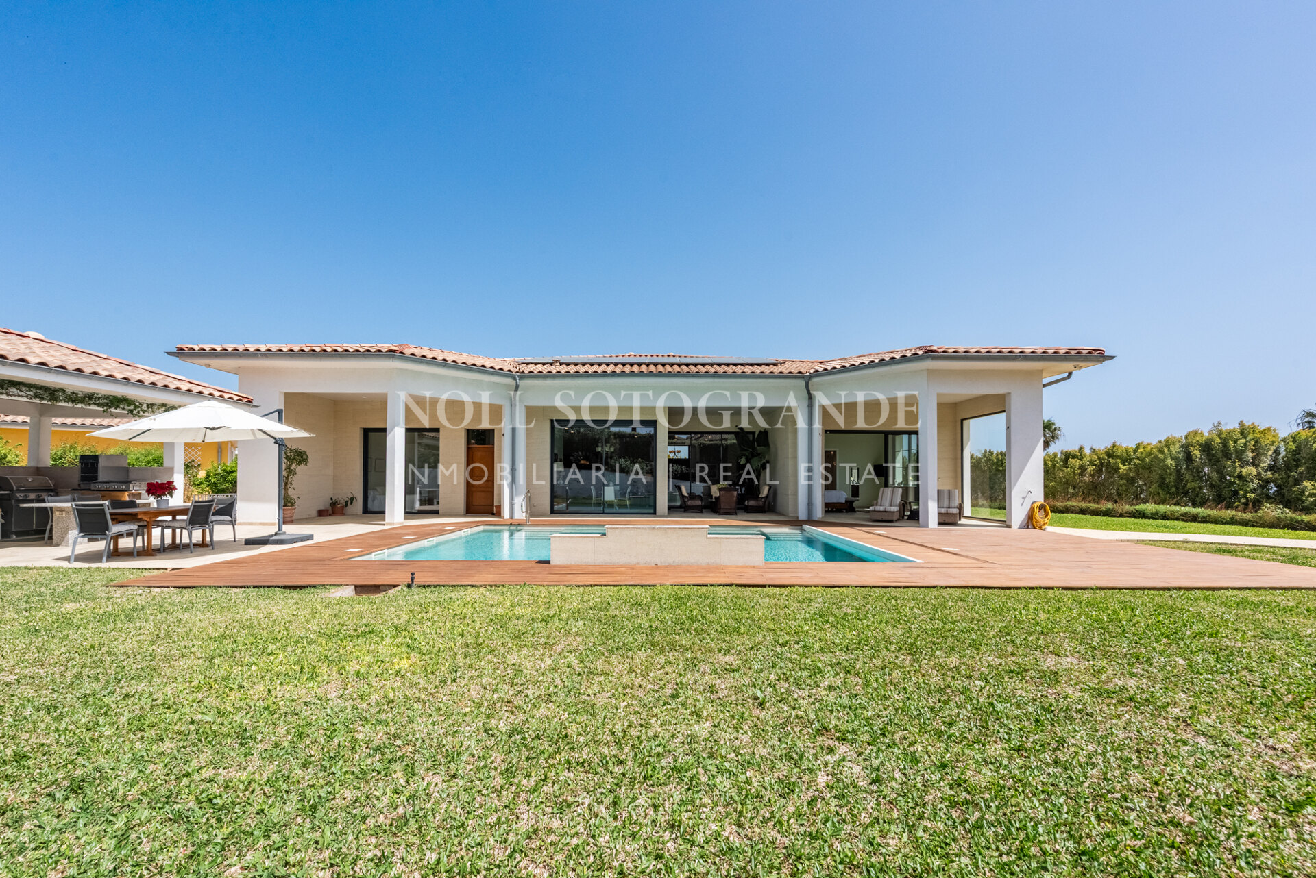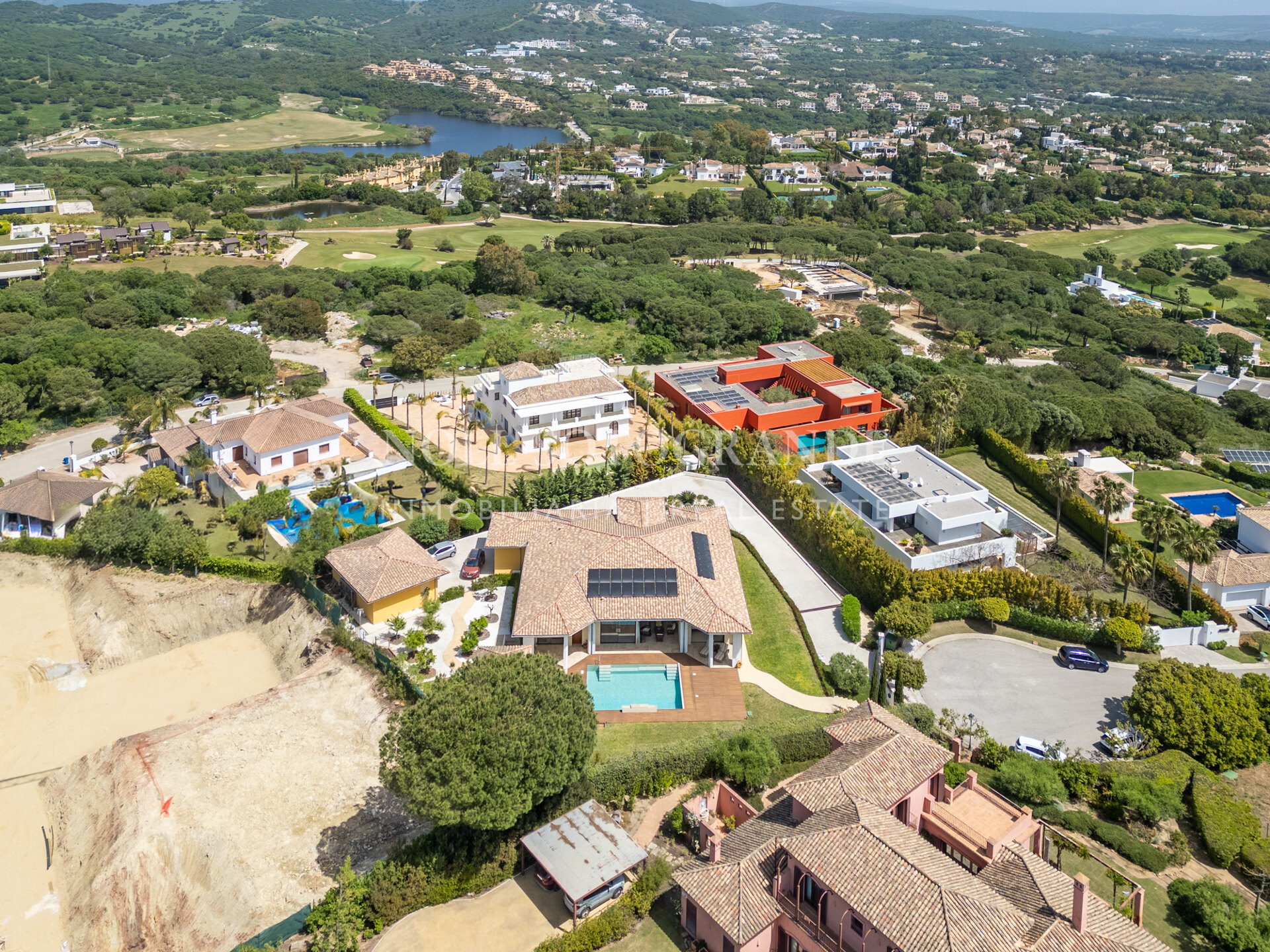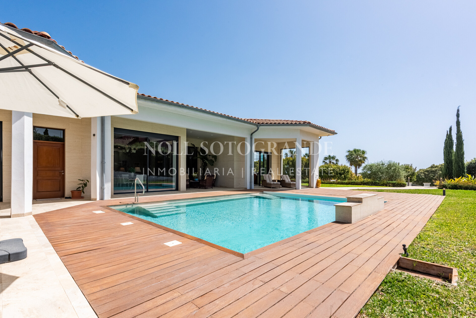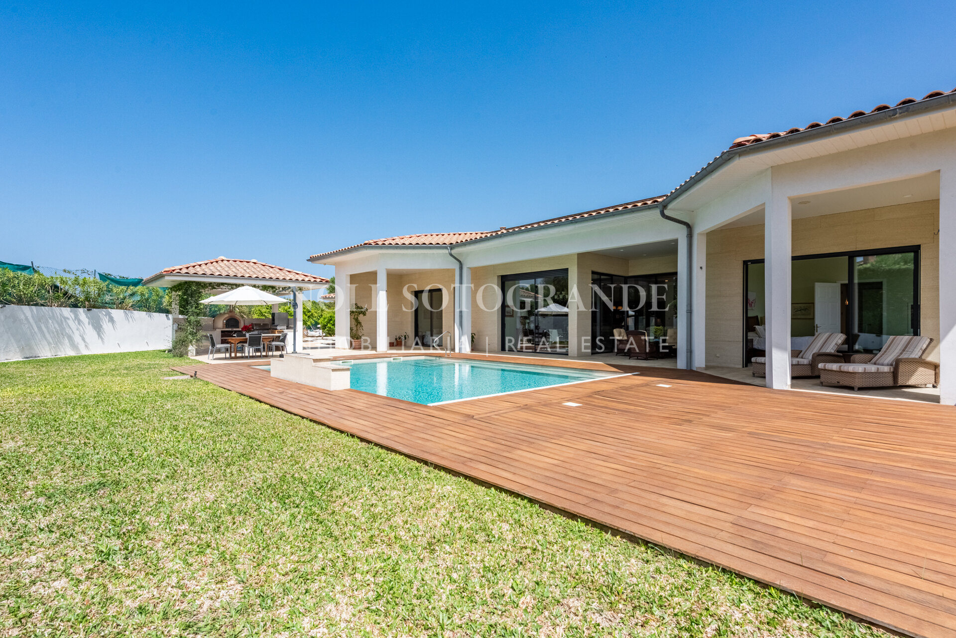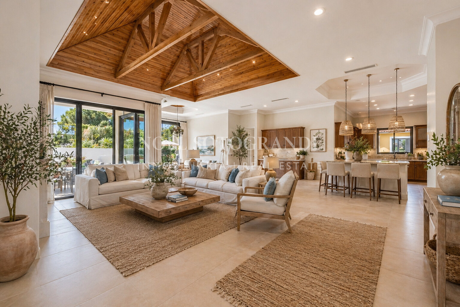 Positioned on one of the highest and most privileged points in Sotogrande Alto, this elegant single-level residence enjoys a peaceful setting combined with excellent proximity to key lifestyle destinations, including the SO/ Sotogrande Spa & Golf Resort and the renowned Sotogrande International School. Designed as a refined bungalow with clean architectural lines and a timeless aesthetic, the property offers a practical and highly liveable American-style open-plan layout that emphasizes comfort, natural light, and effortless day-to-day living. The main living area flows seamlessly into the dining space and kitchen, creating a welcoming environment ideally suited for both family life and entertaining.