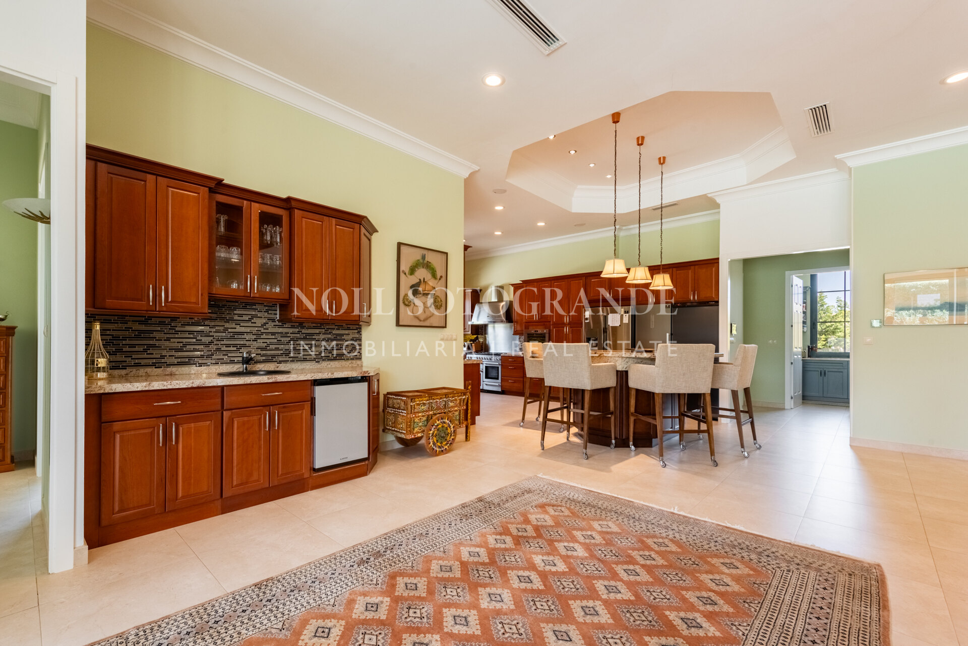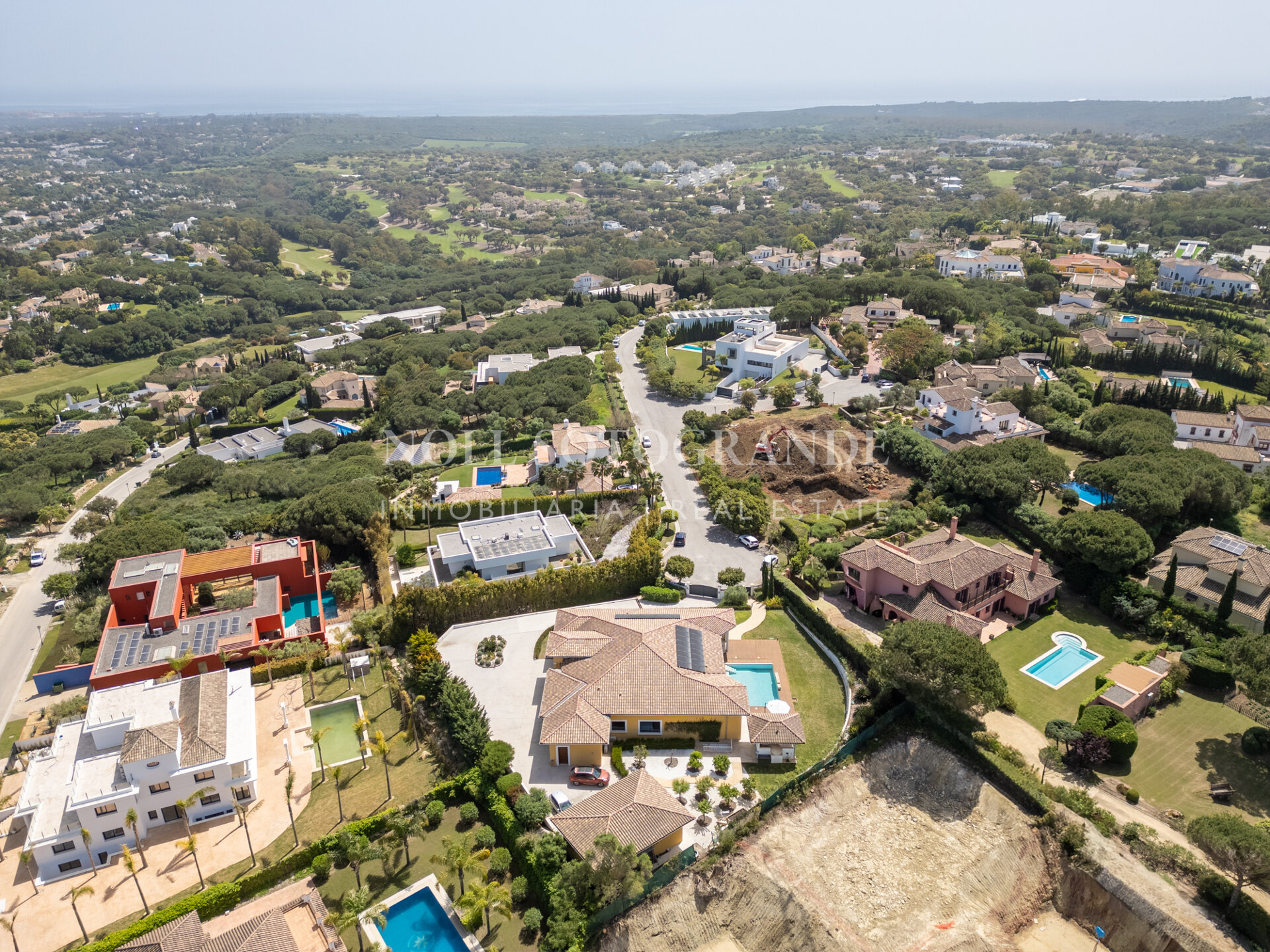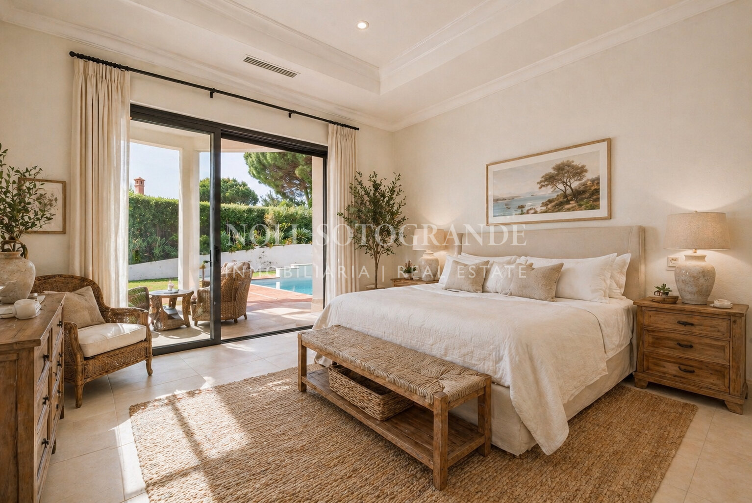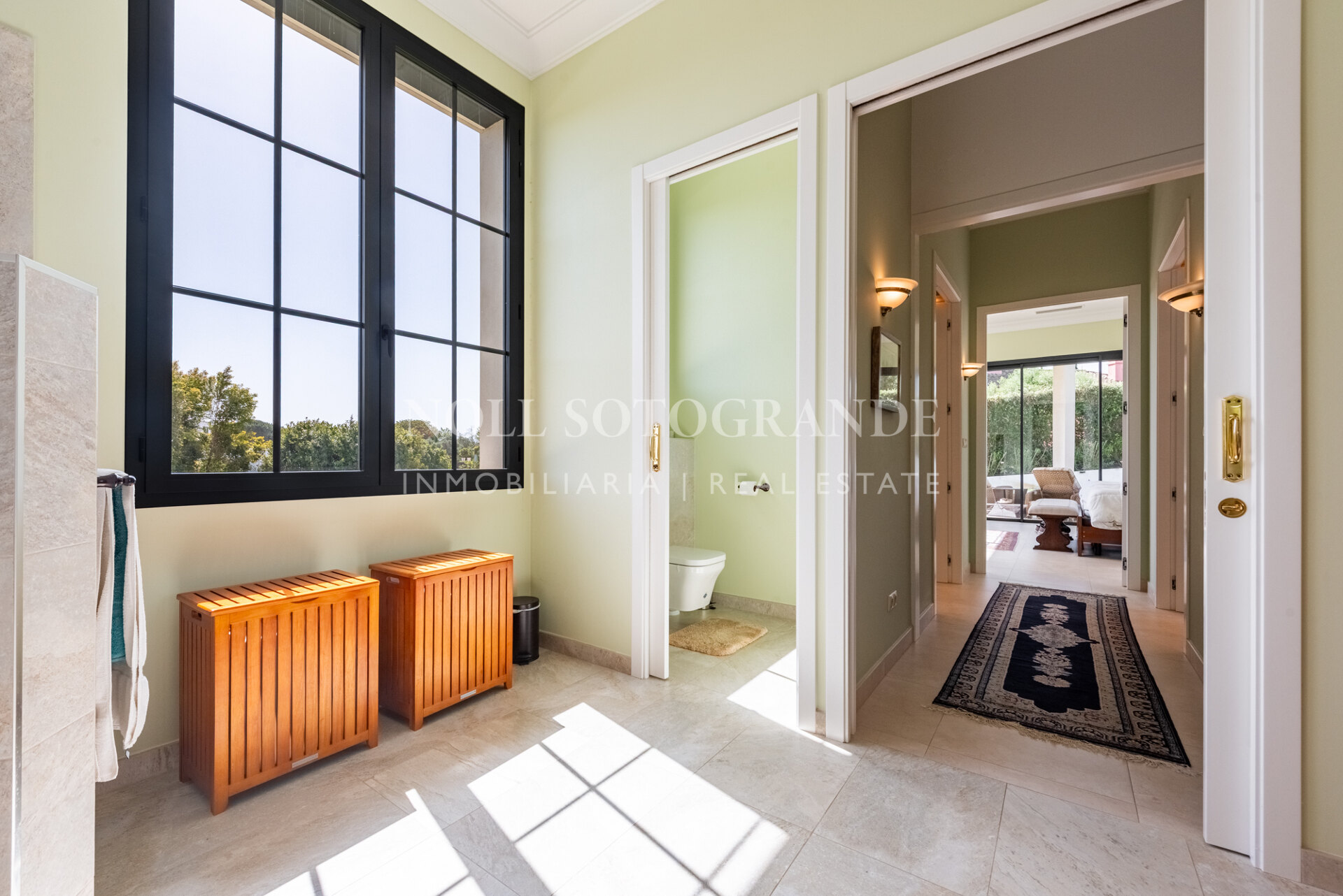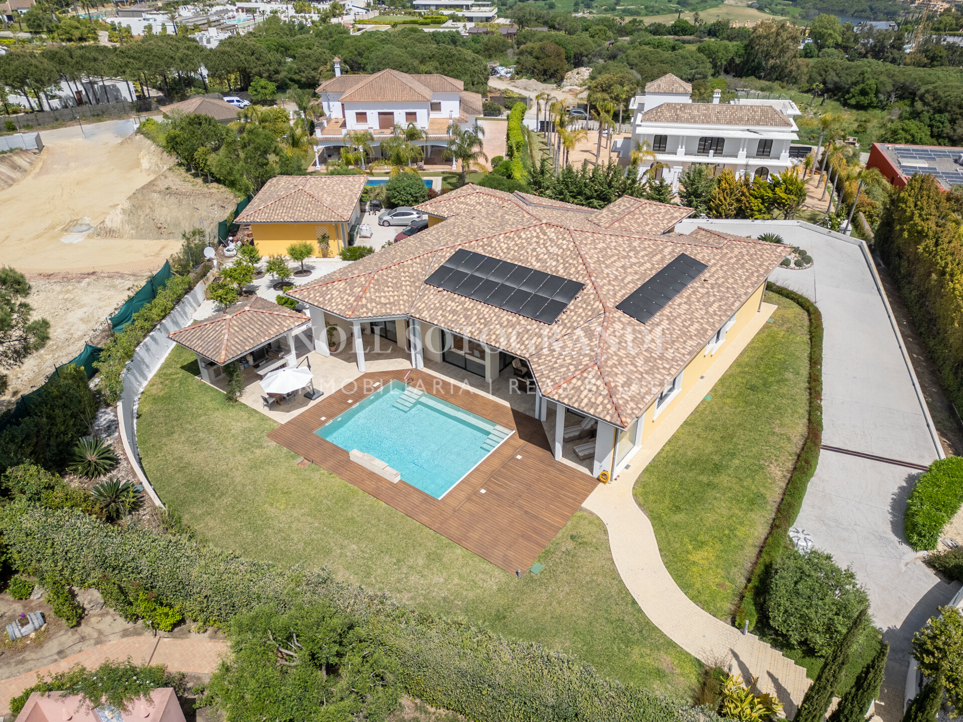 Positioned on one of the highest and most privileged points in Sotogrande Alto, this elegant single-level residence enjoys a peaceful setting combined with excellent proximity to key lifestyle destinations, including the SO/ Sotogrande Spa & Golf Resort and the renowned Sotogrande International School. Designed as a refined bungalow with clean architectural lines and a timeless aesthetic, the property offers a practical and highly liveable American-style open-plan layout that emphasizes comfort, natural light, and effortless day-to-day living. The main living area flows seamlessly into the dining space and kitchen, creating a welcoming environment ideally suited for both family life and entertaining.