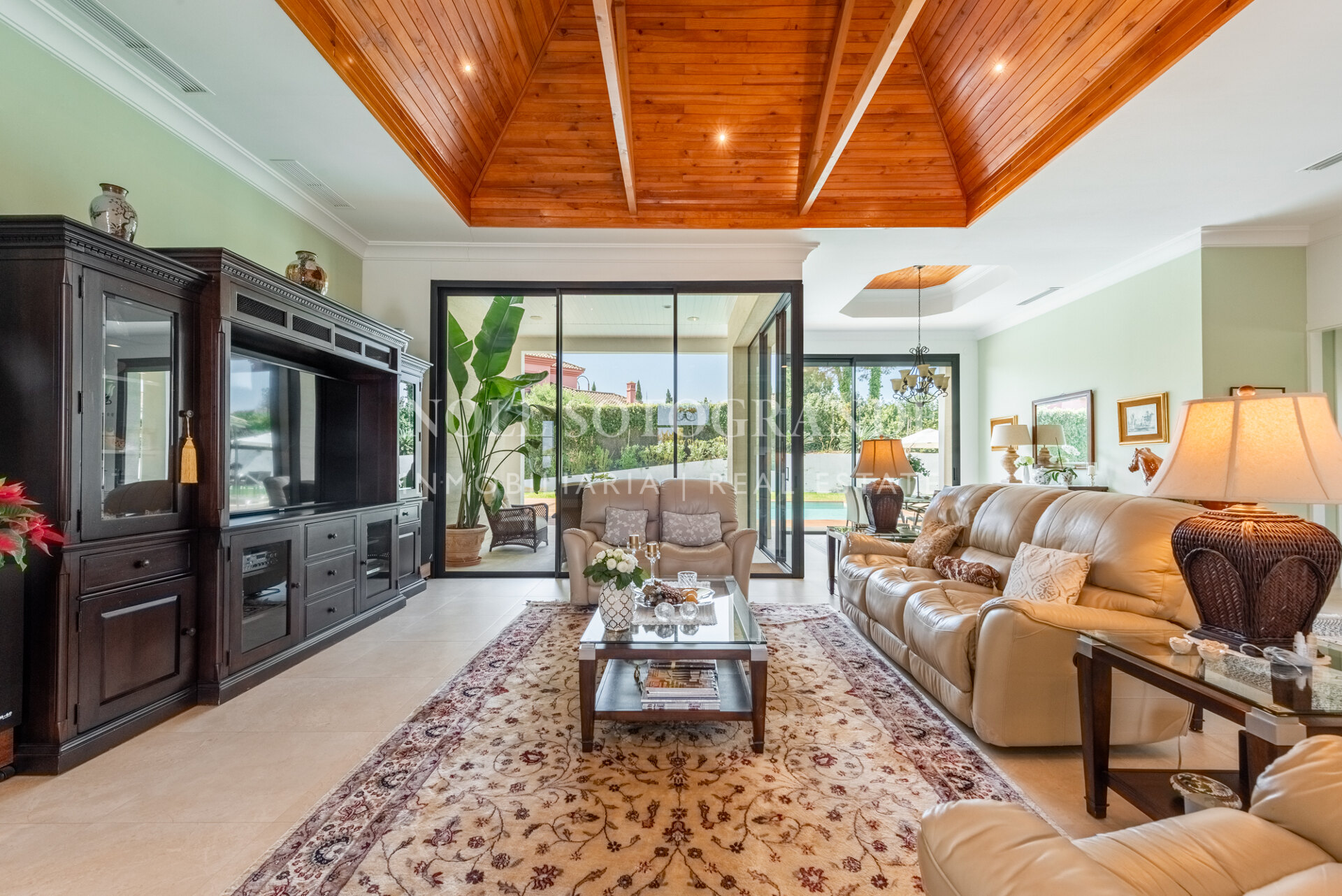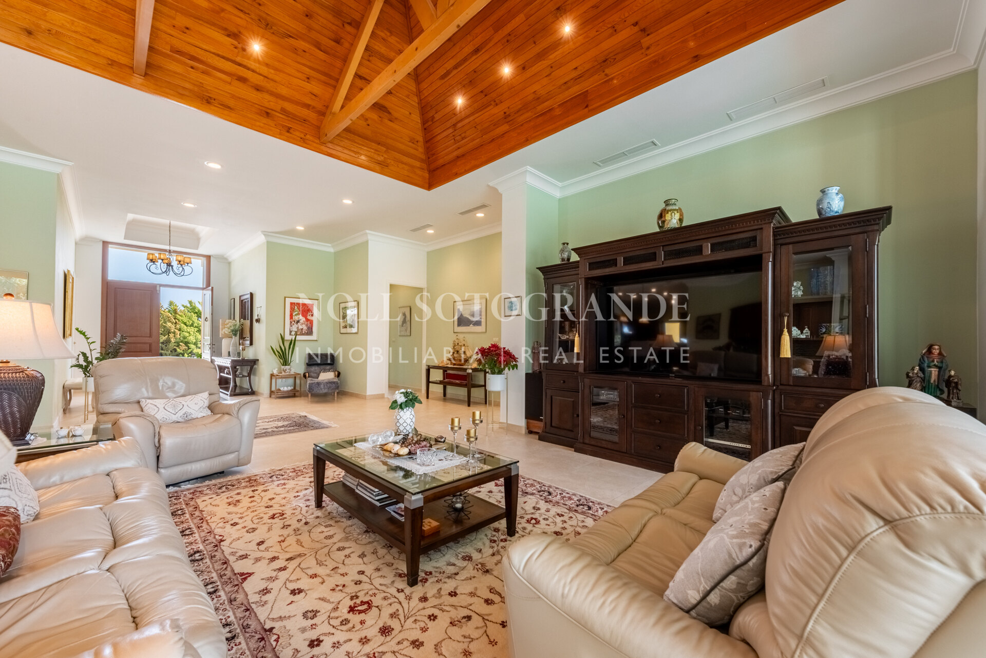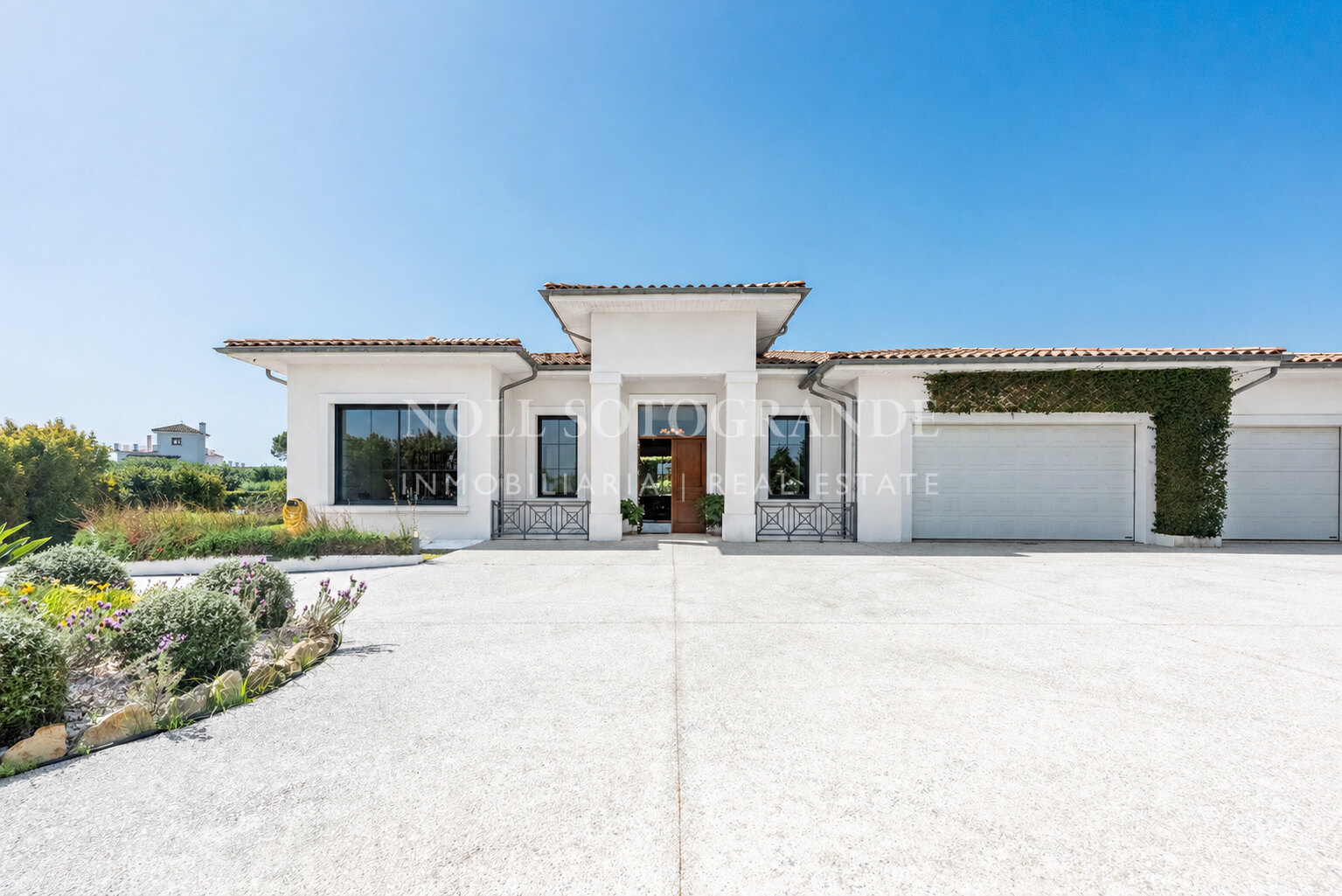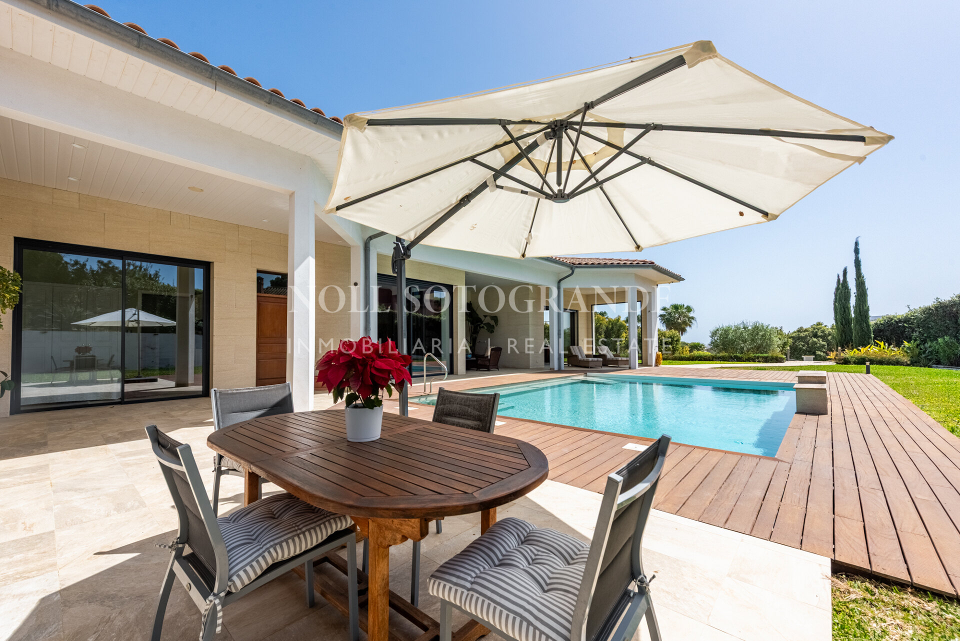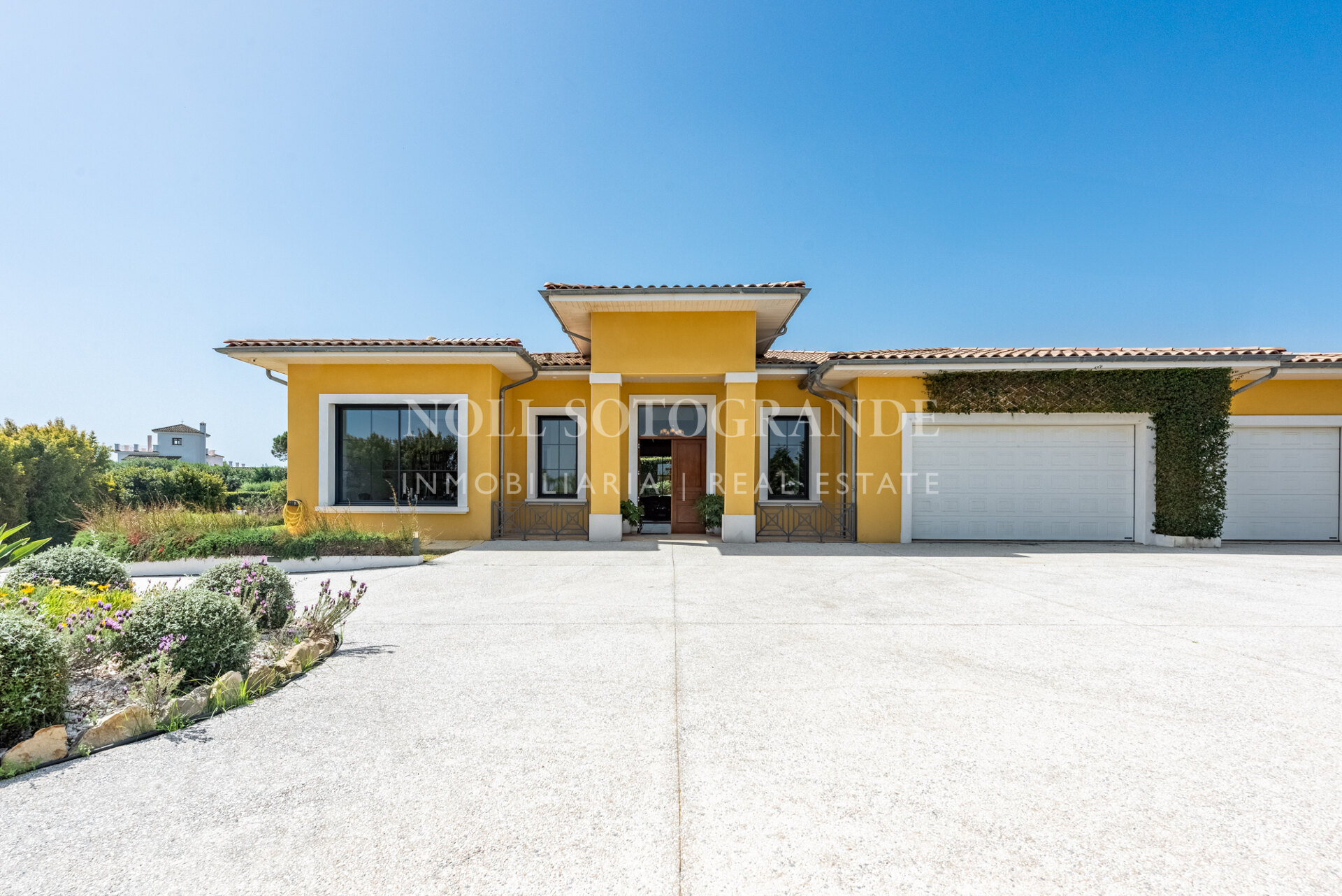 Positioned on one of the highest and most privileged points in Sotogrande Alto, this elegant single-level residence enjoys a peaceful setting combined with excellent proximity to key lifestyle destinations, including the SO/ Sotogrande Spa & Golf Resort and the renowned Sotogrande International School. Designed as a refined bungalow with clean architectural lines and a timeless aesthetic, the property offers a practical and highly liveable American-style open-plan layout that emphasizes comfort, natural light, and effortless day-to-day living. The main living area flows seamlessly into the dining space and kitchen, creating a welcoming environment ideally suited for both family life and entertaining.