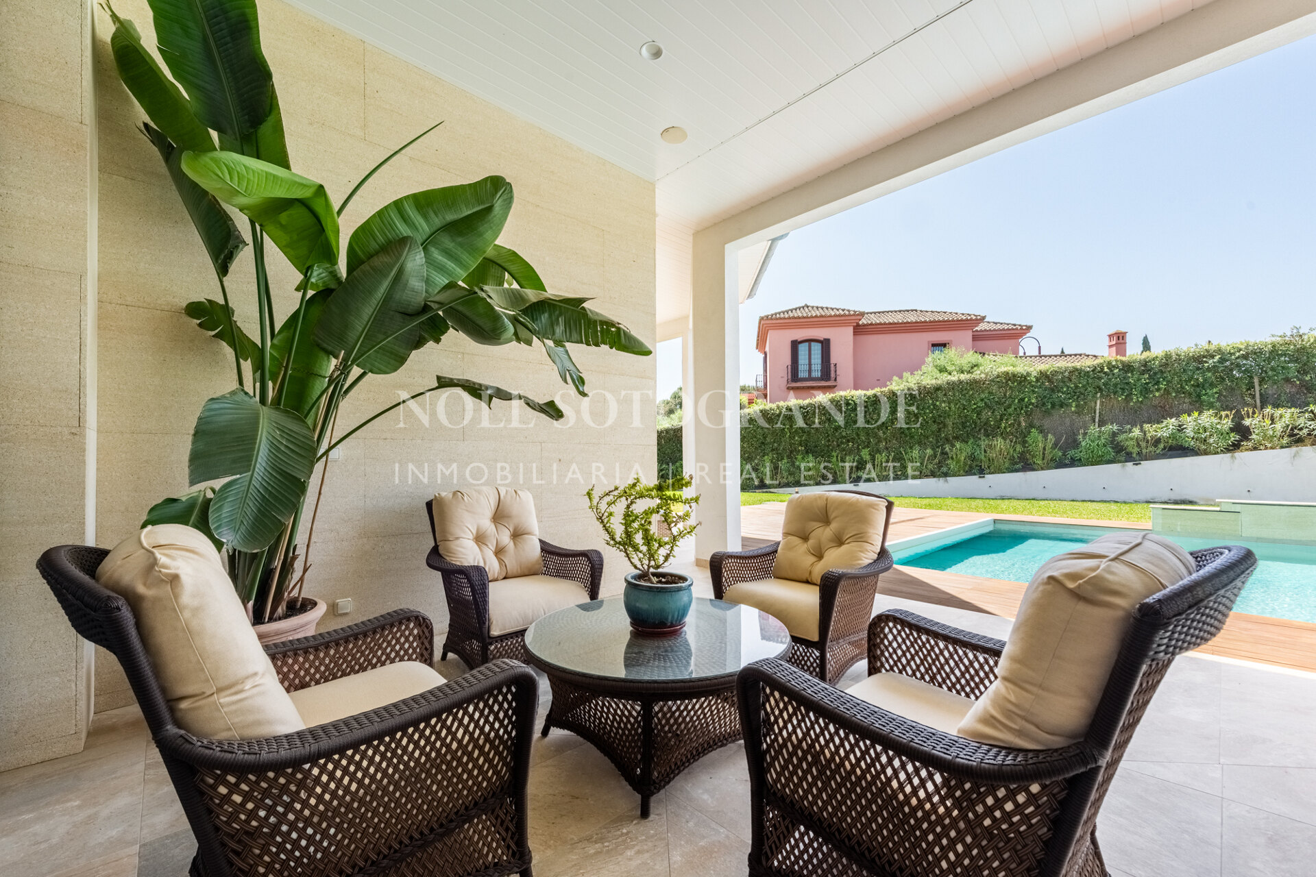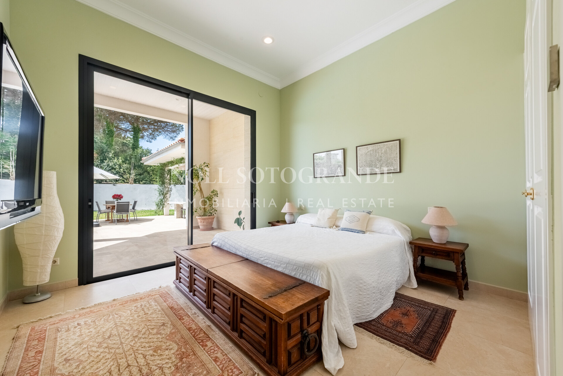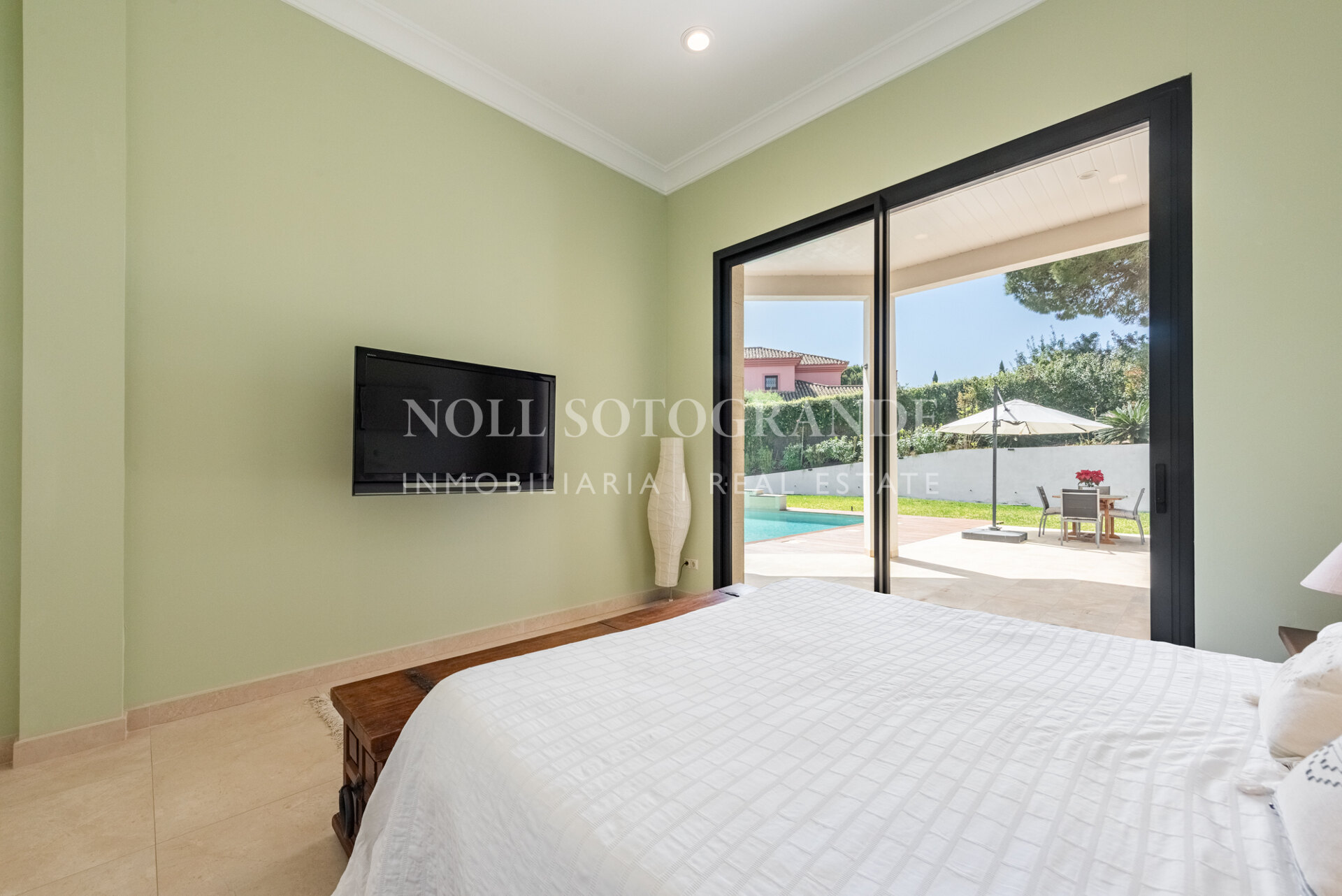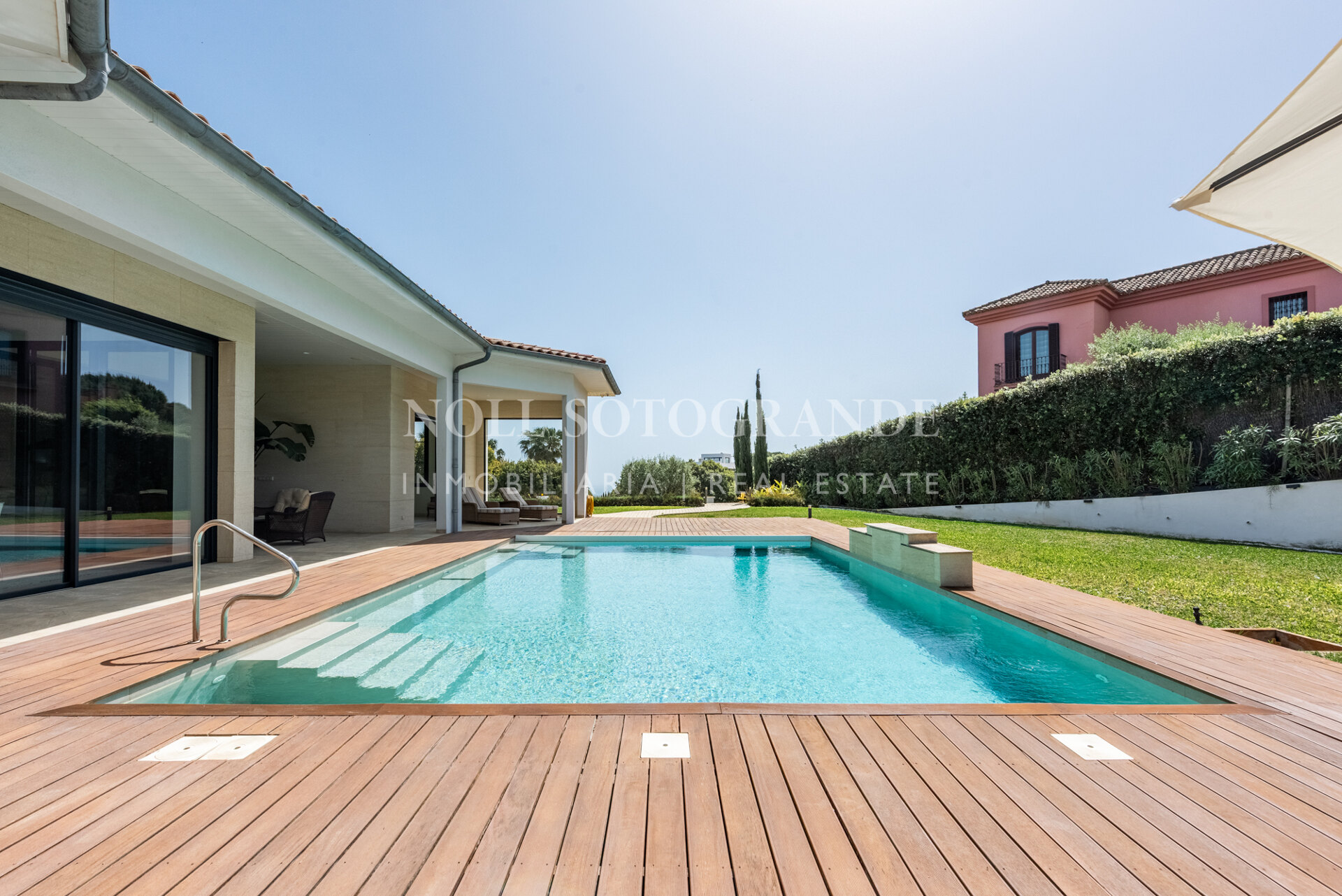 Positioned on one of the highest and most privileged points in Sotogrande Alto, this elegant single-level residence enjoys a peaceful setting combined with excellent proximity to key lifestyle destinations, including the SO/ Sotogrande Spa & Golf Resort and the renowned Sotogrande International School. Designed as a refined bungalow with clean architectural lines and a timeless aesthetic, the property offers a practical and highly liveable American-style open-plan layout that emphasizes comfort, natural light, and effortless day-to-day living. The main living area flows seamlessly into the dining space and kitchen, creating a welcoming environment ideally suited for both family life and entertaining.