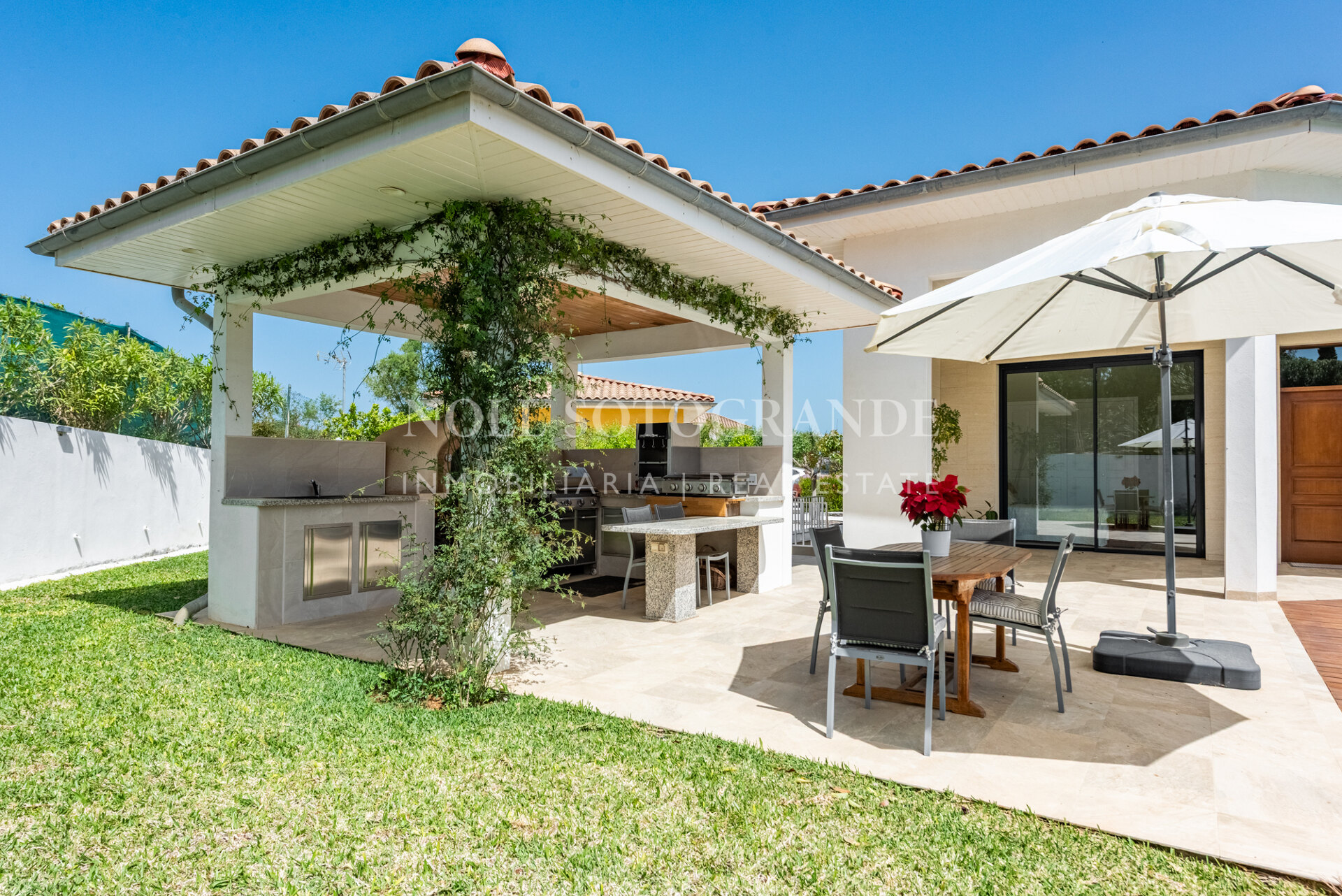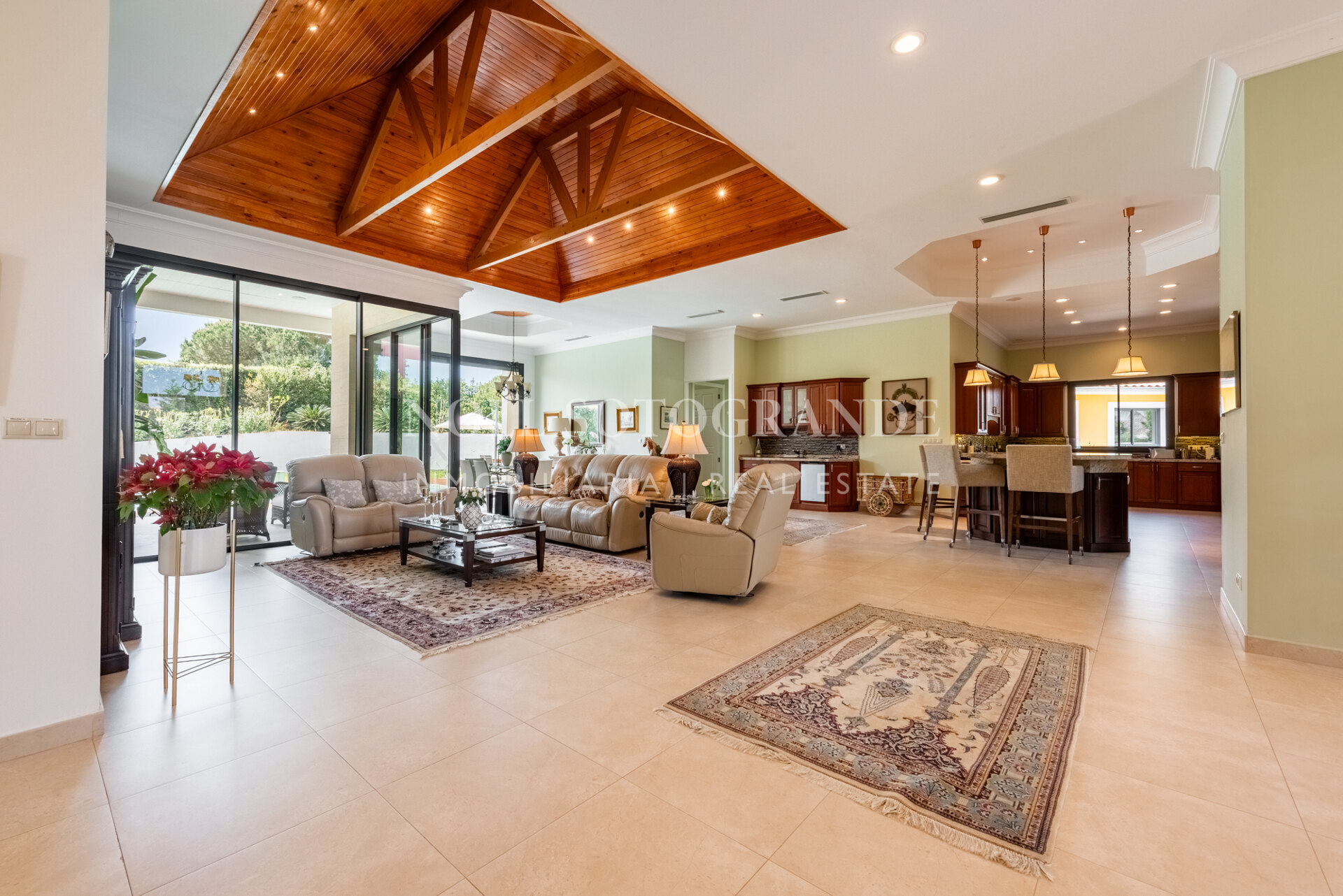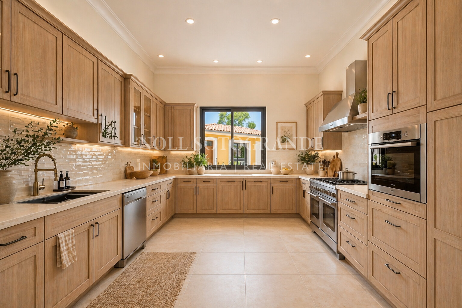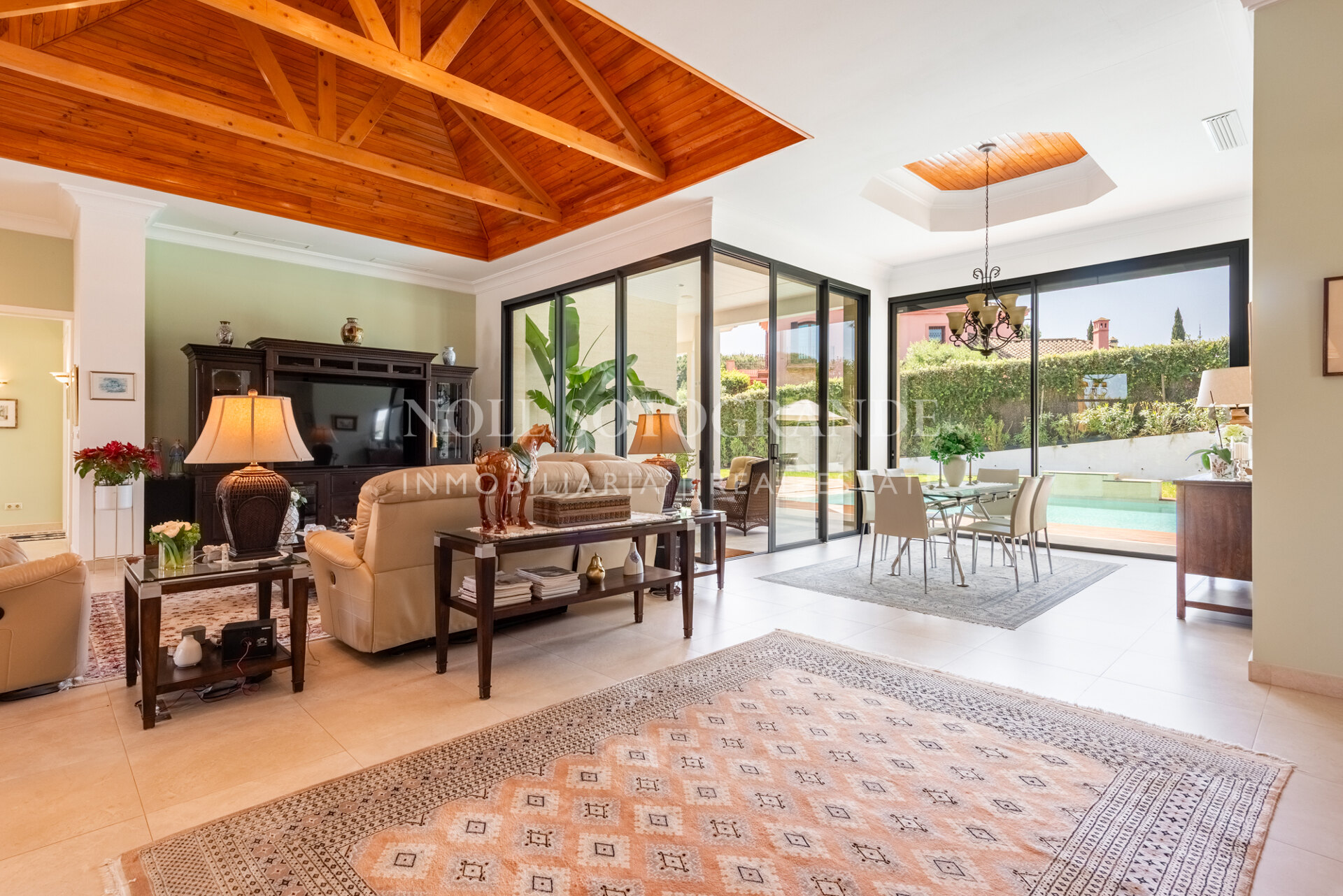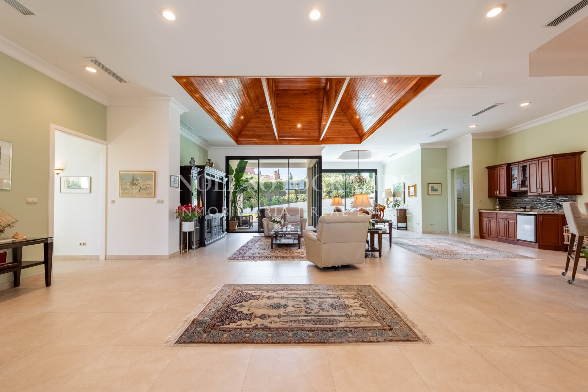 Positioned on one of the highest and most privileged points in Sotogrande Alto, this elegant single-level residence enjoys a peaceful setting combined with excellent proximity to key lifestyle destinations, including the SO/ Sotogrande Spa & Golf Resort and the renowned Sotogrande International School. Designed as a refined bungalow with clean architectural lines and a timeless aesthetic, the property offers a practical and highly liveable American-style open-plan layout that emphasizes comfort, natural light, and effortless day-to-day living. The main living area flows seamlessly into the dining space and kitchen, creating a welcoming environment ideally suited for both family life and entertaining.