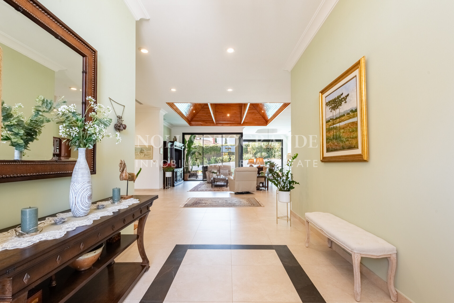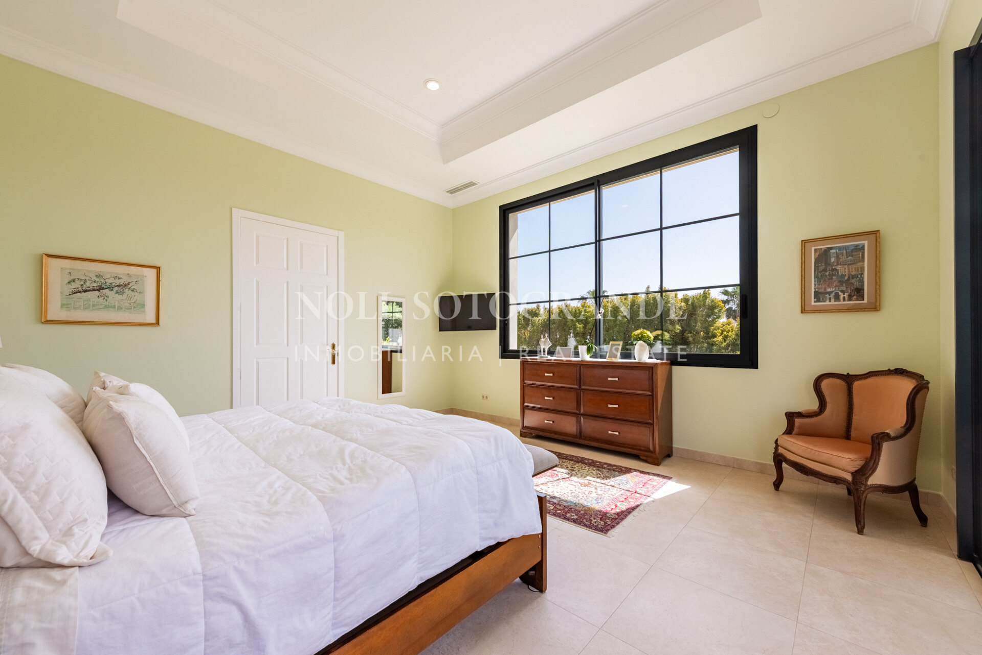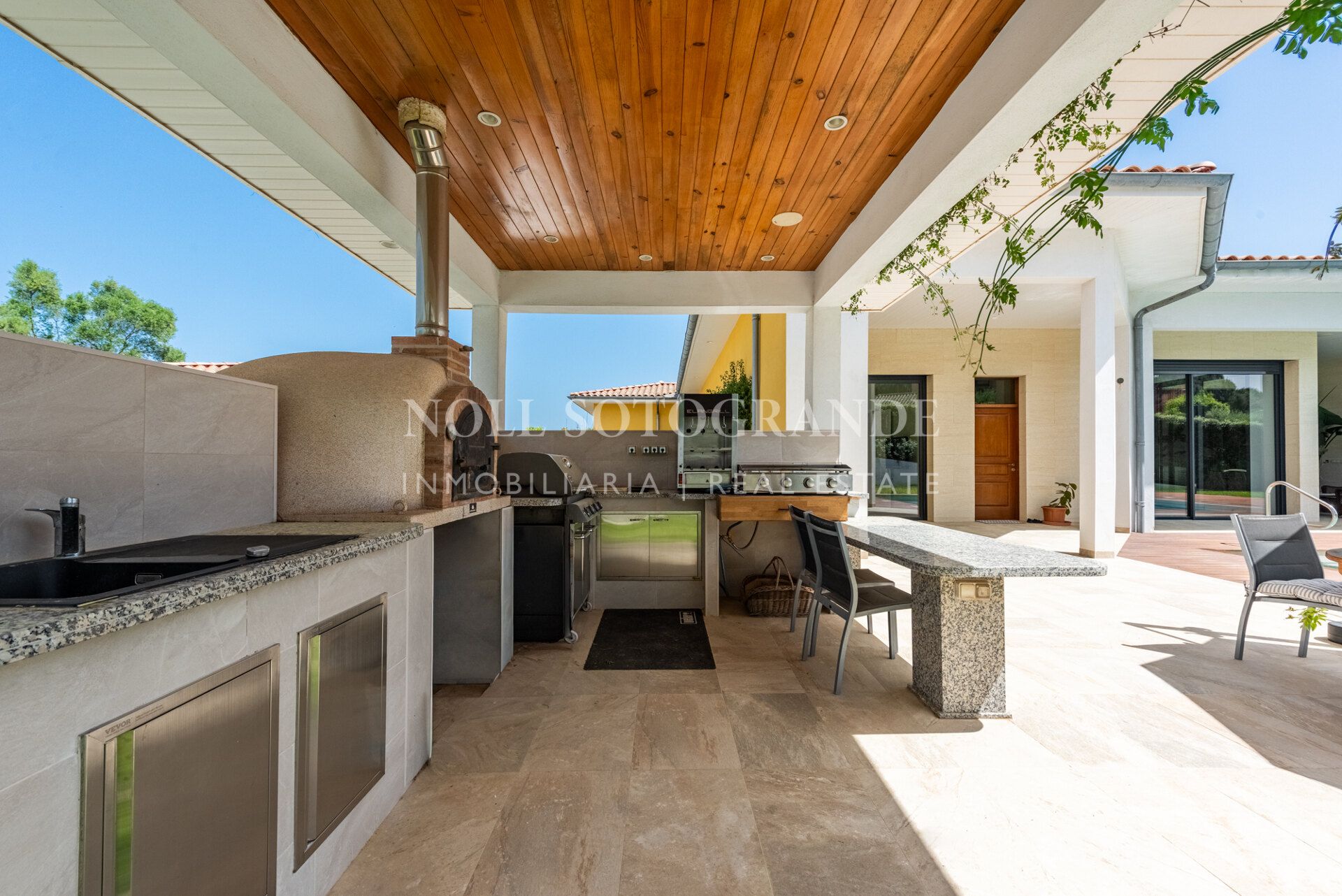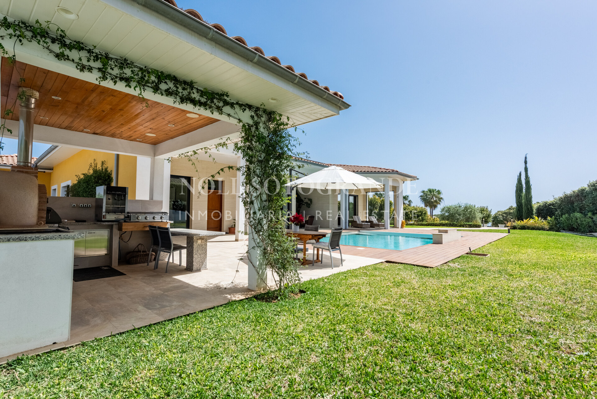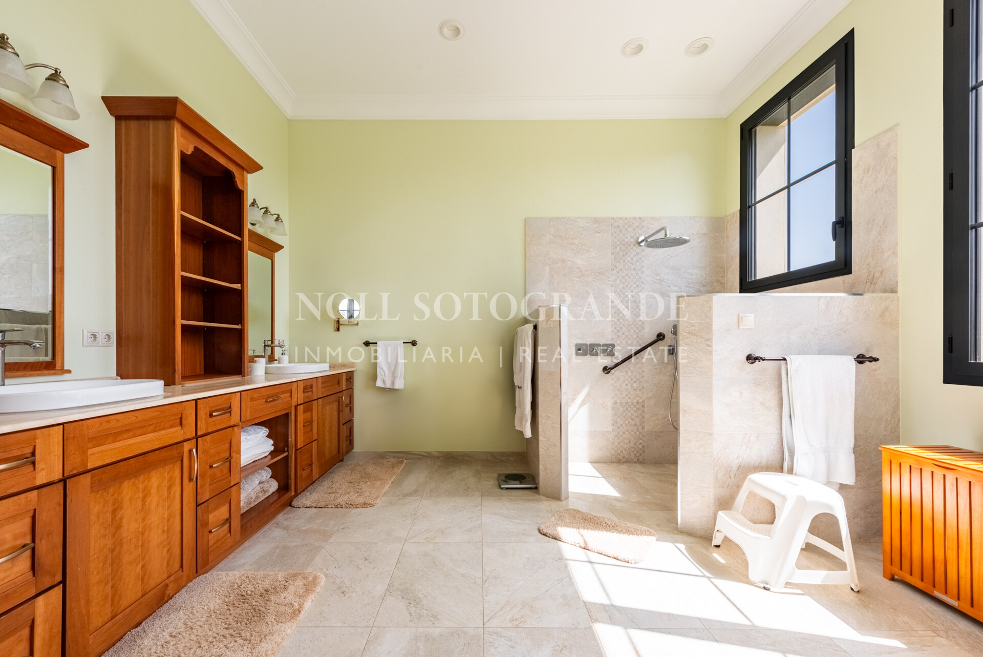 Positioned on one of the highest and most privileged points in Sotogrande Alto, this elegant single-level residence enjoys a peaceful setting combined with excellent proximity to key lifestyle destinations, including the SO/ Sotogrande Spa & Golf Resort and the renowned Sotogrande International School. Designed as a refined bungalow with clean architectural lines and a timeless aesthetic, the property offers a practical and highly liveable American-style open-plan layout that emphasizes comfort, natural light, and effortless day-to-day living. The main living area flows seamlessly into the dining space and kitchen, creating a welcoming environment ideally suited for both family life and entertaining.