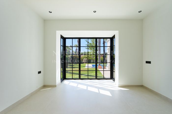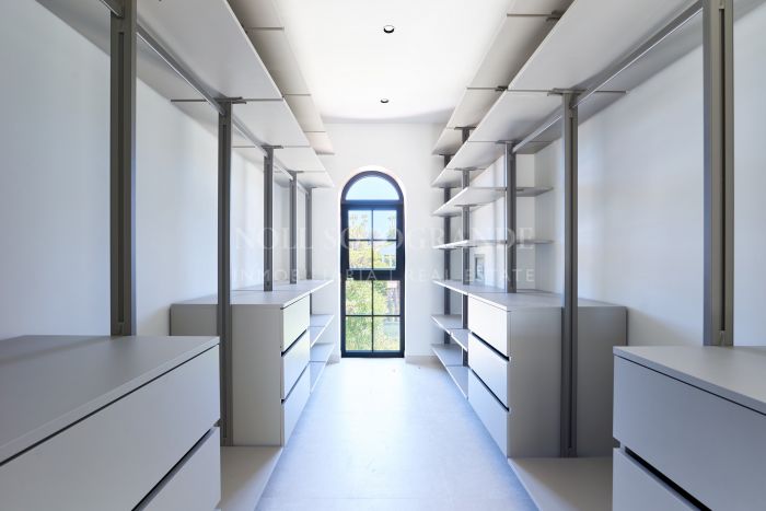 Premium details include underfloor heating in the bathrooms, Reynaers windows, central air conditioning, and a marble fireplace. The exterior blends the charm of a traditional cortijo with a clean, contemporary style — offering a perfect mix of comfort, privacy, and elegance in one of Sotogrande’s best locations.