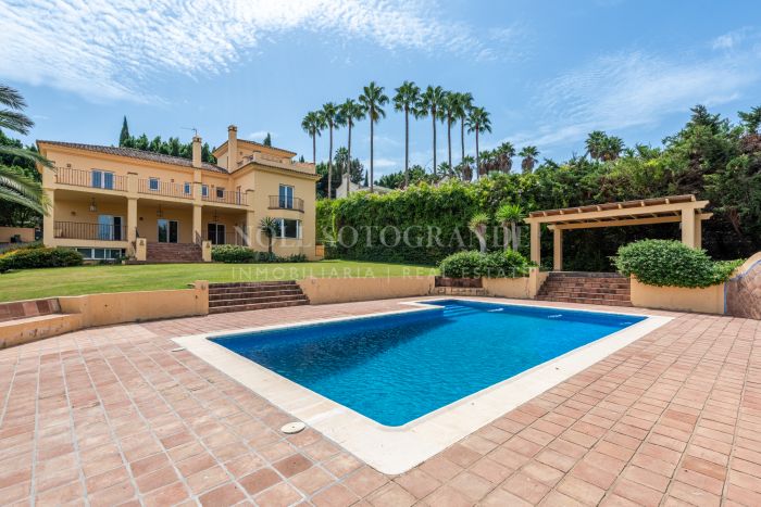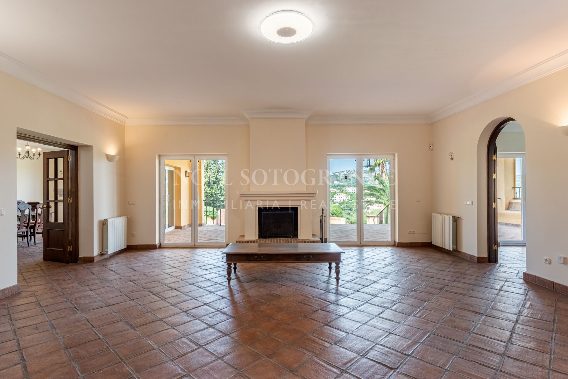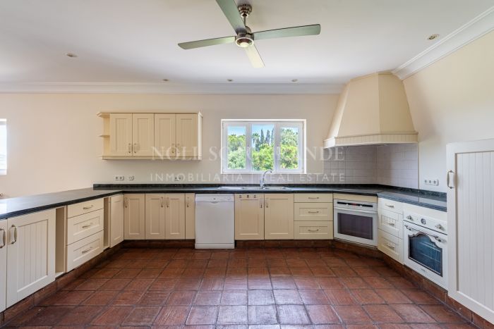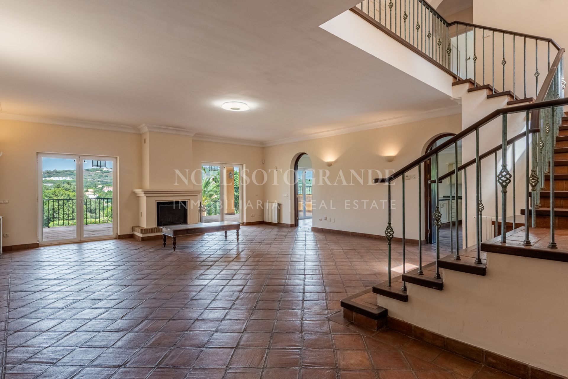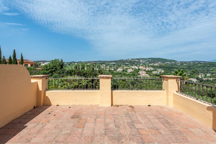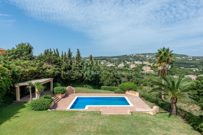 This Andalusian-style villa is located just five minutes by car from the International School, Valderrama Golf Course and SO Hotel. It has six bedrooms and five bathrooms and features bright interiors, terracotta floors and two cosy fireplaces. Inside, the house is bright and inviting.