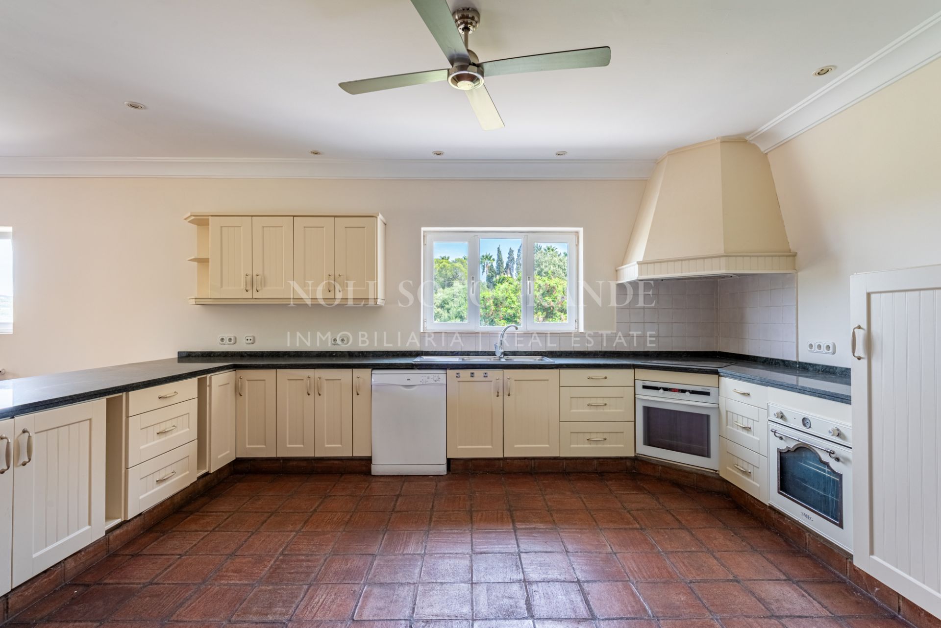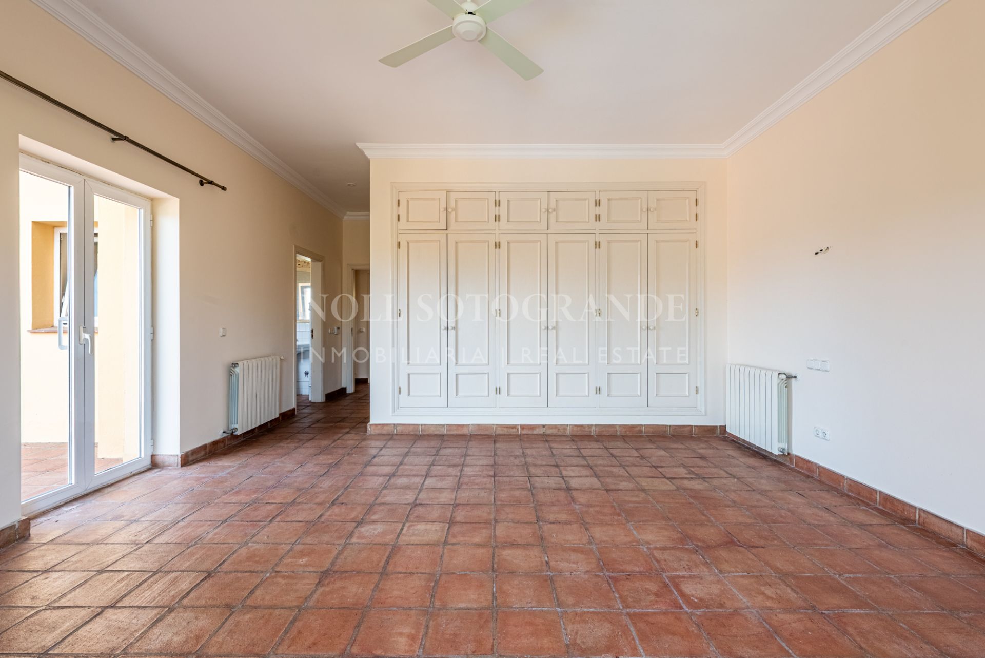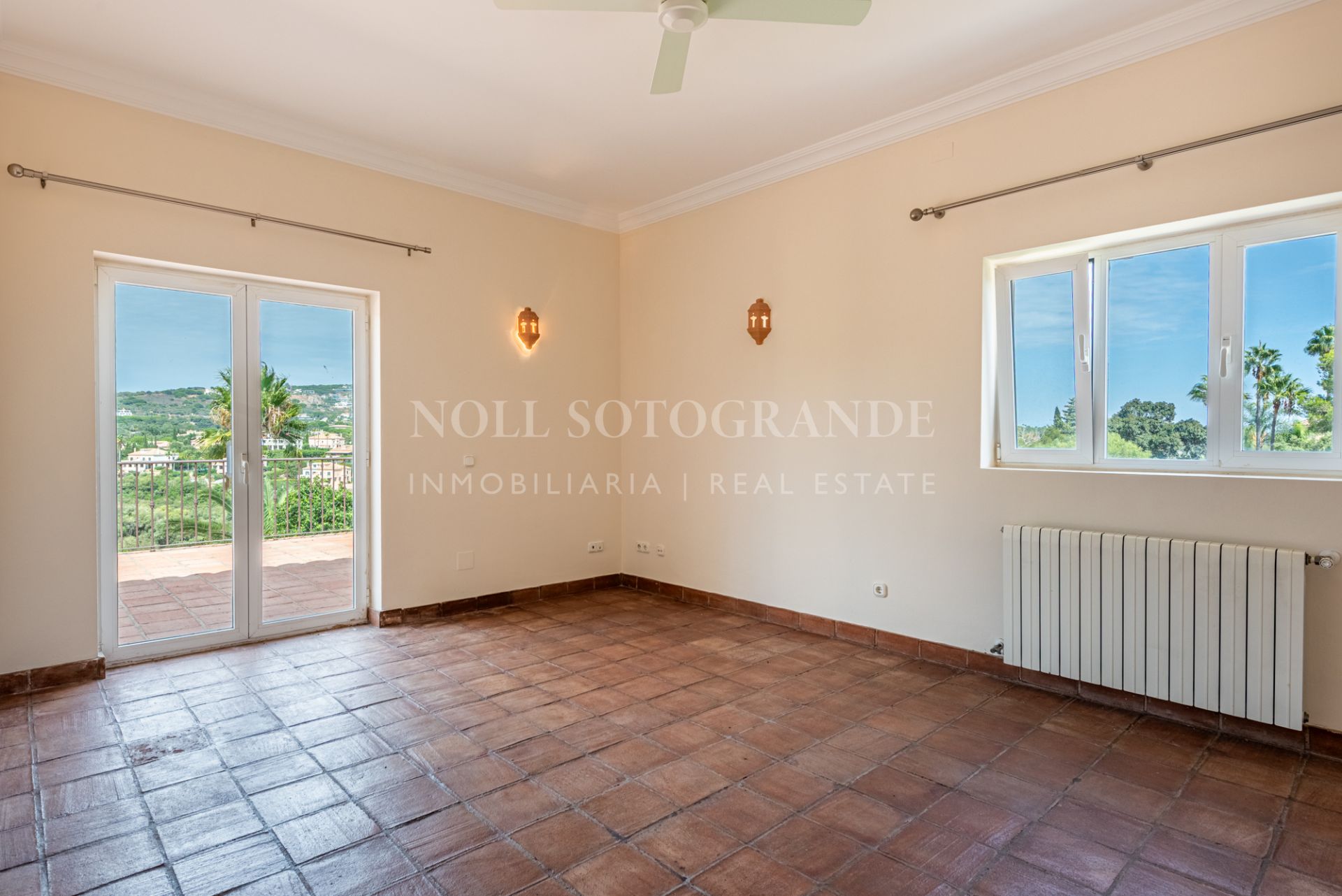 This Andalusian-style villa is located just five minutes by car from the International School, Valderrama Golf Course and SO Hotel. It has six bedrooms and five bathrooms and features bright interiors, terracotta floors and two cosy fireplaces. Inside, the house is bright and inviting.