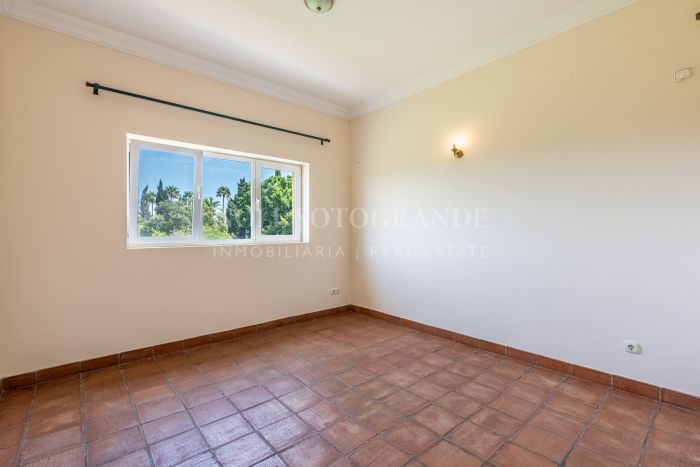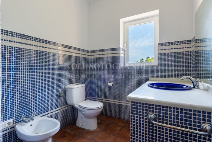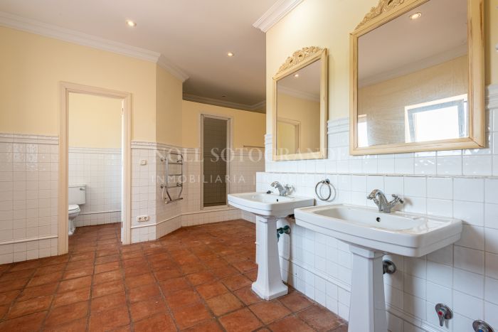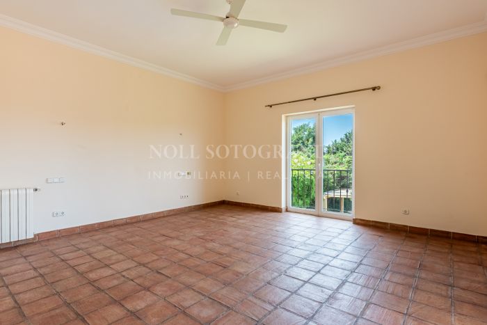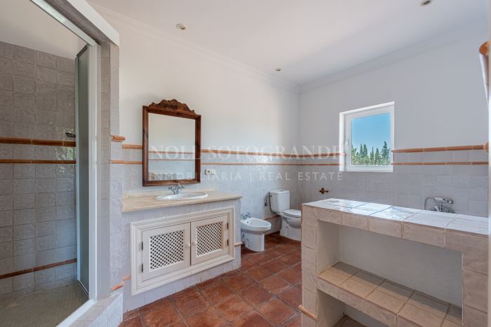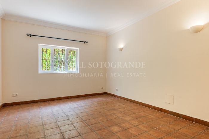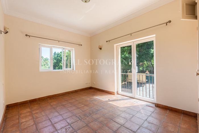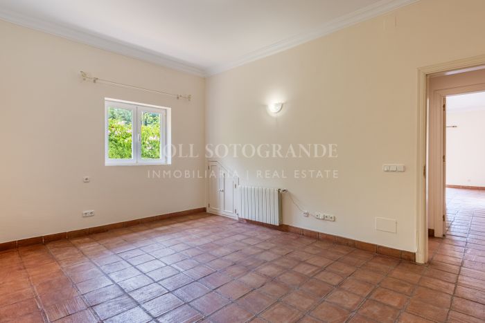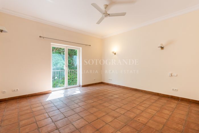 Upstairs, the master suite features a private bathroom, walk-in wardrobe, Juliet balcony, and access to a terrace with panoramic views. Additional bedrooms and bathrooms offer plenty of space for family and guests. An office with its own terrace and a generous layout across both wings enhance the sense of space. The villa’s outdoor areas are designed for relaxation and entertaining, with a 205 m² terrace, a mature garden, and a swimming pool overlooking the natural surroundings. The large basement has parking for 6–8 cars and can be converted into a gym, cinema room, or staff quarters, adding to the property’s versatility. Terracotta flooring, fitted wardrobes, and central heating complete this family home in a peaceful Sotogrande Alto location.