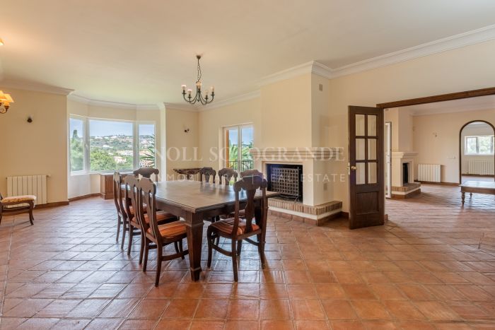 The property combines family comfort with ample potential for customization. Inside, the villa includes eight rooms in total, with six bedrooms and five bathrooms. The welcoming entrance opens to a large living room with fireplace and access to the terrace, while a separate dining room, also with its own fireplace, provides a warm setting for gatherings. The fully fitted kitchen is equipped with integrated appliances and a utility area.
