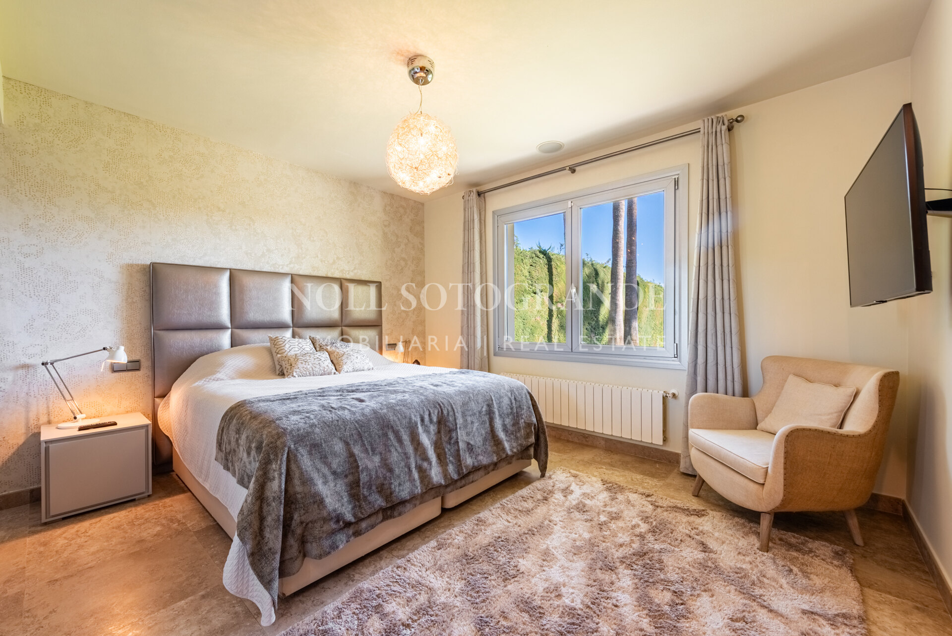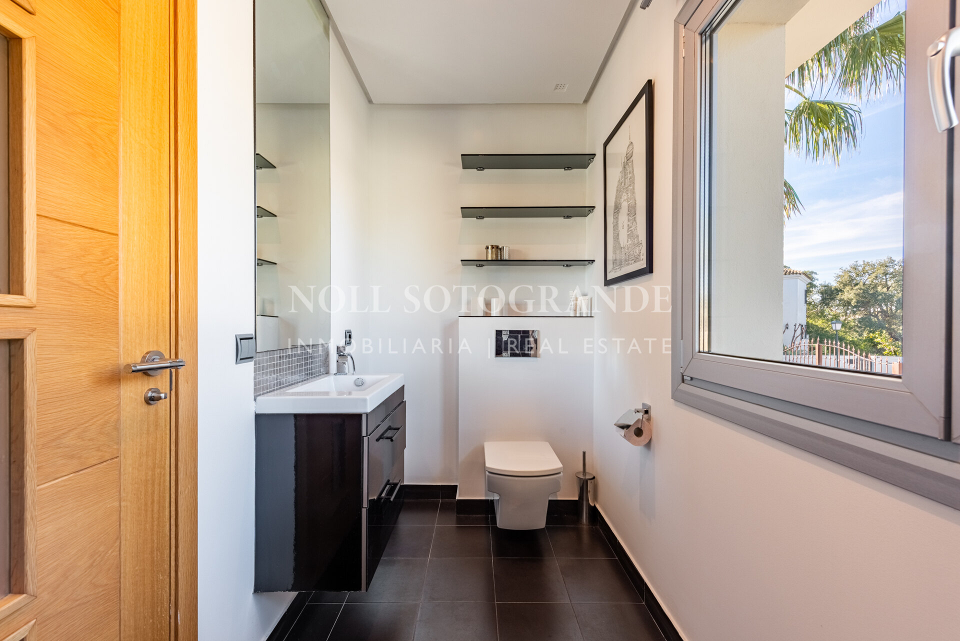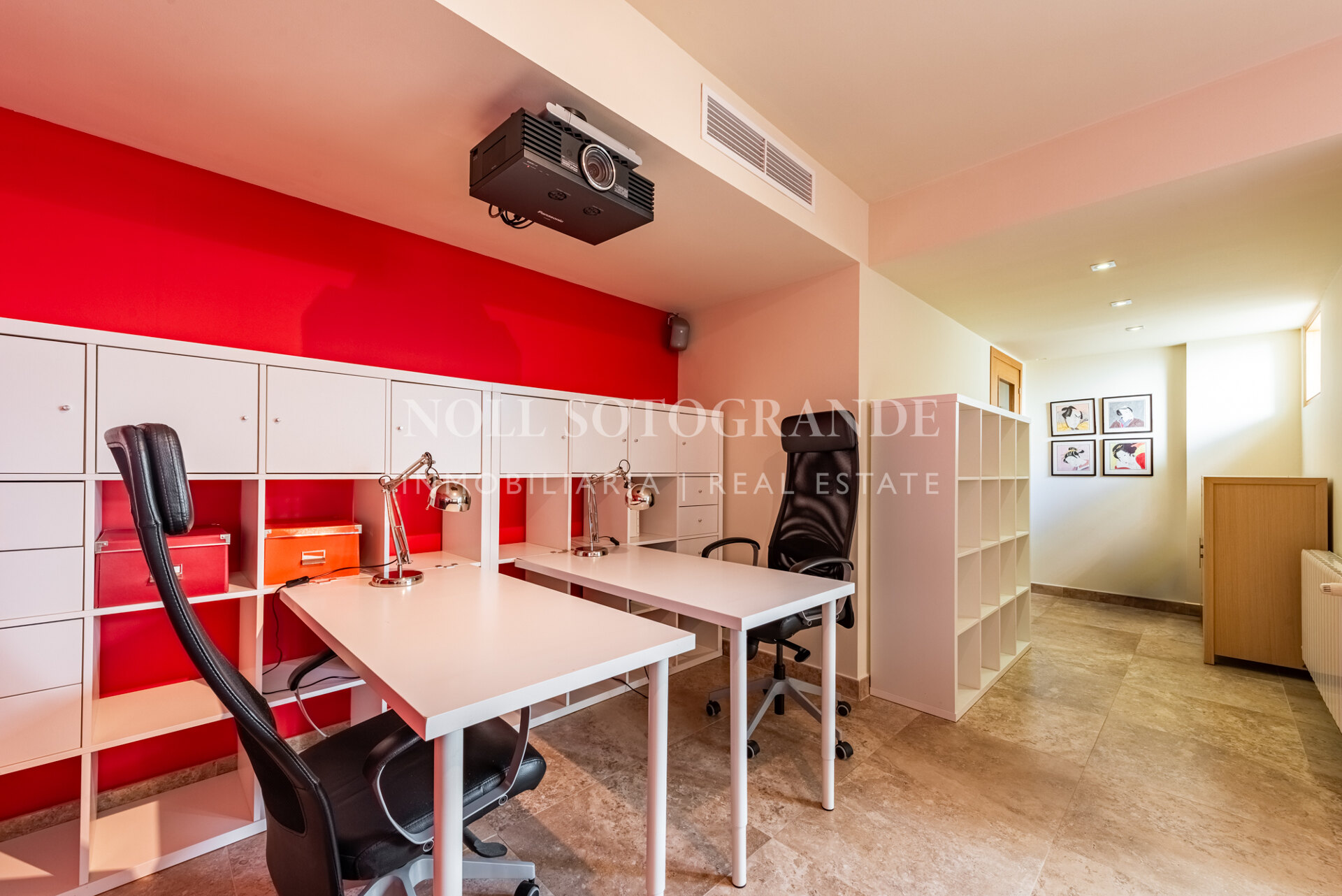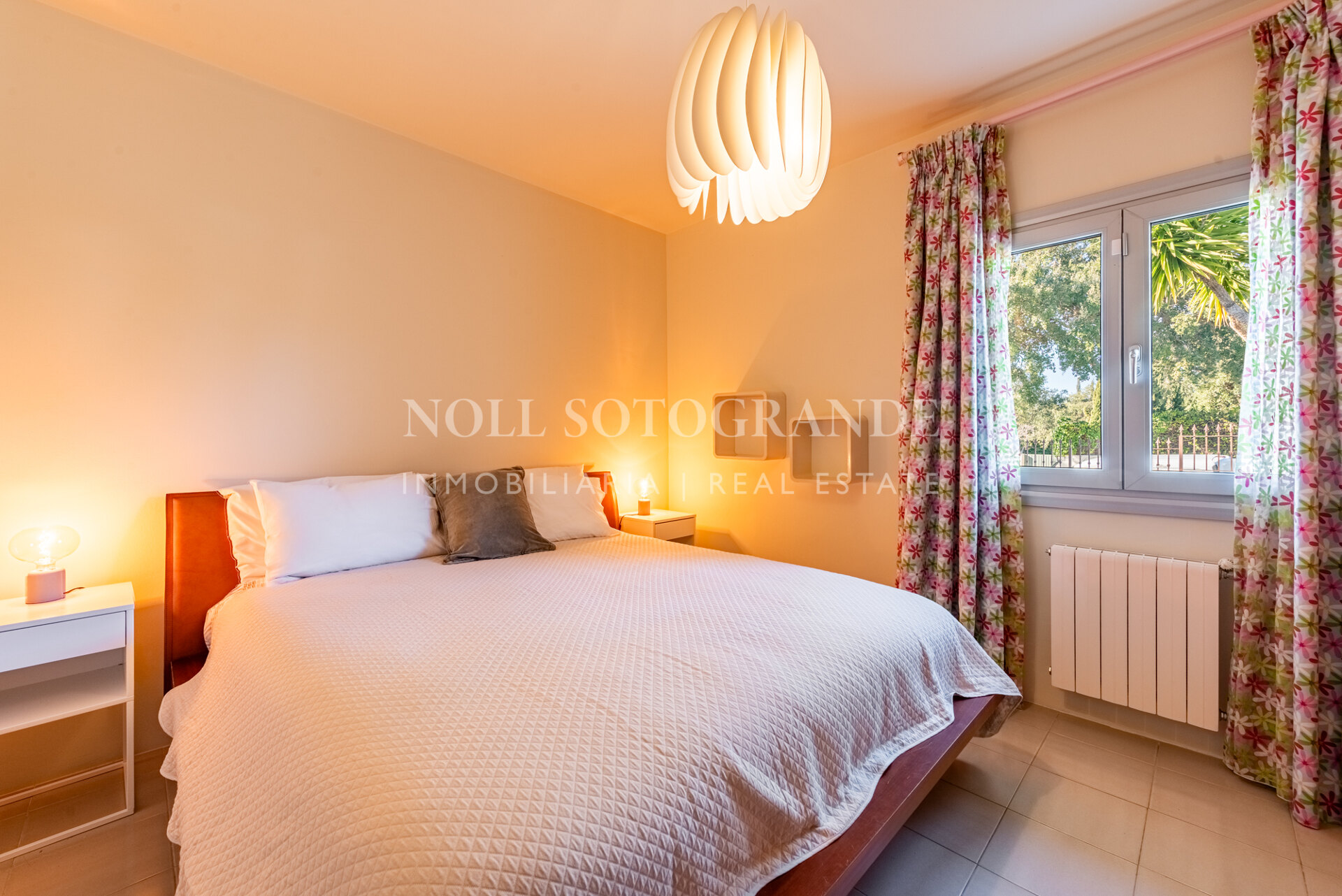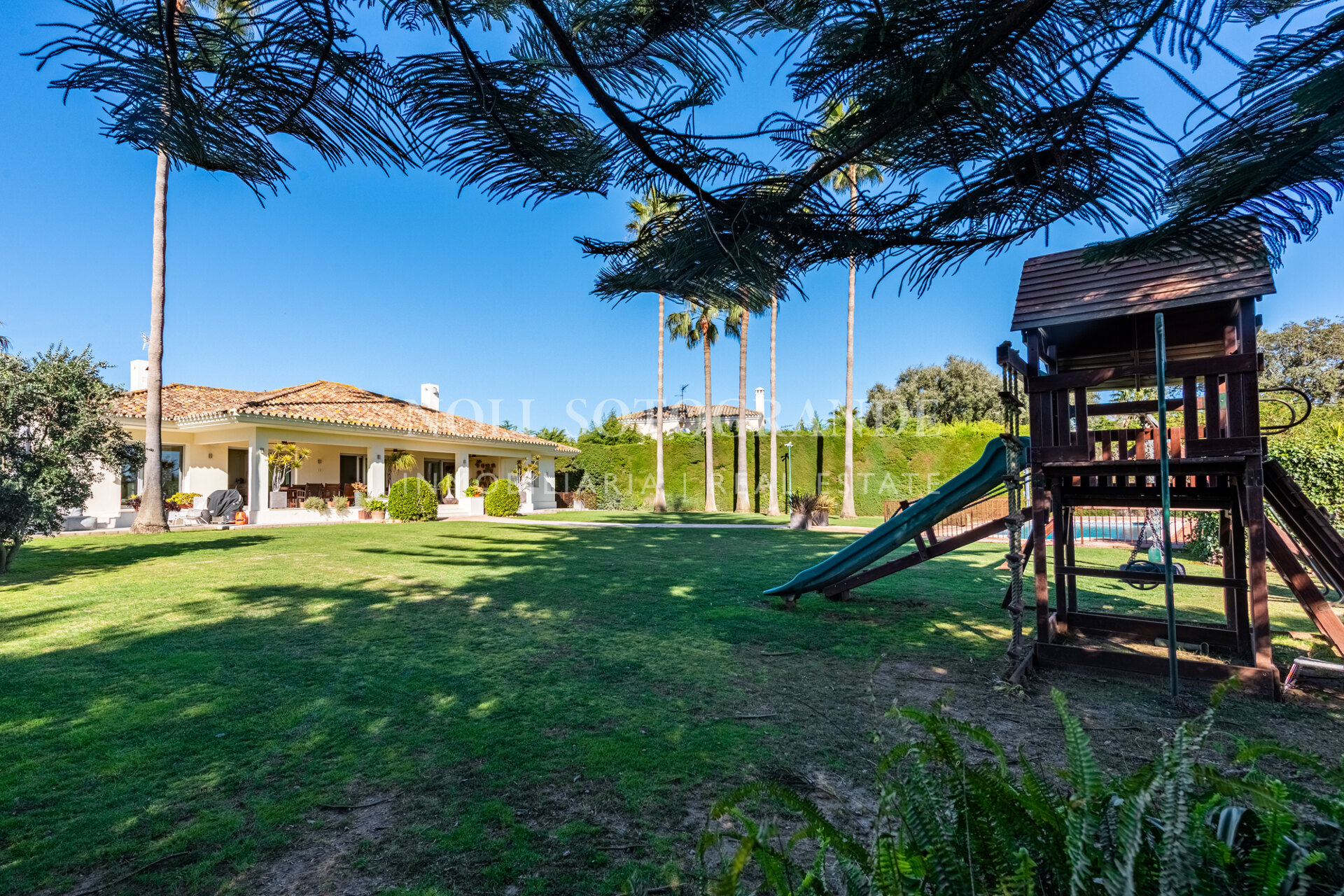 This modern villa is located in the A zone in Sotogrande Costa and is as of now available for long-term rental. The entrance to the villa is over the front garden, which is idyllically planted and very well maintained. On the ground floor of the villa, there is a modern, spacious eat-in kitchen with a dining area, a living room with a gas fireplace, three bedrooms, three bathrooms, and a utility room with a wine fridge and a separate laundry room. From the kitchen and the living area, you get to the spacious covered terrace, where are several sitting areas and a dining area. The very well maintained garden comprises of a fenced swimming pool, a small playground for children, and representative tall palm trees. In the basement of the villa, there is another bedroom with an ensuite bathroom, a work area, and a home cinema. The villa is equipped with central heating, air conditioning, and Fibre-Optic. Garden and pool maintenance are included in the monthly rent.