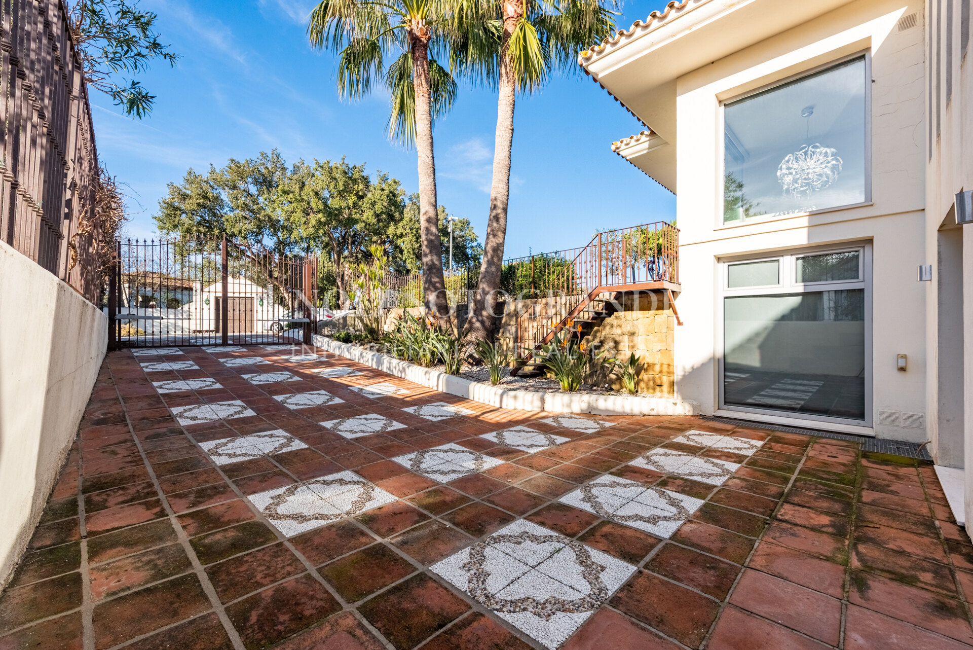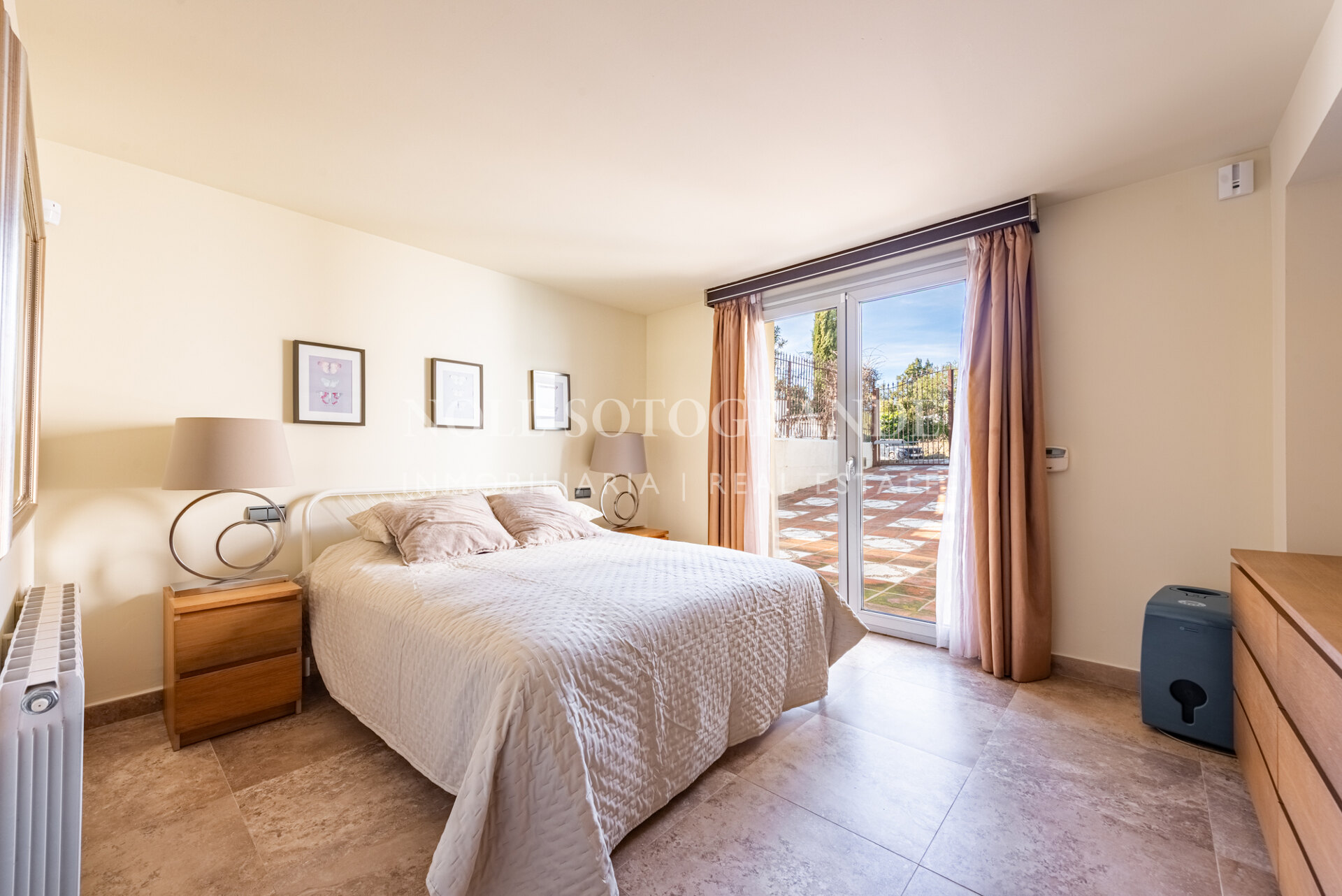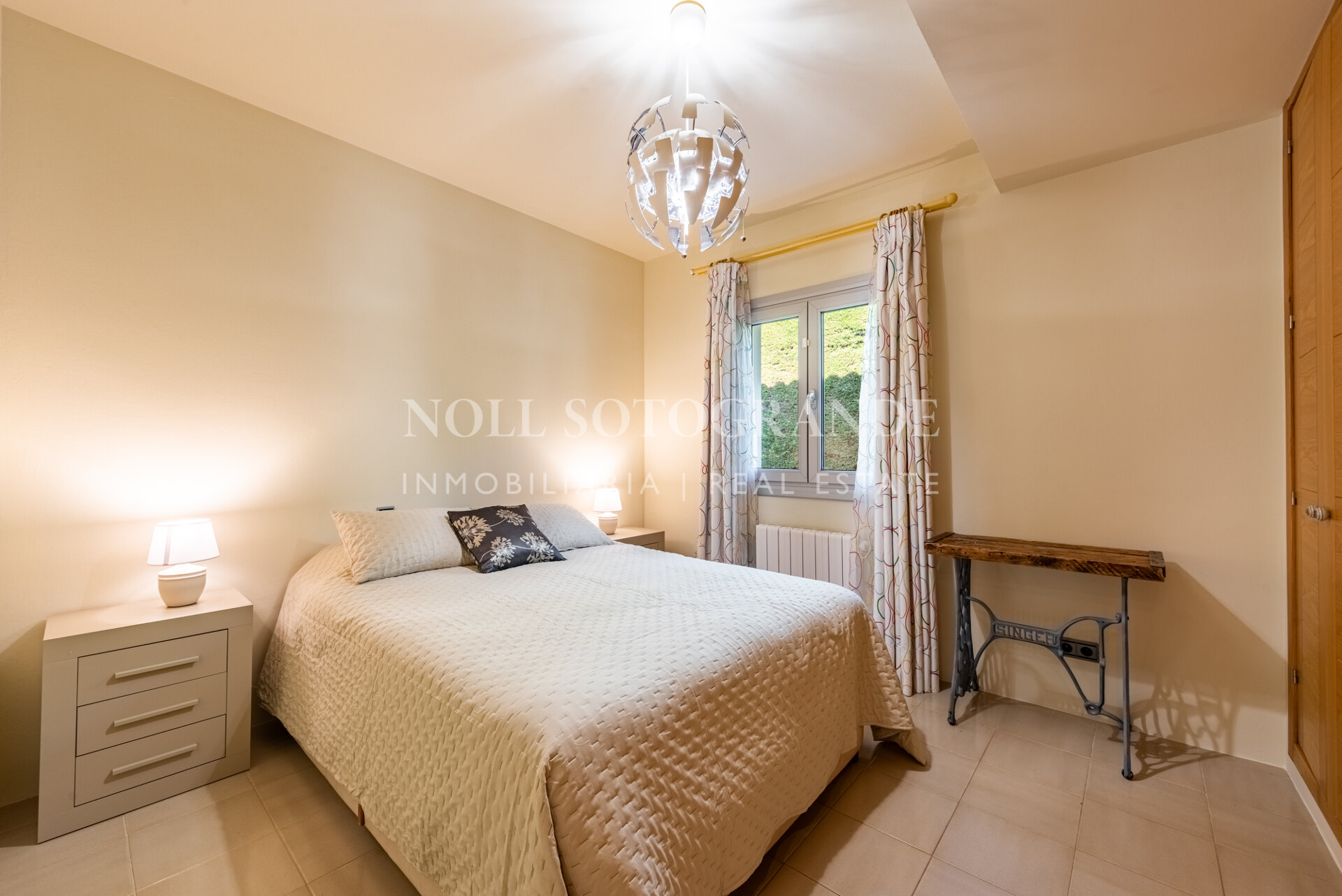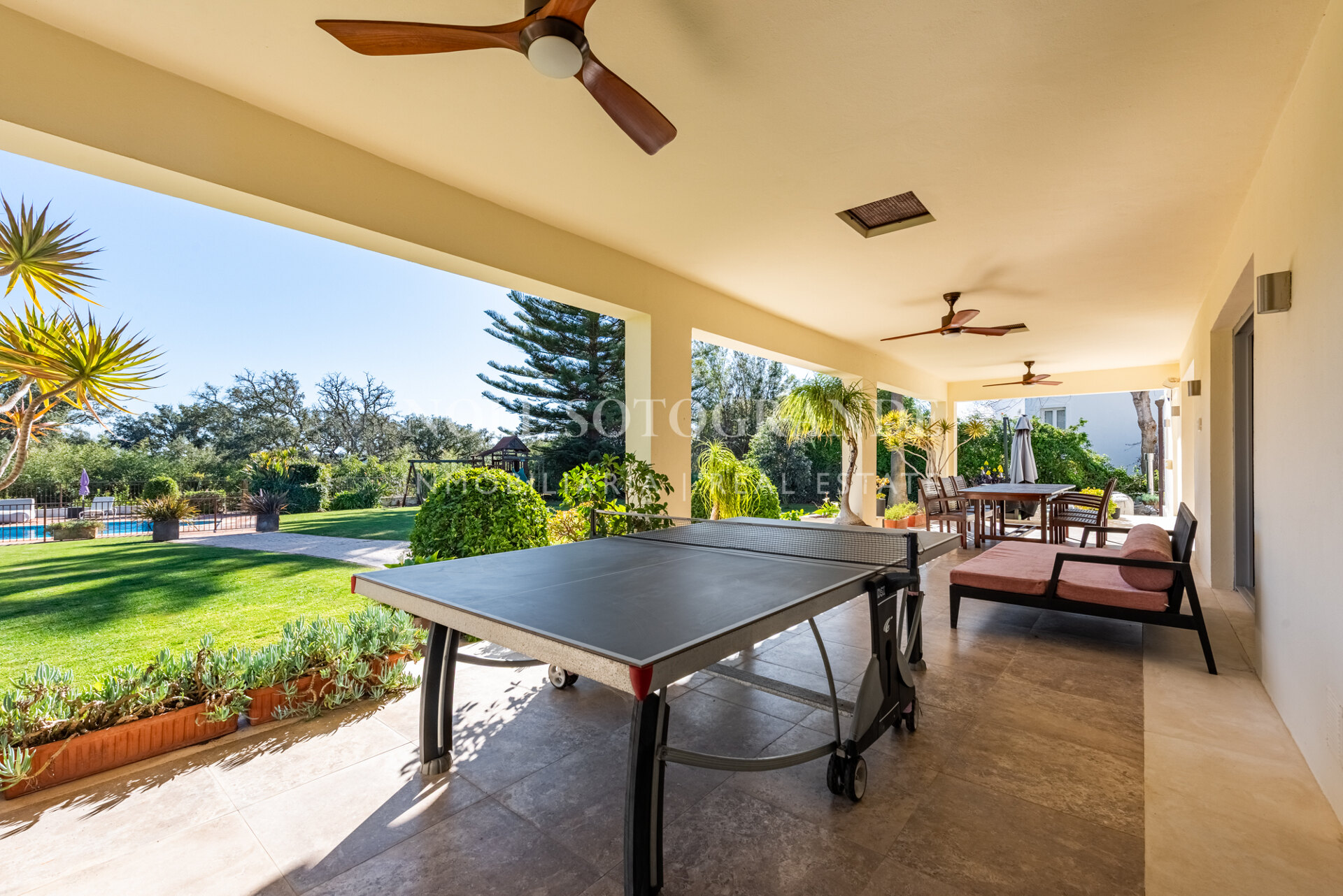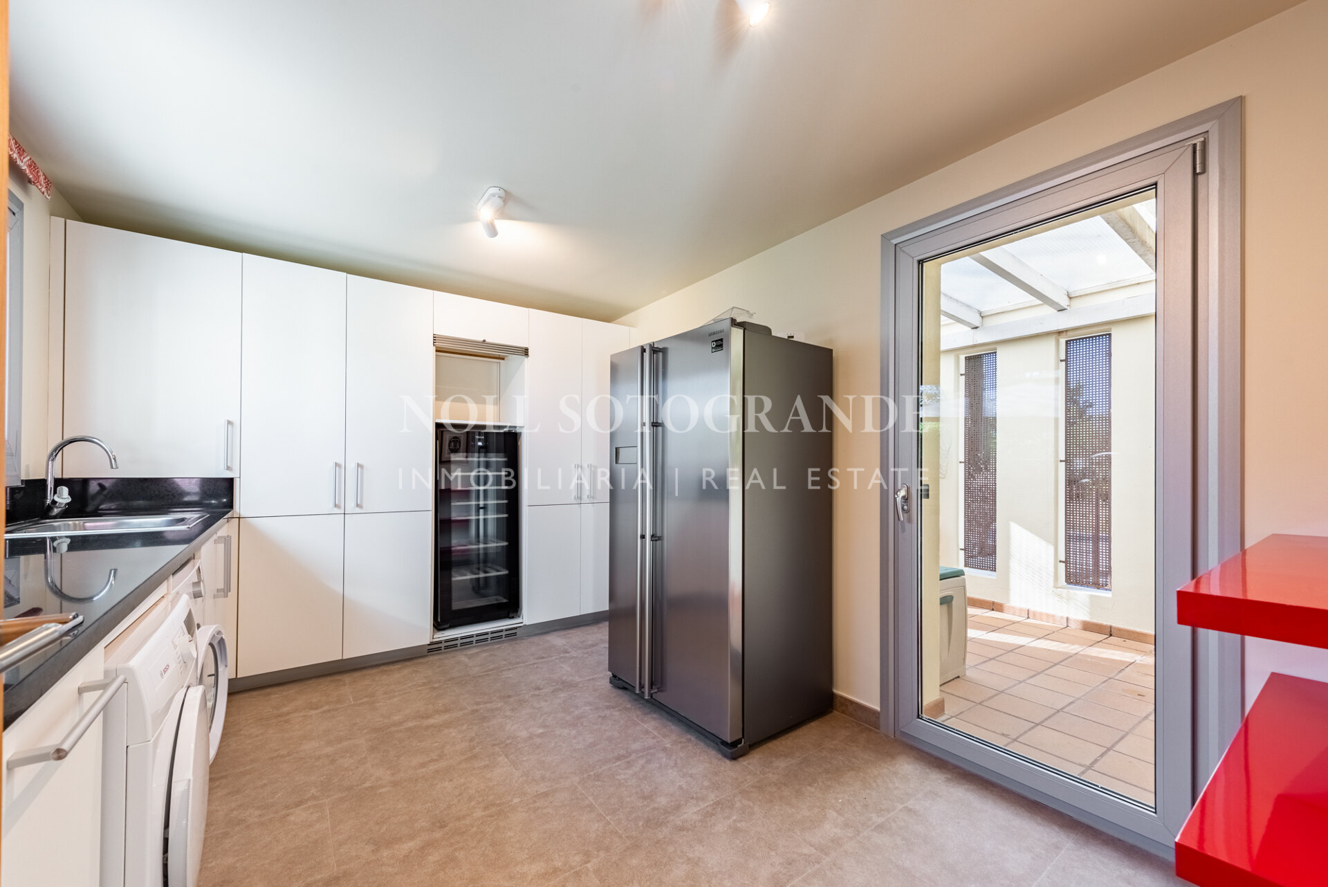 This modern villa is located in the A zone in Sotogrande Costa and is as of now available for long-term rental. The entrance to the villa is over the front garden, which is idyllically planted and very well maintained. On the ground floor of the villa, there is a modern, spacious eat-in kitchen with a dining area, a living room with a gas fireplace, three bedrooms, three bathrooms, and a utility room with a wine fridge and a separate laundry room. From the kitchen and the living area, you get to the spacious covered terrace, where are several sitting areas and a dining area. The very well maintained garden comprises of a fenced swimming pool, a small playground for children, and representative tall palm trees. In the basement of the villa, there is another bedroom with an ensuite bathroom, a work area, and a home cinema. The villa is equipped with central heating, air conditioning, and Fibre-Optic. Garden and pool maintenance are included in the monthly rent.