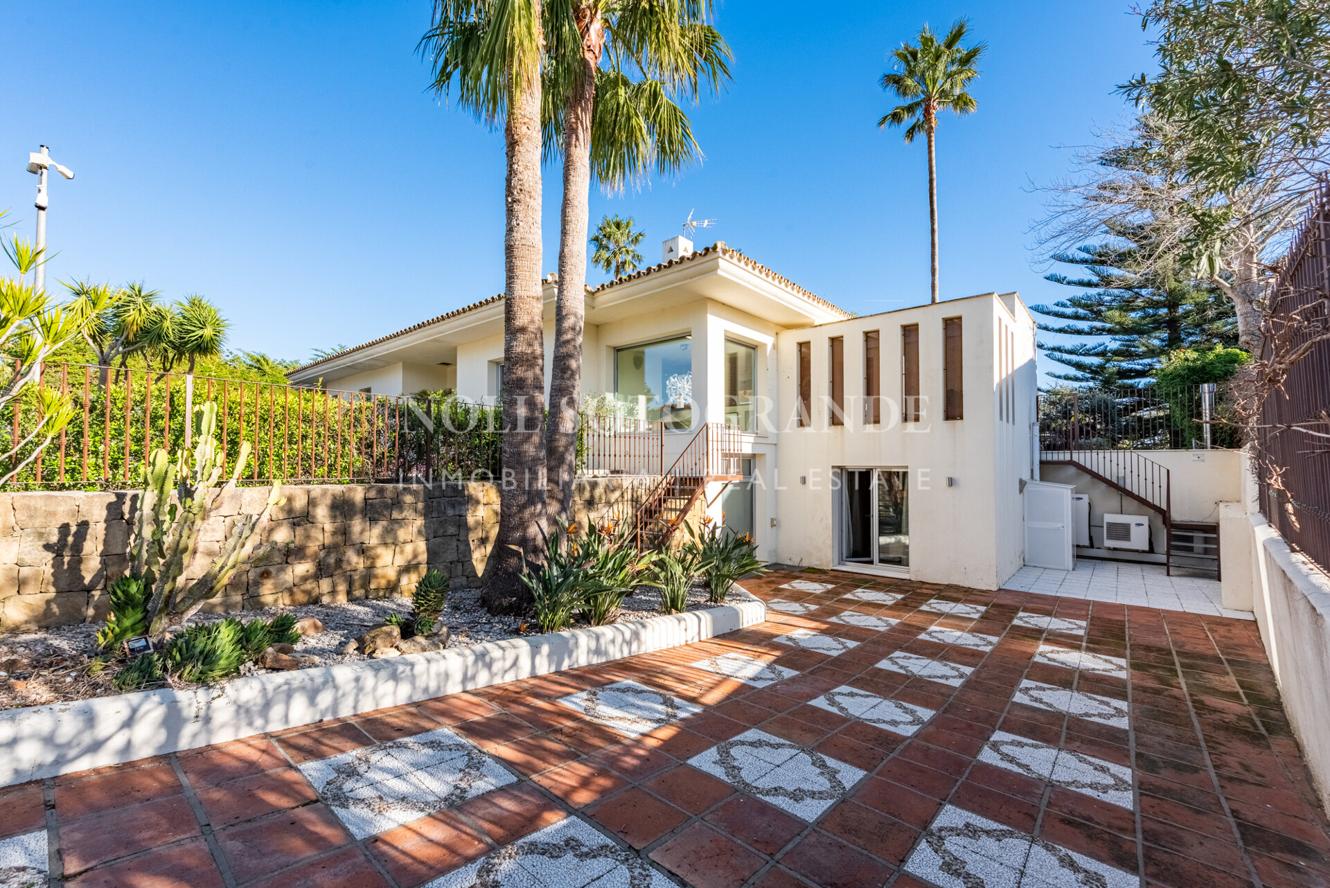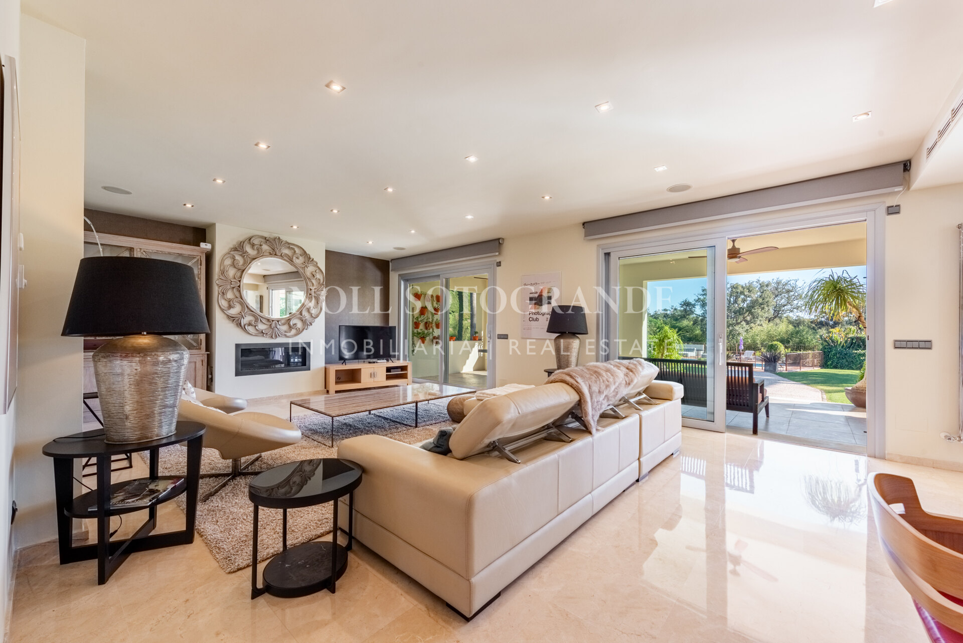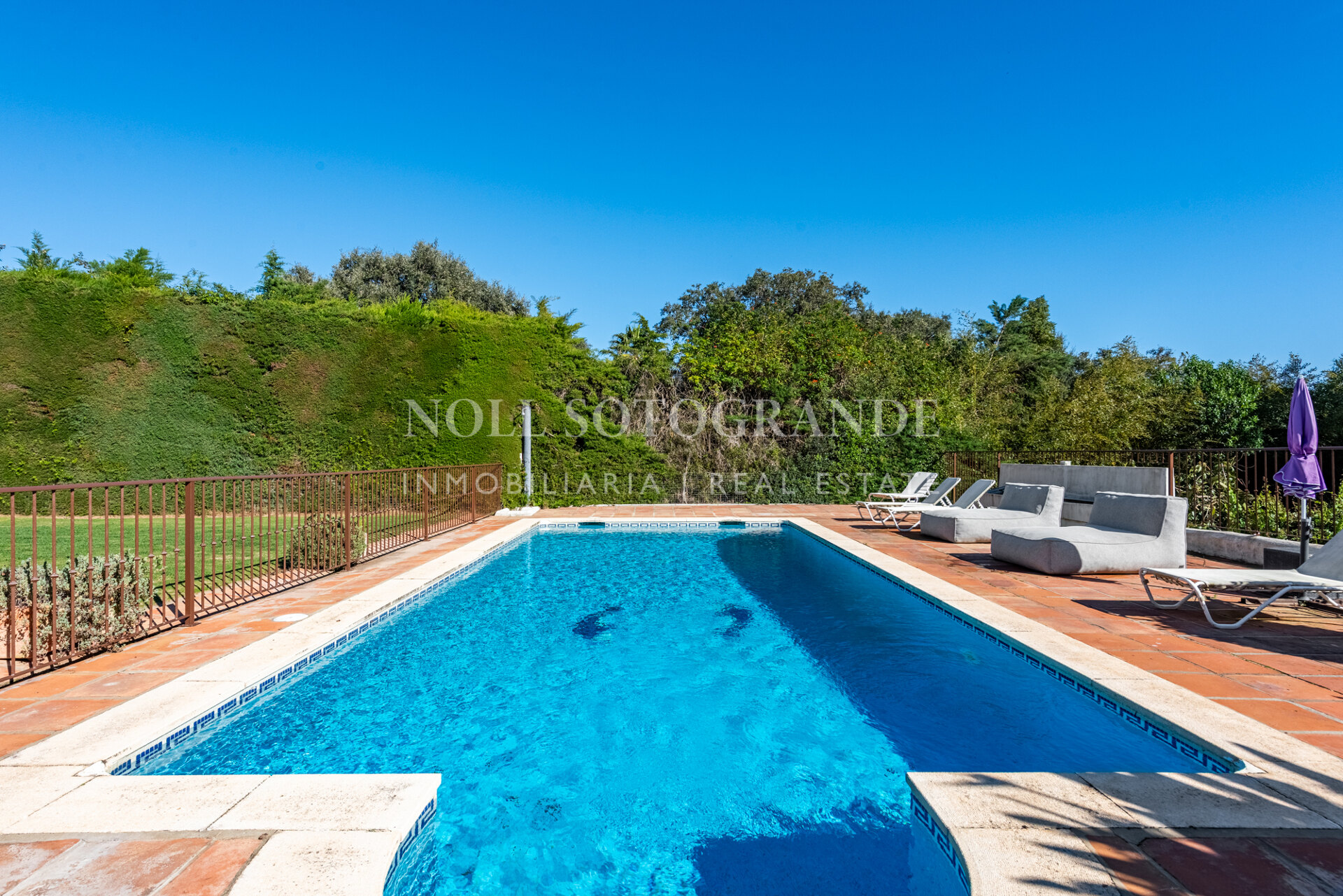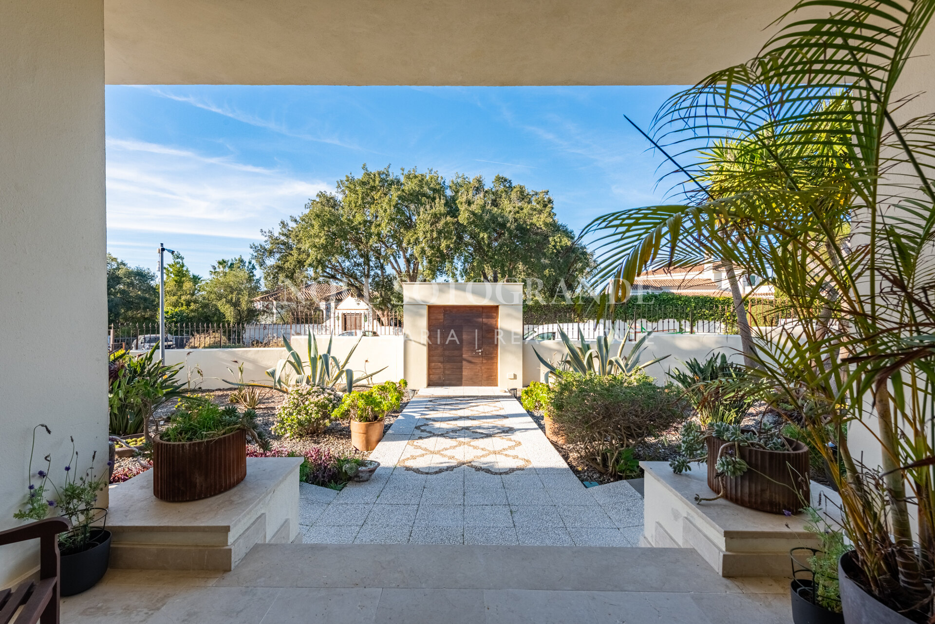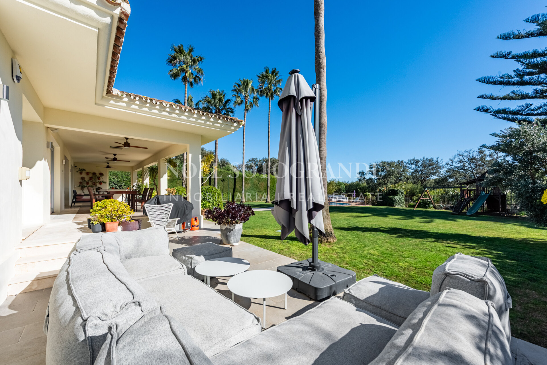 This modern villa is located in the A zone in Sotogrande Costa and is as of now available for long-term rental. The entrance to the villa is over the front garden, which is idyllically planted and very well maintained. On the ground floor of the villa, there is a modern, spacious eat-in kitchen with a dining area, a living room with a gas fireplace, three bedrooms, three bathrooms, and a utility room with a wine fridge and a separate laundry room. From the kitchen and the living area, you get to the spacious covered terrace, where are several sitting areas and a dining area. The very well maintained garden comprises of a fenced swimming pool, a small playground for children, and representative tall palm trees. In the basement of the villa, there is another bedroom with an ensuite bathroom, a work area, and a home cinema. The villa is equipped with central heating, air conditioning, and Fibre-Optic. Garden and pool maintenance are included in the monthly rent.