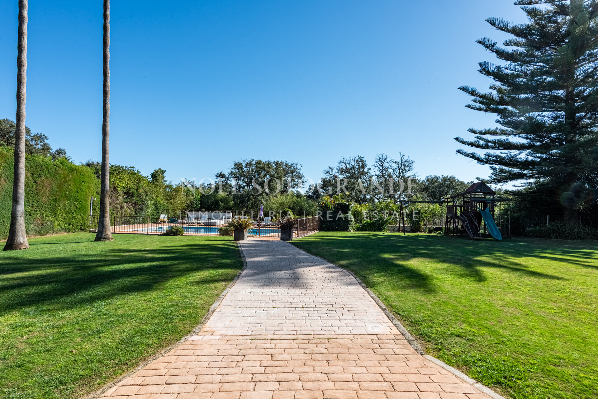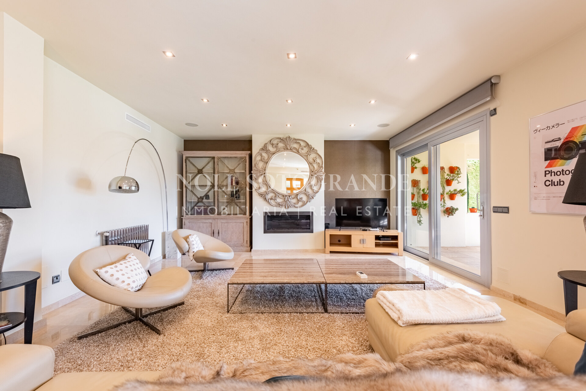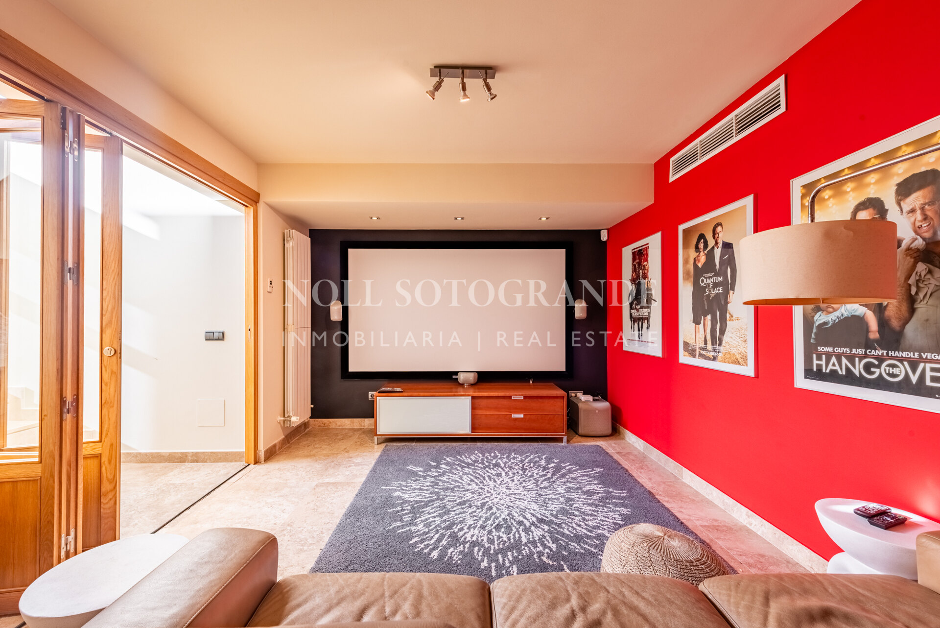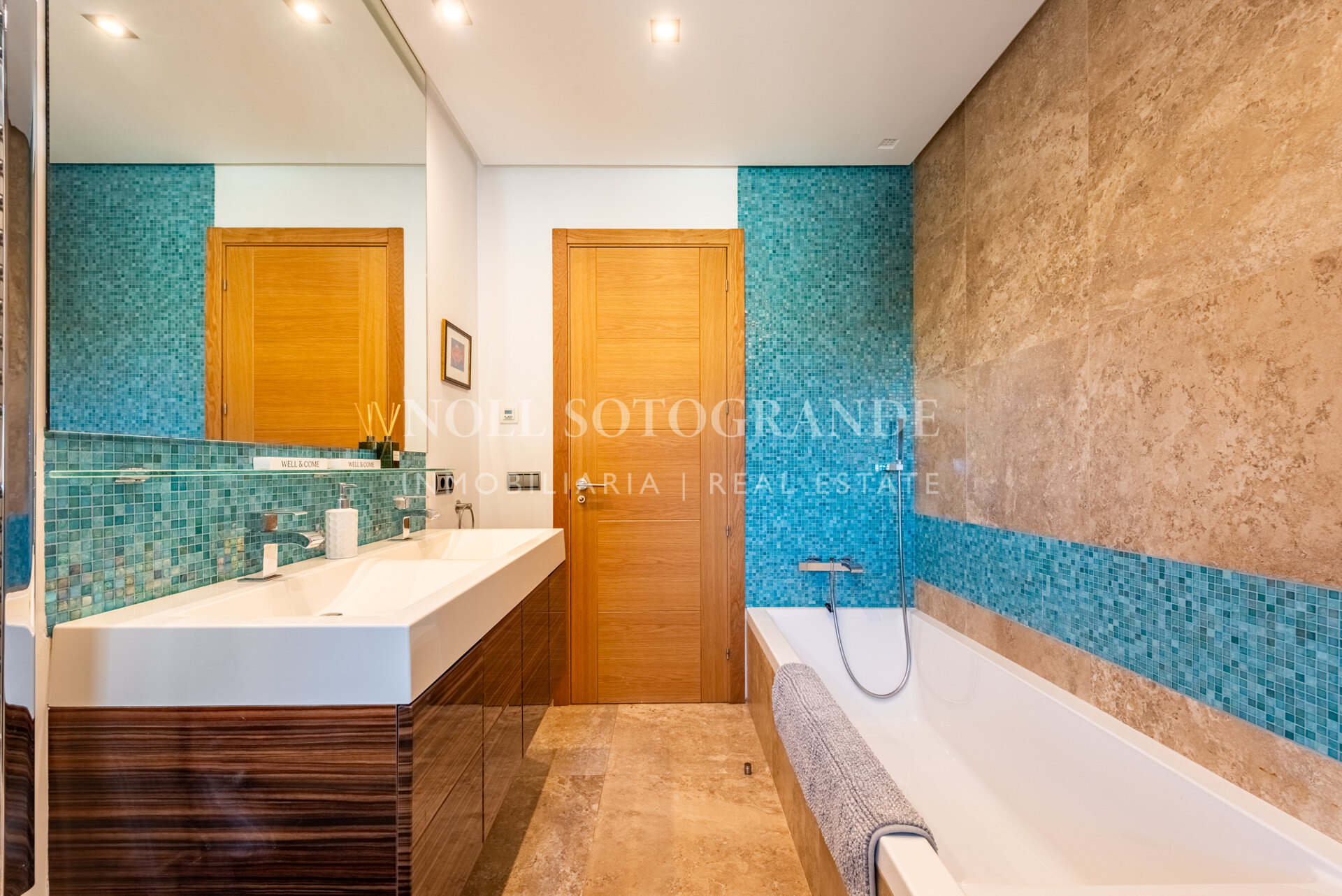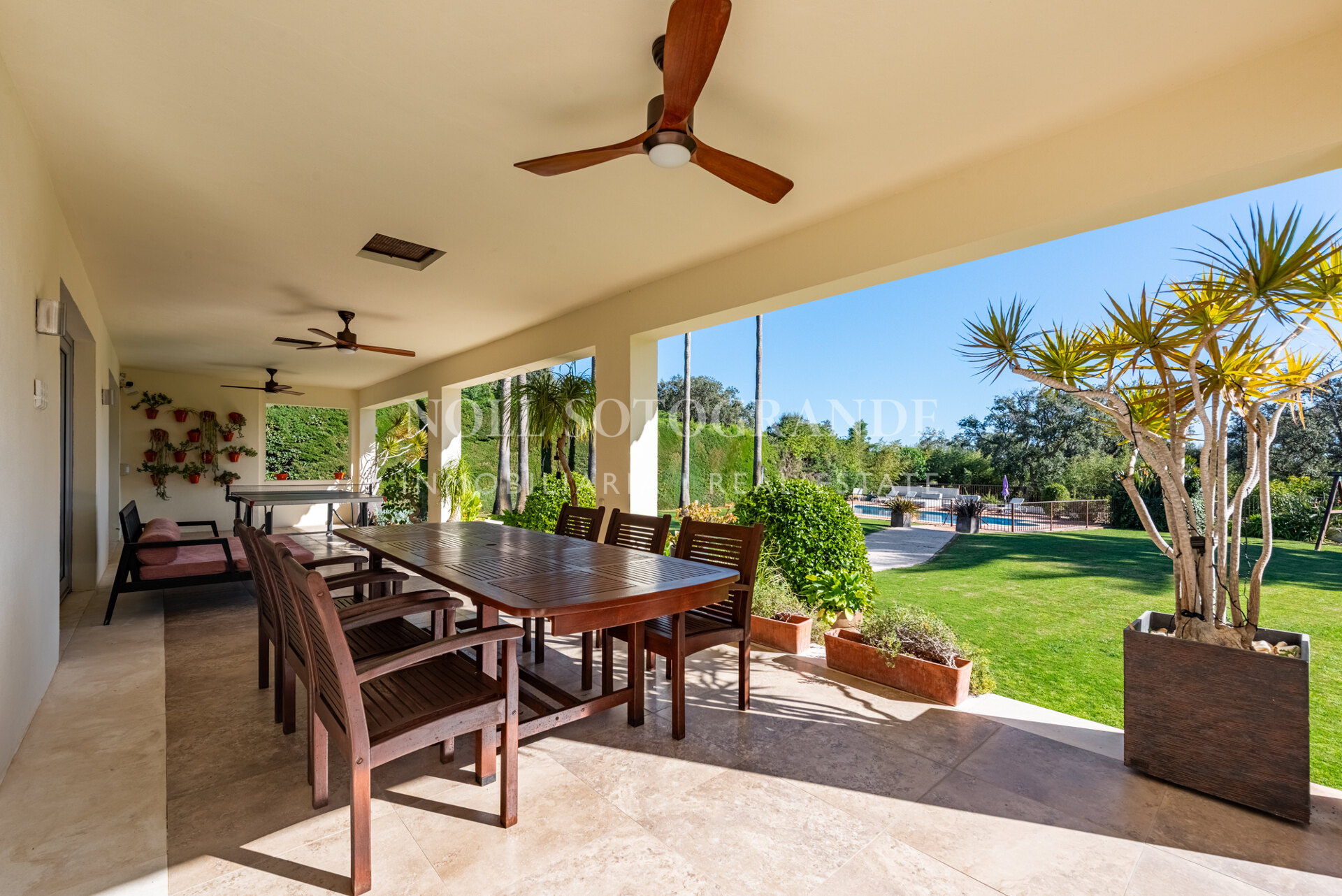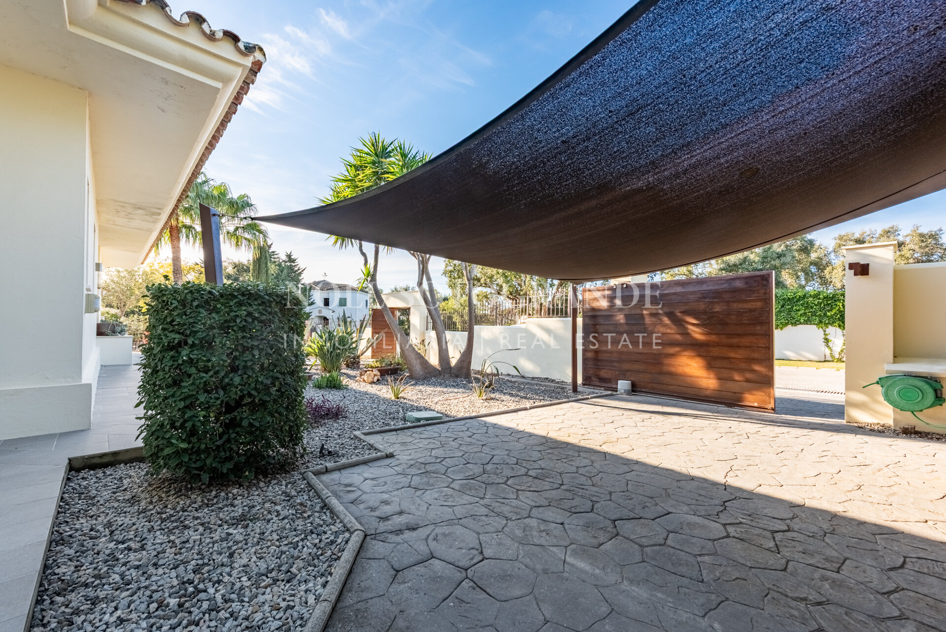 This modern villa is located in the A zone in Sotogrande Costa and is as of now available for long-term rental. The entrance to the villa is over the front garden, which is idyllically planted and very well maintained. On the ground floor of the villa, there is a modern, spacious eat-in kitchen with a dining area, a living room with a gas fireplace, three bedrooms, three bathrooms, and a utility room with a wine fridge and a separate laundry room. From the kitchen and the living area, you get to the spacious covered terrace, where are several sitting areas and a dining area. The very well maintained garden comprises of a fenced swimming pool, a small playground for children, and representative tall palm trees. In the basement of the villa, there is another bedroom with an ensuite bathroom, a work area, and a home cinema. The villa is equipped with central heating, air conditioning, and Fibre-Optic. Garden and pool maintenance are included in the monthly rent.