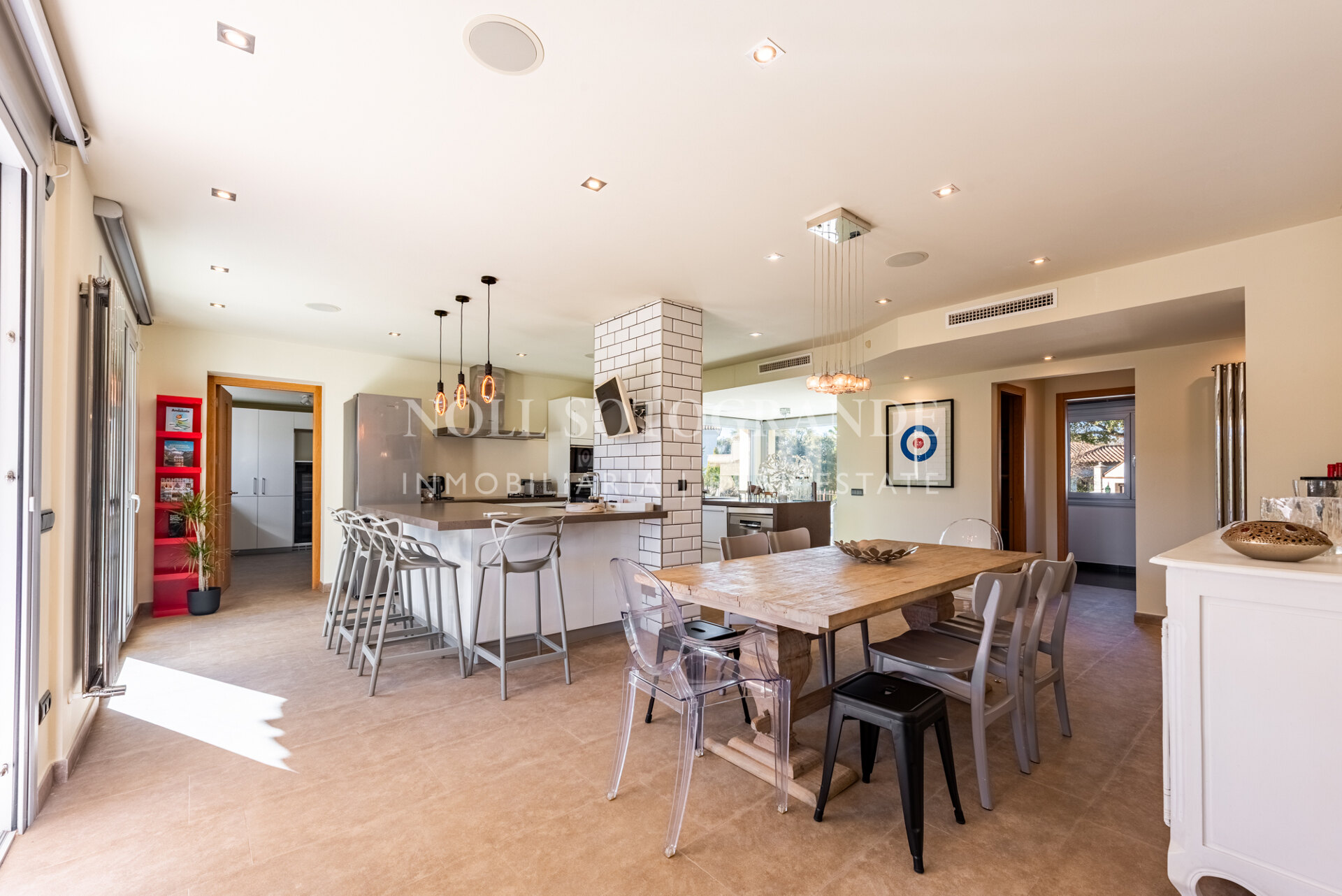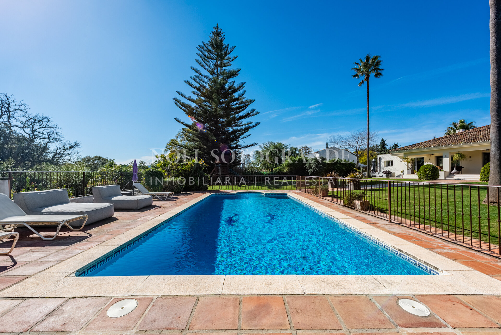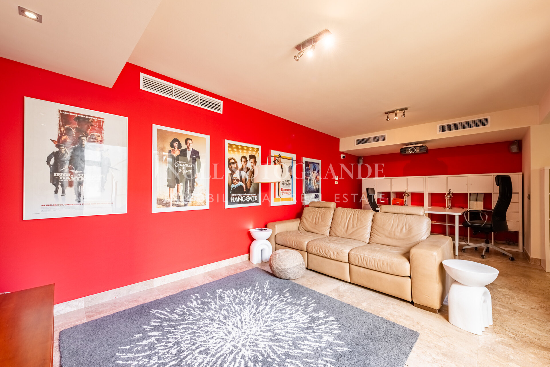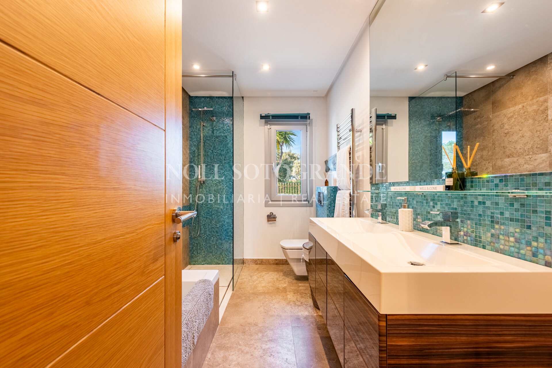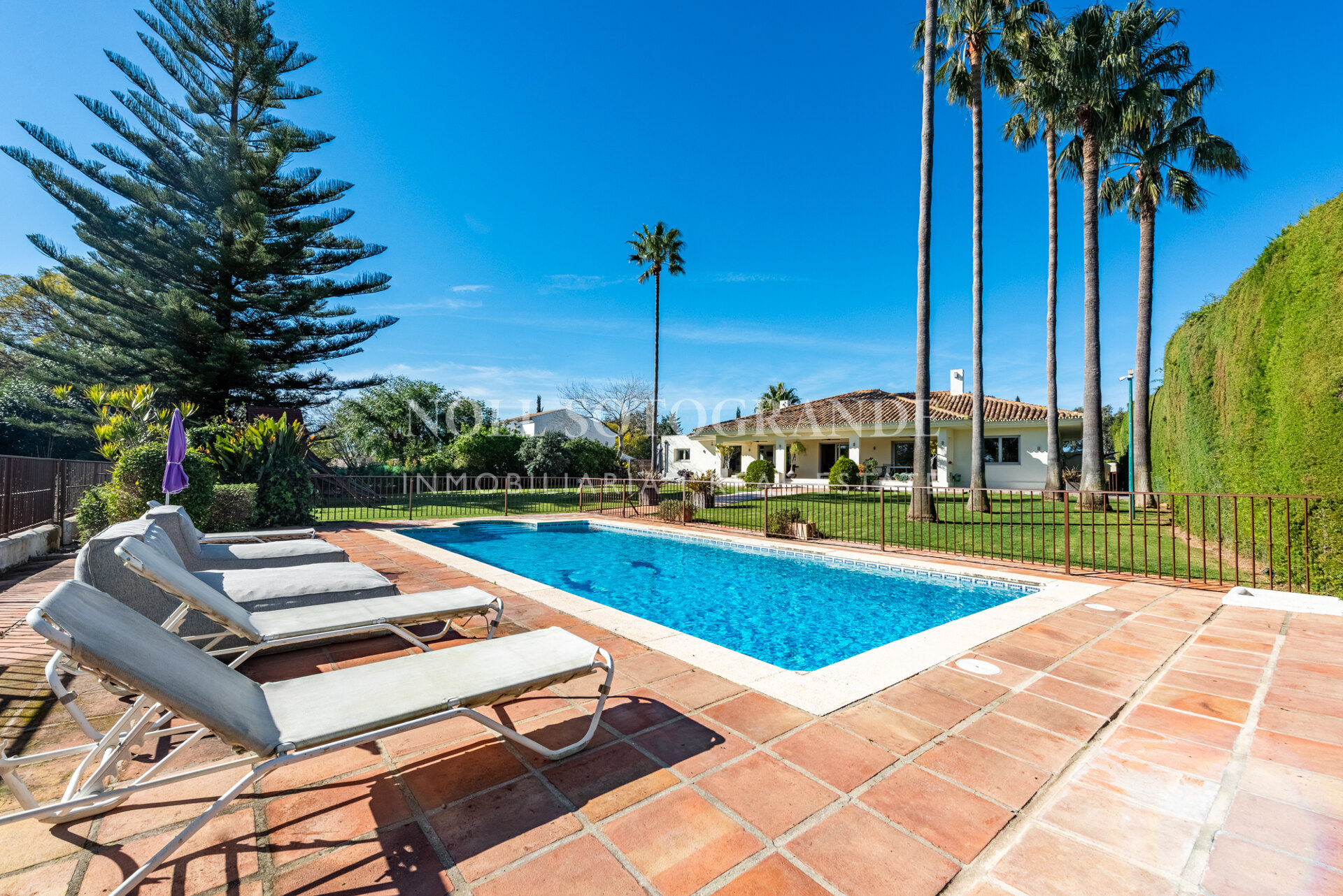 This modern villa is located in the A zone in Sotogrande Costa and is as of now available for long-term rental. The entrance to the villa is over the front garden, which is idyllically planted and very well maintained. On the ground floor of the villa, there is a modern, spacious eat-in kitchen with a dining area, a living room with a gas fireplace, three bedrooms, three bathrooms, and a utility room with a wine fridge and a separate laundry room. From the kitchen and the living area, you get to the spacious covered terrace, where are several sitting areas and a dining area. The very well maintained garden comprises of a fenced swimming pool, a small playground for children, and representative tall palm trees. In the basement of the villa, there is another bedroom with an ensuite bathroom, a work area, and a home cinema. The villa is equipped with central heating, air conditioning, and Fibre-Optic. Garden and pool maintenance are included in the monthly rent.