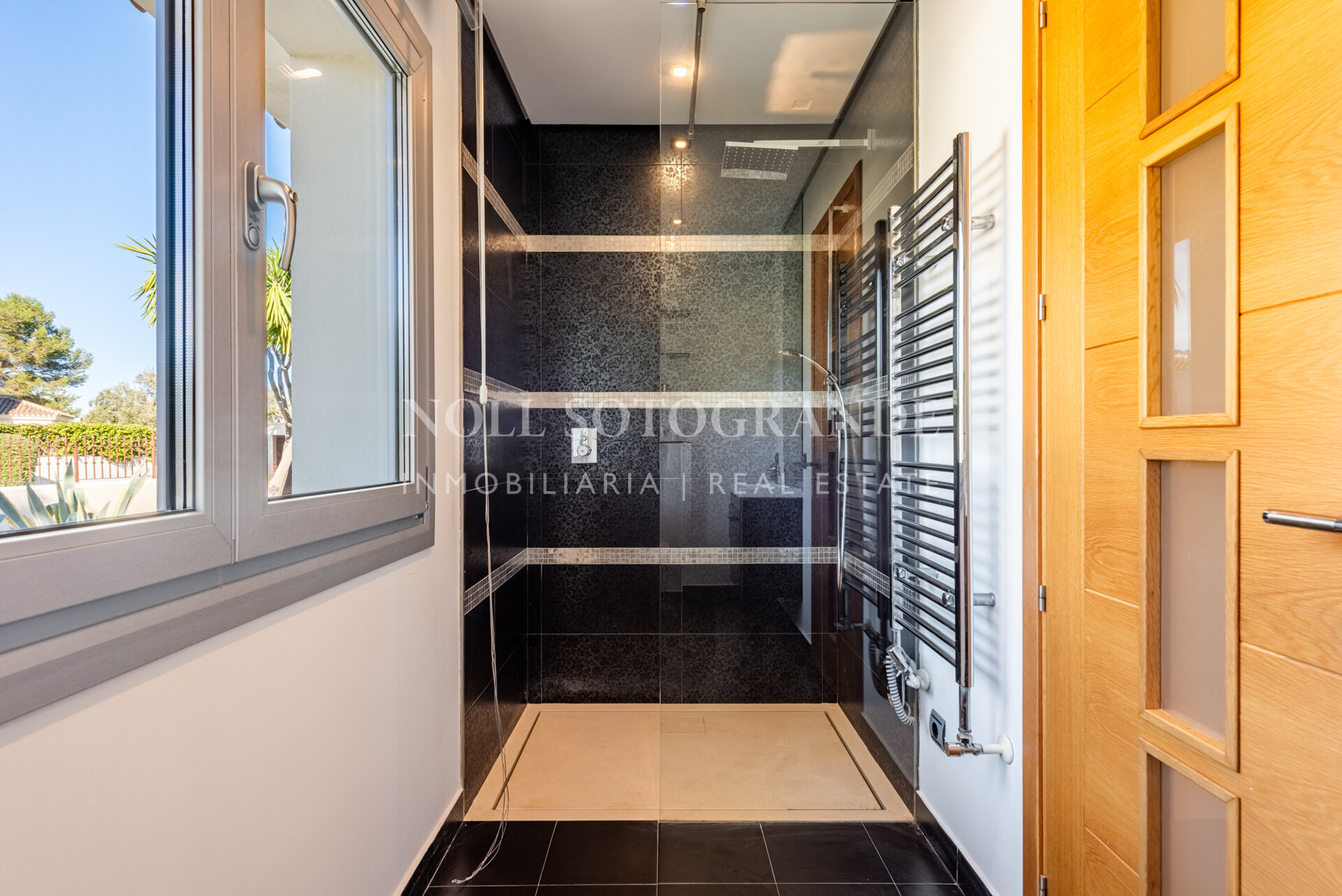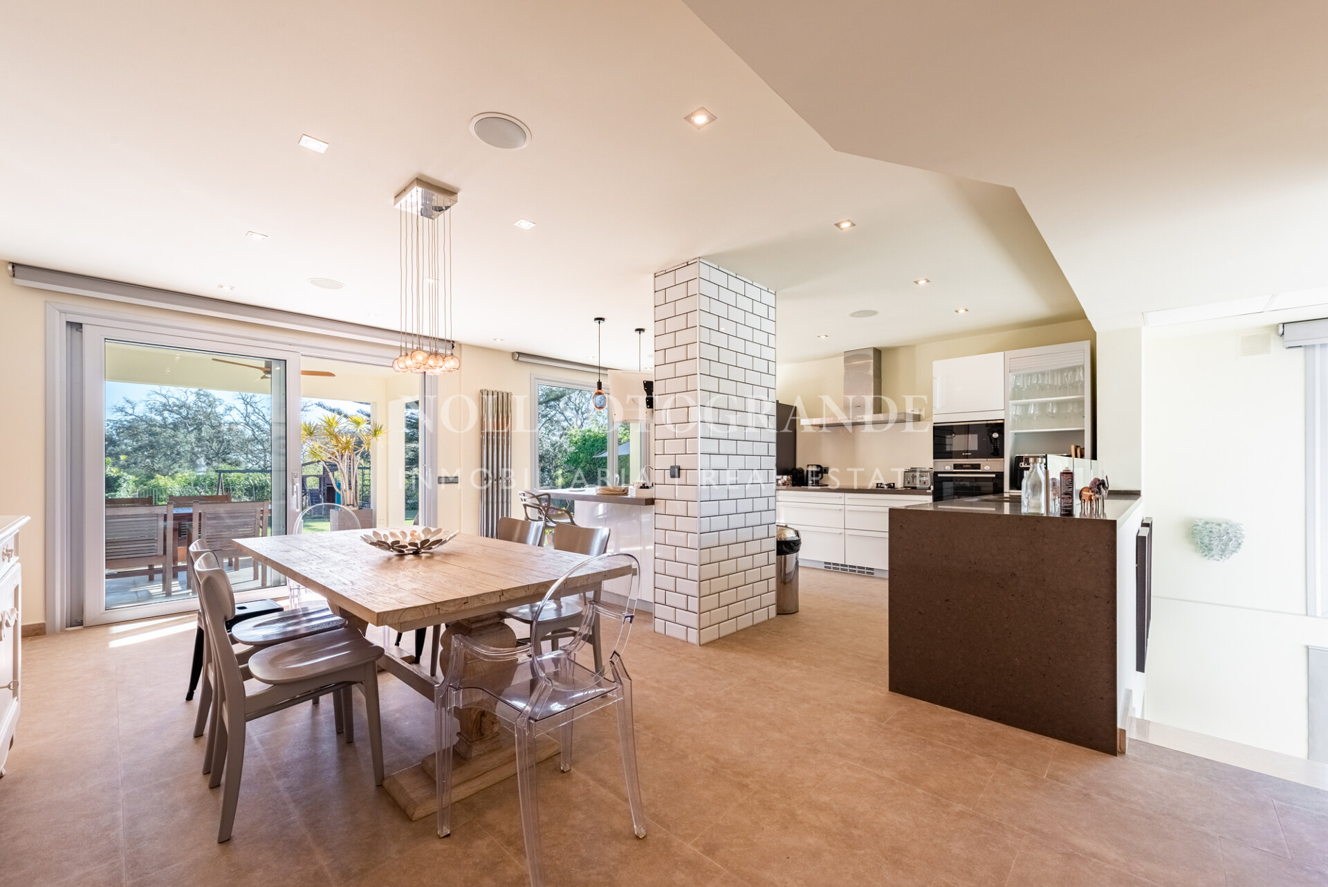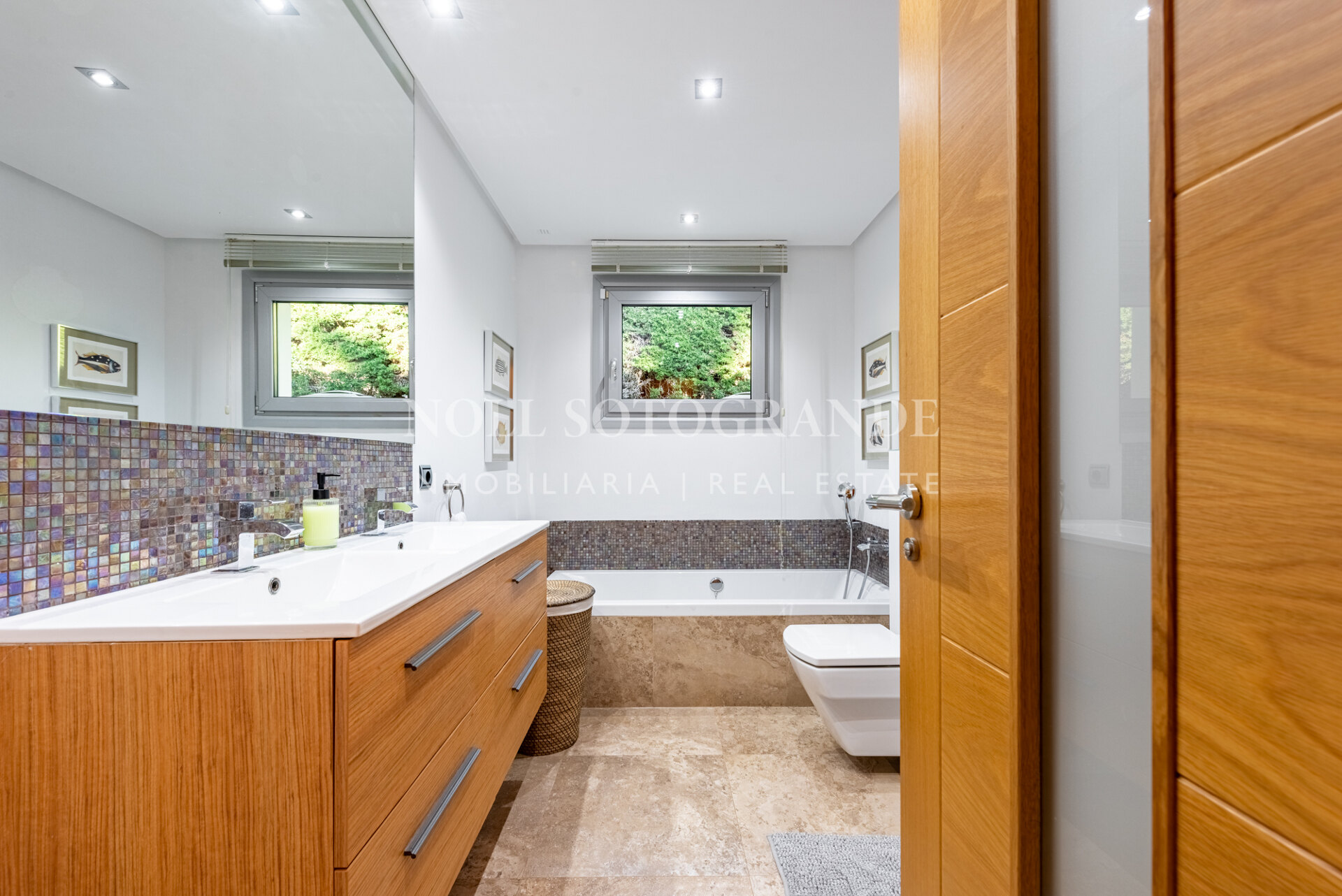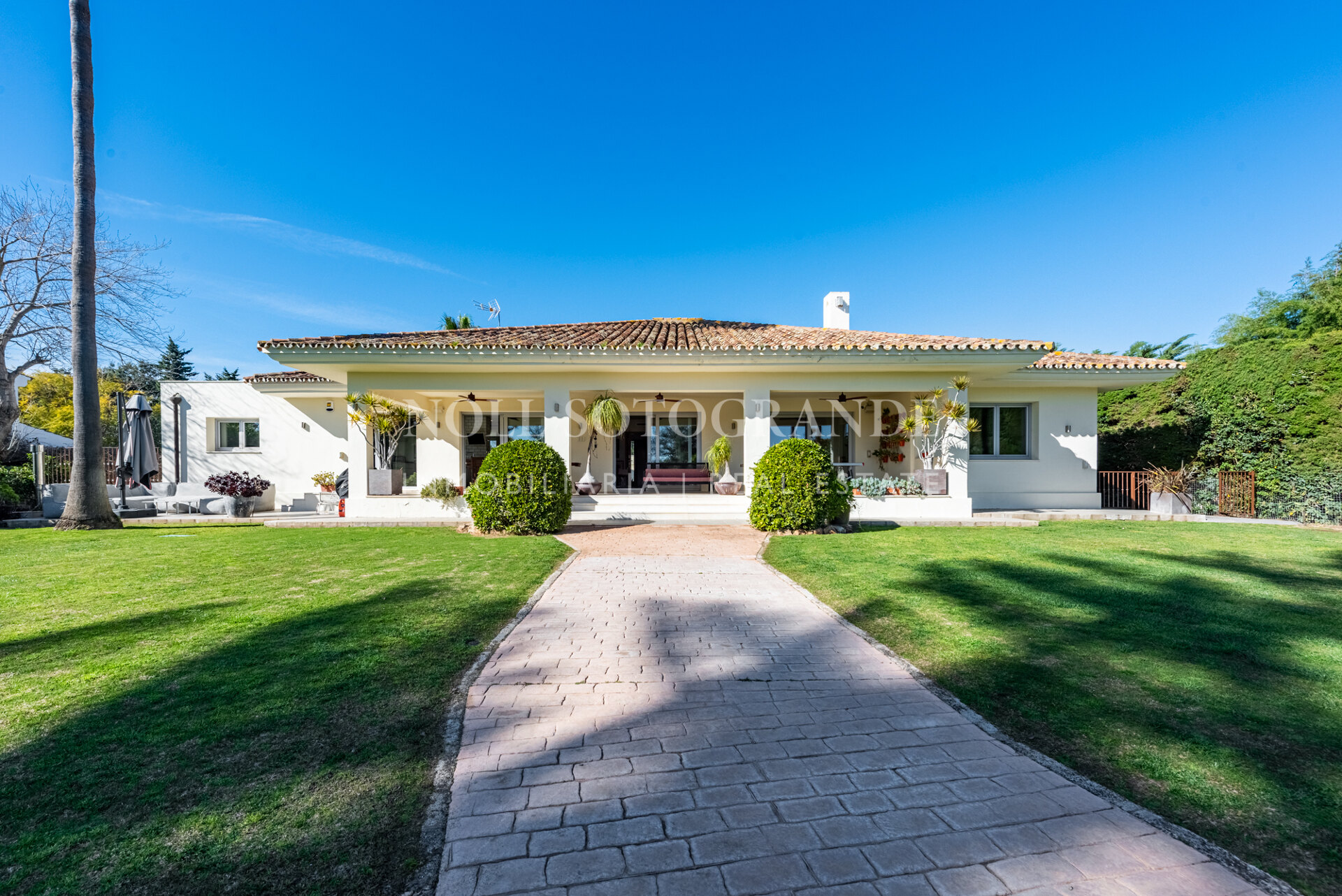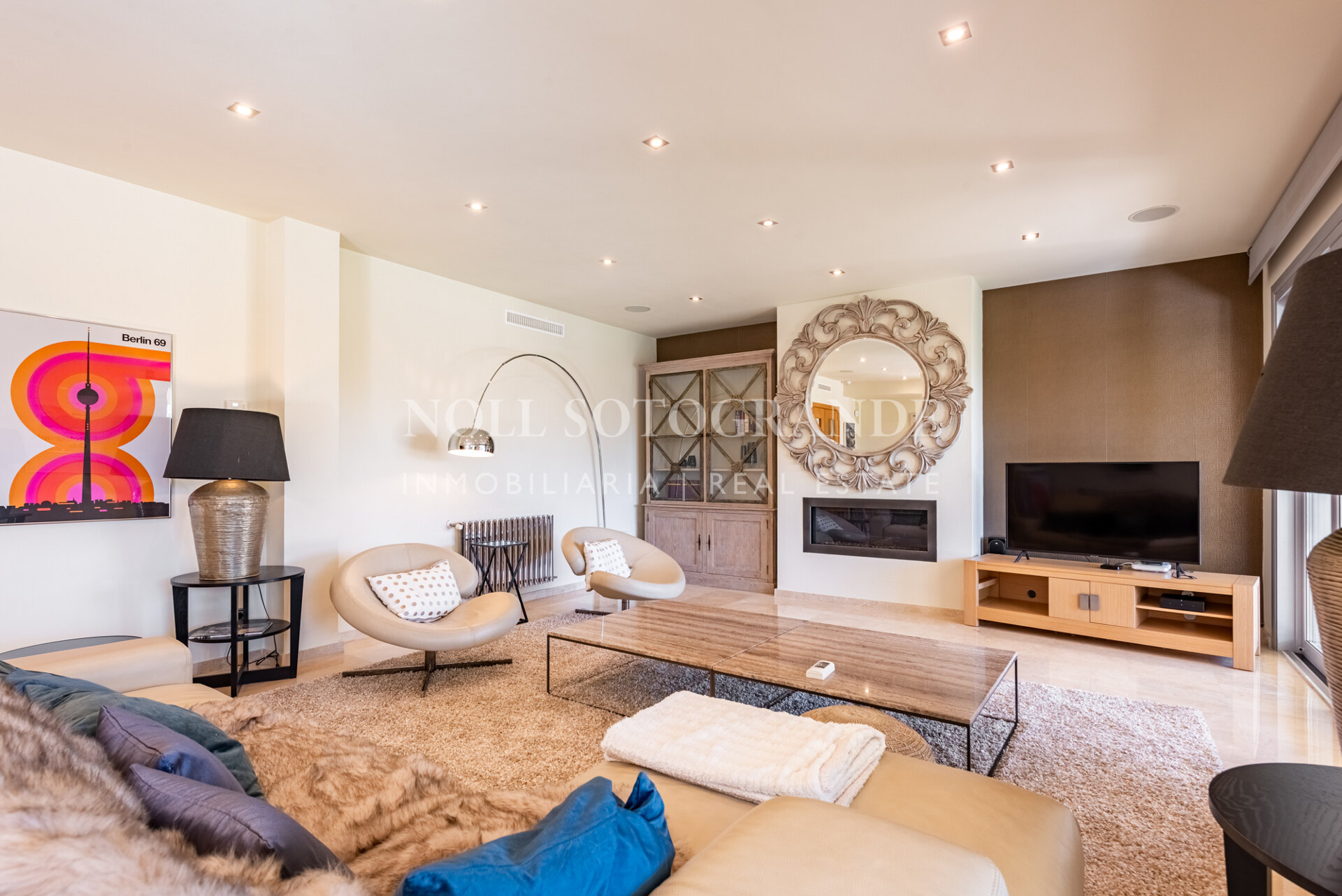 This modern villa is located in the A zone in Sotogrande Costa and is as of now available for long-term rental. The entrance to the villa is over the front garden, which is idyllically planted and very well maintained. On the ground floor of the villa, there is a modern, spacious eat-in kitchen with a dining area, a living room with a gas fireplace, three bedrooms, three bathrooms, and a utility room with a wine fridge and a separate laundry room. From the kitchen and the living area, you get to the spacious covered terrace, where are several sitting areas and a dining area. The very well maintained garden comprises of a fenced swimming pool, a small playground for children, and representative tall palm trees. In the basement of the villa, there is another bedroom with an ensuite bathroom, a work area, and a home cinema. The villa is equipped with central heating, air conditioning, and Fibre-Optic. Garden and pool maintenance are included in the monthly rent.